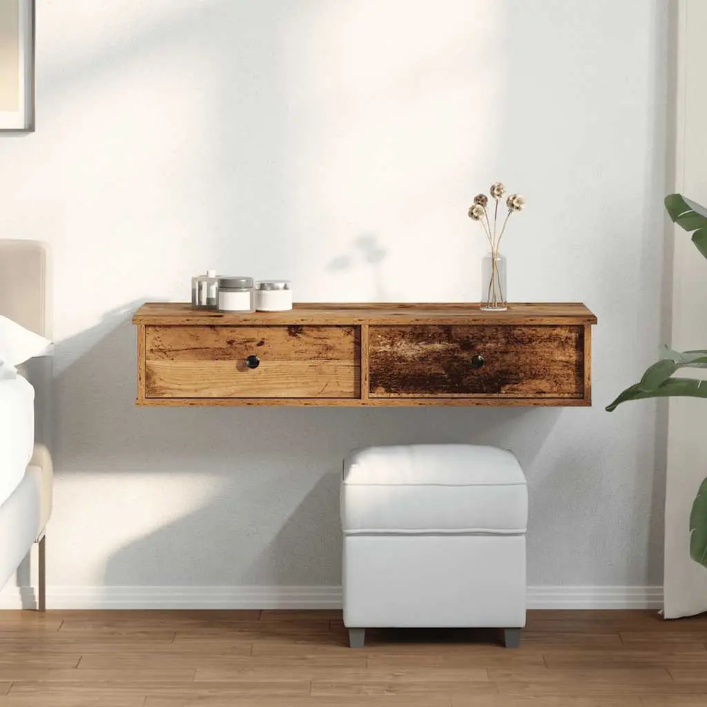 This Wall Shelf with Drawers in Old Wood is a stunning storage piece that mixes style with practicality. With its beautiful old wood finish, it's perfect for sprucing up your living room or bedroom while keeping your everyday items neatly tucked away. Ample Storage: With two roomy drawers and a floating shelf, this wall unit maximizes storage without compromising on style. Keep your necessities organized and close at hand, without cluttering up your floors. Floating Design: The floating shelf adds a modern twist, appearing to float on the wall. It’s not just good-looking; it opens up the space too. Wall-Mountable: Easily attach this shelf to your wall to save valuable floor space – perfect for smaller homes or apartments. It’s solid and holds up to 132.3 lbs with no worries. Durable Material: Crafted from high-quality engineered wood, this shelf has a smooth matte finish that’s moisture-resistant and easy to wipe down. Enjoy a piece that stands the test of time while improving your living space’s usability. Versatile Use: Great for different rooms, this shelf is a fab platform for showing off decorative items, books, or plants, matching your decor while also serving as practical storage.