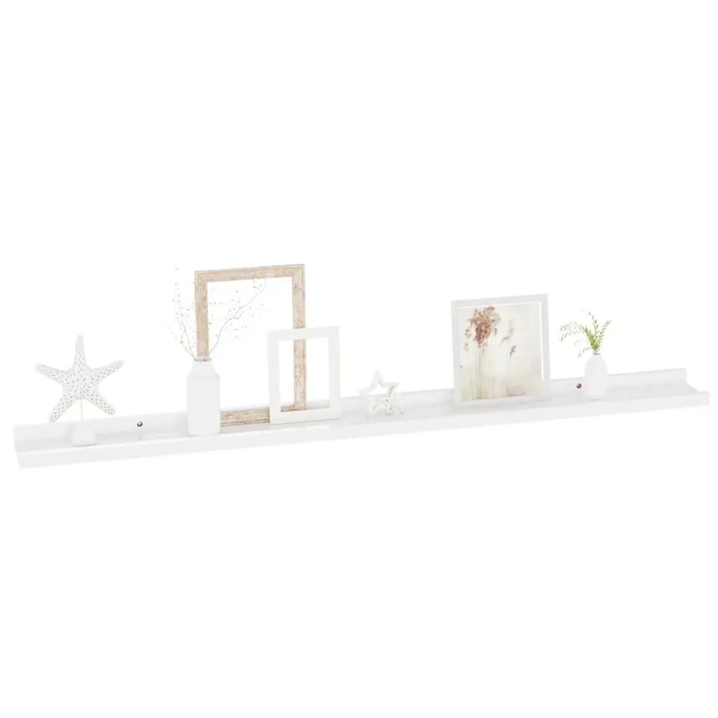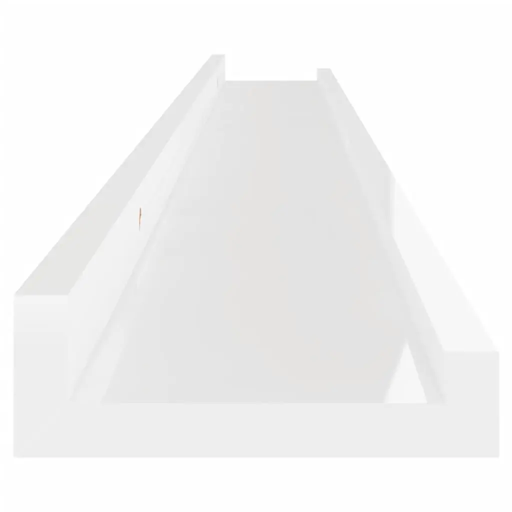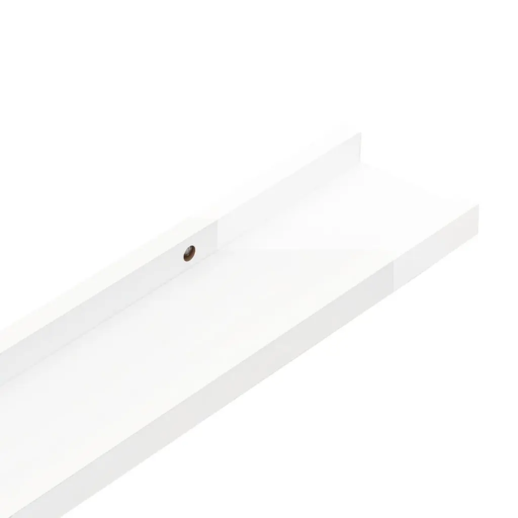 This modern wall shelf set redefines storage and display with its sleek and minimalistic design, perfect for contemporary homes that require both aesthetics and practicality. Ideal for living rooms, this set includes two floating shelves that transform any wall into a chic display area, allowing you to showcase books, decorative pieces, or treasured objects with style while complementing your interior décor seamlessly. High Gloss Finish: The stunning high gloss white finish not only makes these shelves visually appealing but also reflects light, enhancing the brightness of your living space. Floating Design: The shelves mount directly onto the wall with a clean, seamless appearance, eliminating the need for visible brackets and creating an illusion of floating beauty.Versatile Display: Ideal for showcasing a variety of items such as photos, plants, and books, making them perfect for both decorative and functional uses in any room.Effortless Installation: These shelves come with all necessary mounting fixtures (excluding screws or plugs), making setup straightforward so you can quickly enjoy your new storage solutions.Sturdy Construction: Made with durable MDF, these shelves can support a maximum weight of 11 lbs, making them suitable for lightweight items and ensuring longevity in your styling.