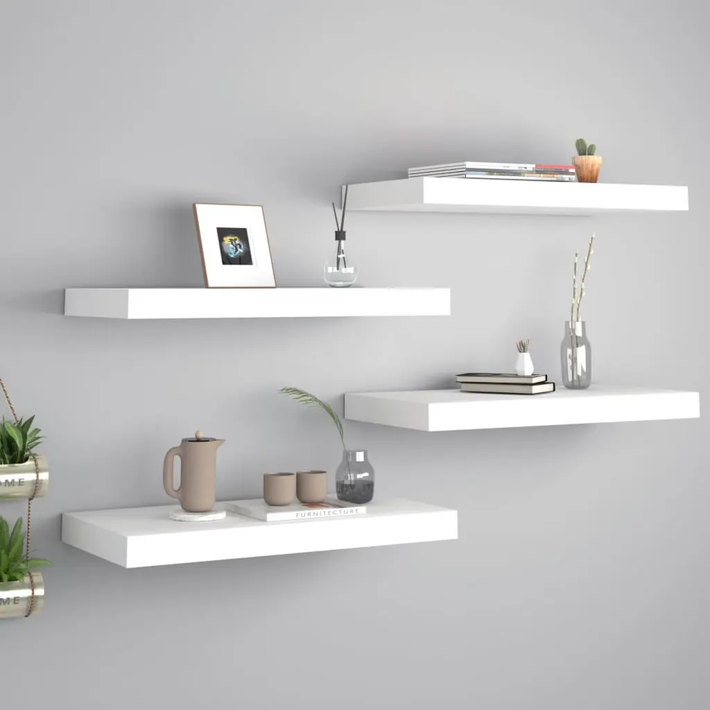 This Floating Wall Shelves set, with its four elegant pieces, transforms your living spaces with a fresh, minimalist look that enhances your interior style. Whether you want to show off your favorite books, display awards, or organize your collectibles, these shelves combine functionality with modern design. The stylish minimalist design enhances any room's look, giving it an elegant vibe that suits modern decor.As a space-saver, these wall shelves help you make the most of floor space while providing plenty of room to display items, perfect for tight areas.Easy installation is guaranteed with included mounting hardware, ensuring a hassle-free setup so you can enjoy your shelves right away.Made from durable MDF, these shelves can hold quite a bit, offering a strong solution for all your storage needs.The sleek finish is not just practical; it’s easy to clean and maintain, keeping things looking tidy for years to come.