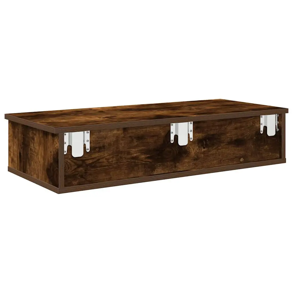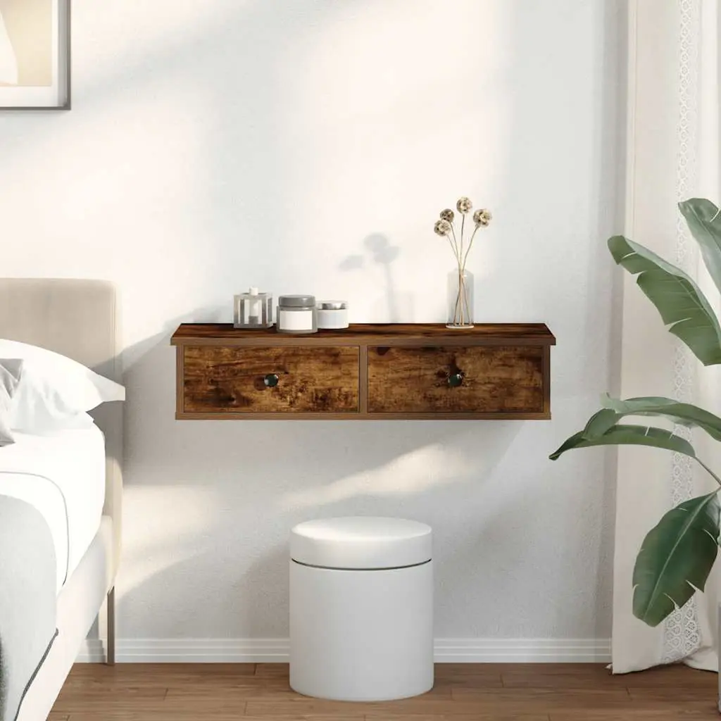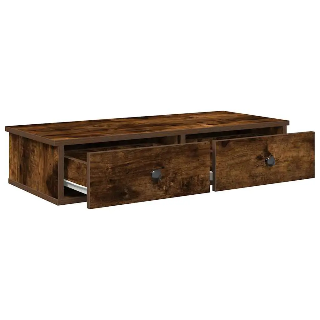 This wall shelf with drawers is the perfect combo of style and practicality, great for today’s living spaces. With its smoked oak finish, it brings warmth to your decor, while giving you a smart way to display photos, decorations, or store your everyday essentials. Floating Design: This clever floating wall shelf not only saves on floor space but also adds a sleek, modern look to any room. No visible brackets keep it looking tidy and minimalist, making it a great addition to contemporary spaces. Ample Storage: With two standard drawers plus a roomy shelf, this unit is practical for keeping your things organized. It's perfect for stashing away clutter while showcasing nice decor on the top shelf. Sturdy Construction: Made from durable engineered wood, this shelf can hold up to 132.3 lbs, keeping your belongings safe and secure. Every part, including the drawers, is built for durability and resilience, great for everyday use. Stylish Finish: The matte finish gives it a polished look that goes with all kinds of interior styles. It not only looks good but is easy to clean, so you can keep it looking smart with minimal effort. Versatile Use: This wall shelf fits perfectly in various rooms from living rooms to bedrooms. Whether for decoration or practical storage, it suits any setting, enhancing both style and efficiency.