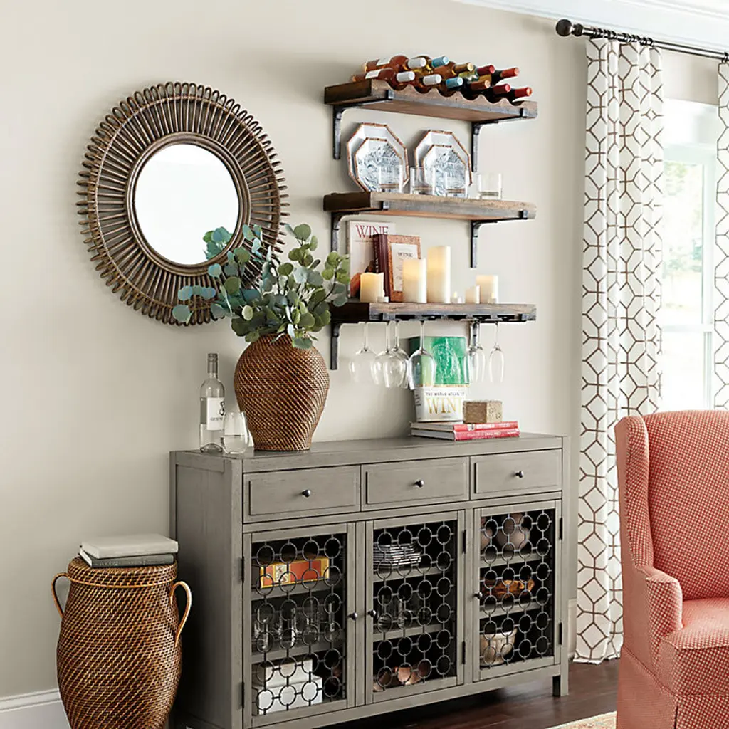 Hang our Vigneto Bar Shelving collection individually or together or any combination to create a wall of storage and display. Each shelf is hand crafted of distressed mango wood. Brackets are hand forged metal for a rustic wine cellar look. Vigneto Shelf features: