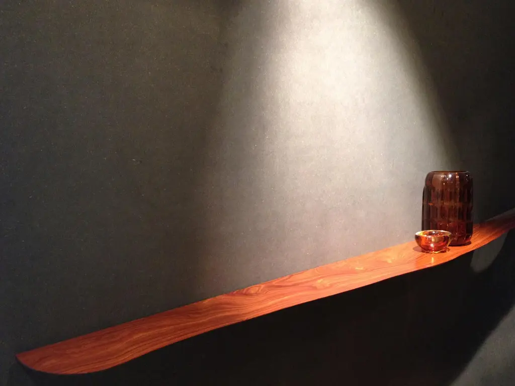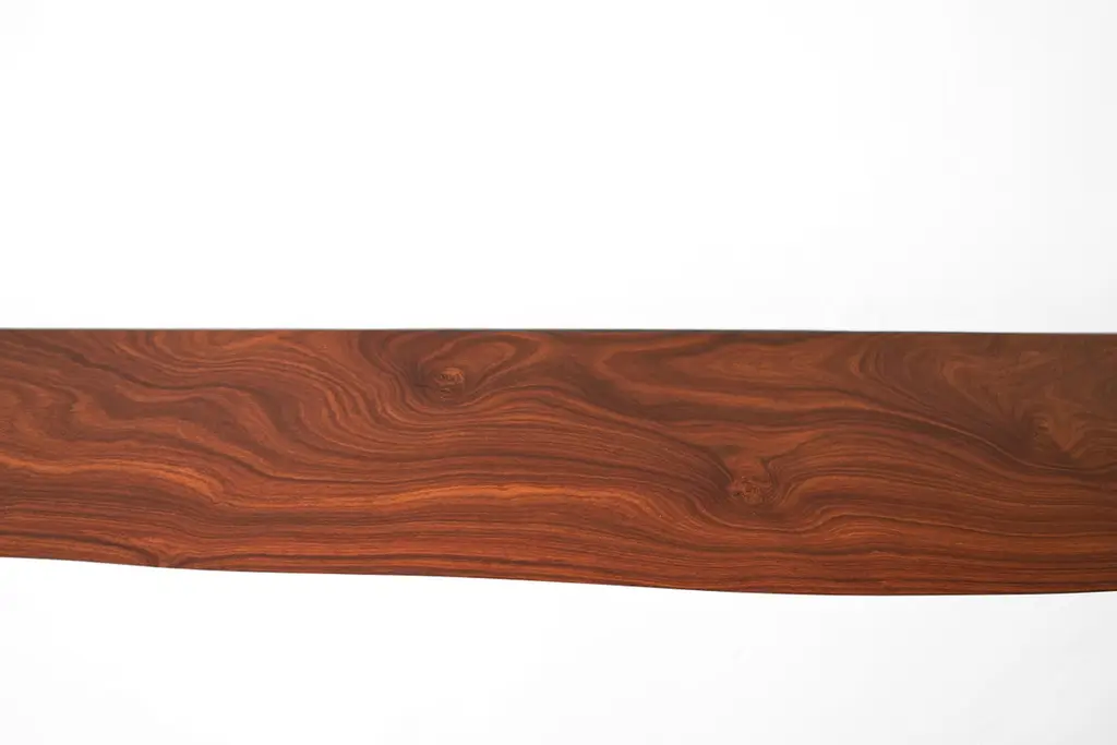 W1032 Wall Hanging Shelf in Pao Rosa Wood by Jörg PietschmannDimensions: D 18 x W 220 x H 3 cm.Materials: Pao Rosa wood.All wall shelves include steel pin holders for discreet mounting. Please contact us.In Pietschmann’s sculptures, trees that for centuries were part of a landscape and founded in primordial forces tell stories inscribed in the memory of their fibers.The forms Jörg Pietschmann pares from ancient trees are extensive and astonish with their physical presence, a combination of elegance and primeval nature. Pietschmann’s sculptures are monuments to the trees from which they derive.Being endowed with the ruggedness of primeval matter gives them a veritable vitality: figures that appear to have grown into their sculptural form of their own accord. But Pietschmann’s tangibly present bodies have undergone a considerable degree of metamorphosis.In order to generate these unique tree specimens he examines the tree’s morphology and intrinsic inner map until the courses of its grain, of a curve, knots and cracks concur with his projections. The exploratory process is accompanied by constant modification, giving at the start of each new piece no more than an intimation of the figure that will later emerge. In their completion, Pietschmann’s sculptures once more become universal form.Jörg Pietschmann`s workshop is situated on the countryside close to Hamburg. He works with indigenous timber as oak, lime tree, beech, poplar, olive tree and maple felled by the wind or human hand, together with tropical timber found on his travels.