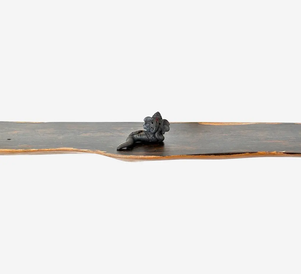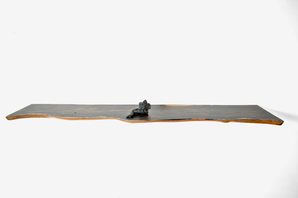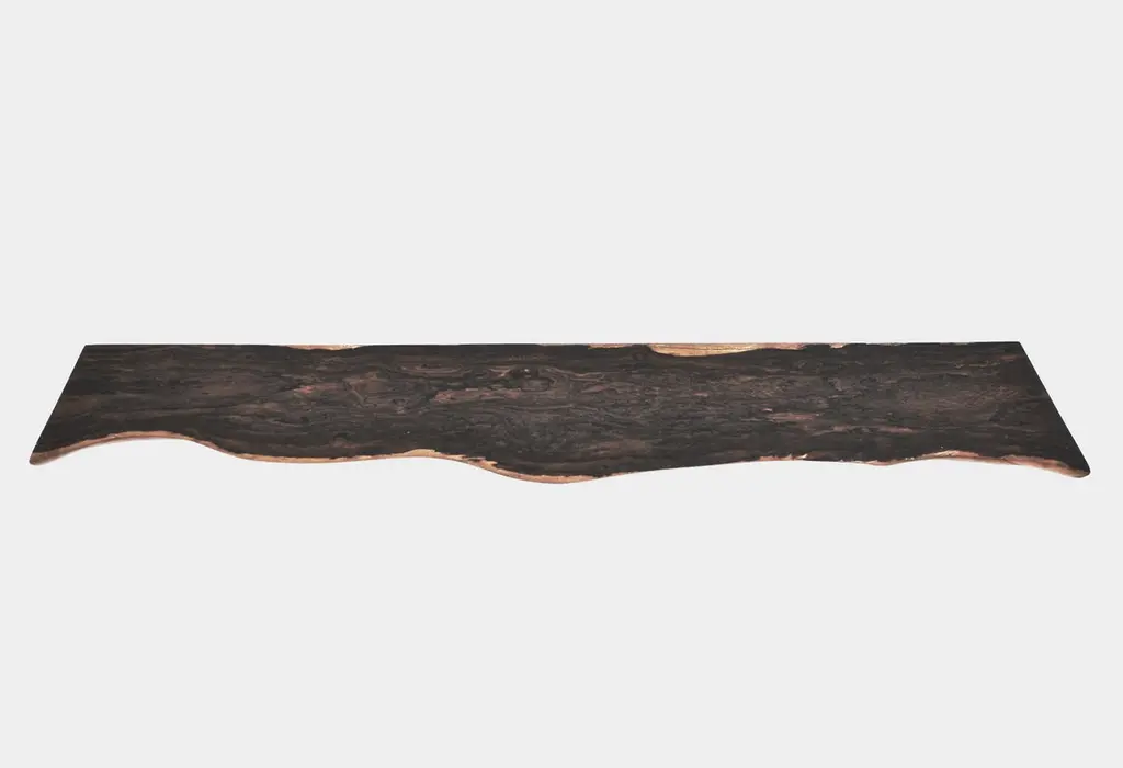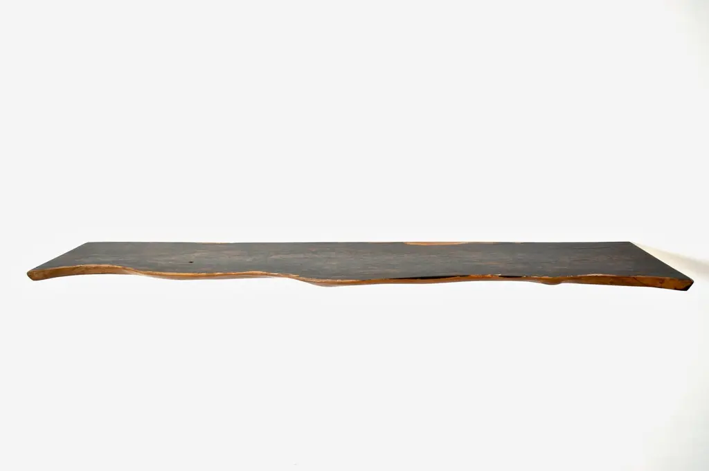 W1224 Wall Hanging Shelf in Zirikote Dark Wood by Jörg PietschmannDimensions: D 22 x W 126 x H 2,5 cm.Materials: Zirikote wood.In Pietschmann’s sculptures, trees that for centuries were part of a landscape and founded in primordial forces tell stories inscribed in the memory of their fibers.The forms Jörg Pietschmann pares from ancient trees are extensive and astonish with their physical presence, a combination of elegance and primeval nature. Pietschmann’s sculptures are monuments to the trees from which they derive.Being endowed with the ruggedness of primeval matter gives them a veritable vitality: figures that appear to have grown into their sculptural form of their own accord. But Pietschmann’s tangibly present bodies have undergone a considerable degree of metamorphosis.In order to generate these unique tree specimens he examines the tree’s morphology and intrinsic inner map until the courses of its grain, of a curve, knots and cracks concur with his projections. The exploratory process is accompanied by constant modification, giving at the start of each new piece no more than an intimation of the figure that will later emerge. In their completion, Pietschmann’s sculptures once more become universal form.Jörg Pietschmann`s workshop is situated on the countryside close to Hamburg. He works with indigenous timber as oak, lime tree, beech, poplar, olive tree and maple felled by the wind or human hand, together with tropical timber found on his travels.