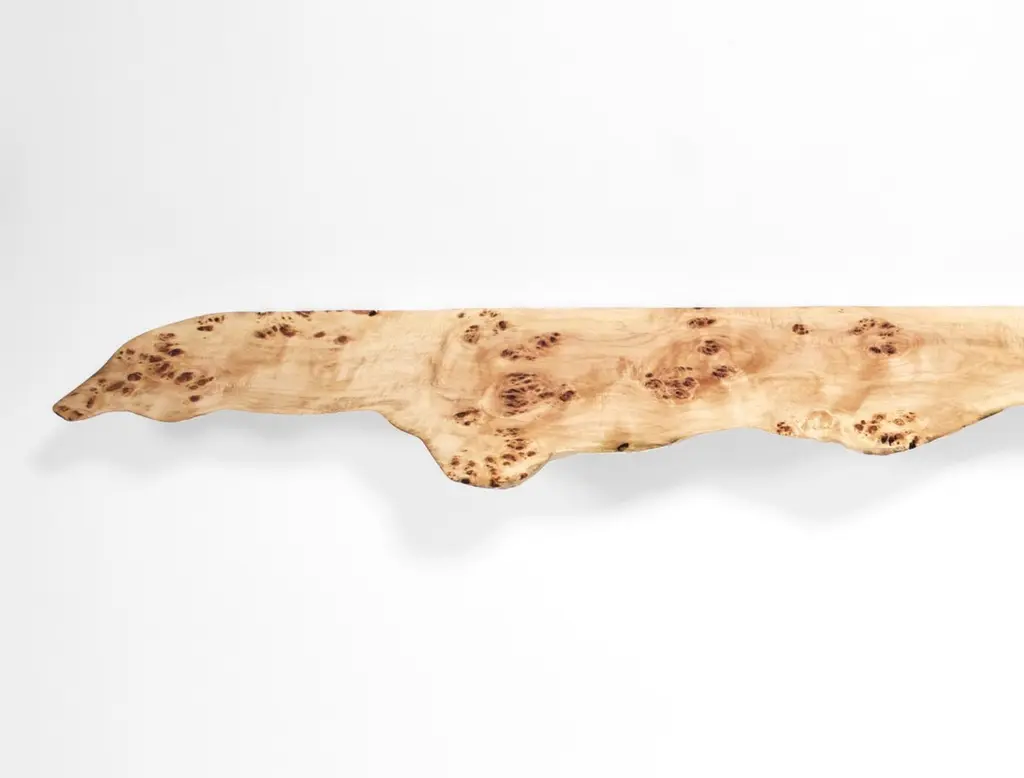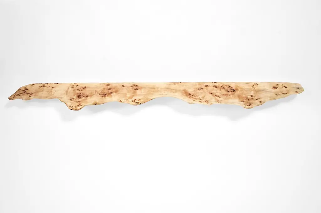 W1264 Wall Hanging Shelf in Poplar Burl Wood by Jörg PietschmannDimensions: D 27 x W 208 x H 4 cm.Materials: Poplar burl wood.All wall shelves include steel pin holders for discreet mounting. Please contact us.In Pietschmann’s sculptures, trees that for centuries were part of a landscape and founded in primordial forces tell stories inscribed in the memory of their fibers.The forms Jörg Pietschmann pares from ancient trees are extensive and astonish with their physical presence, a combination of elegance and primeval nature. Pietschmann’s sculptures are monuments to the trees from which they derive.Being endowed with the ruggedness of primeval matter gives them a veritable vitality: figures that appear to have grown into their sculptural form of their own accord. But Pietschmann’s tangibly present bodies have undergone a considerable degree of metamorphosis.In order to generate these unique tree specimens he examines the tree’s morphology and intrinsic inner map until the courses of its grain, of a curve, knots and cracks concur with his projections. The exploratory process is accompanied by constant modification, giving at the start of each new piece no more than an intimation of the figure that will later emerge. In their completion, Pietschmann’s sculptures once more become universal form.Jörg Pietschmann`s workshop is situated on the countryside close to Hamburg. He works with indigenous timber as oak, lime tree, beech, poplar, olive tree and maple felled by the wind or human hand, together with tropical timber found on his travels.