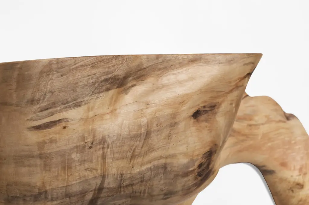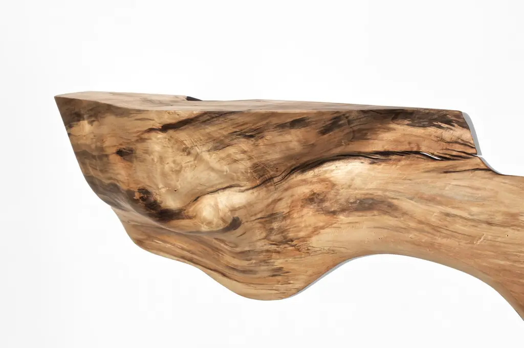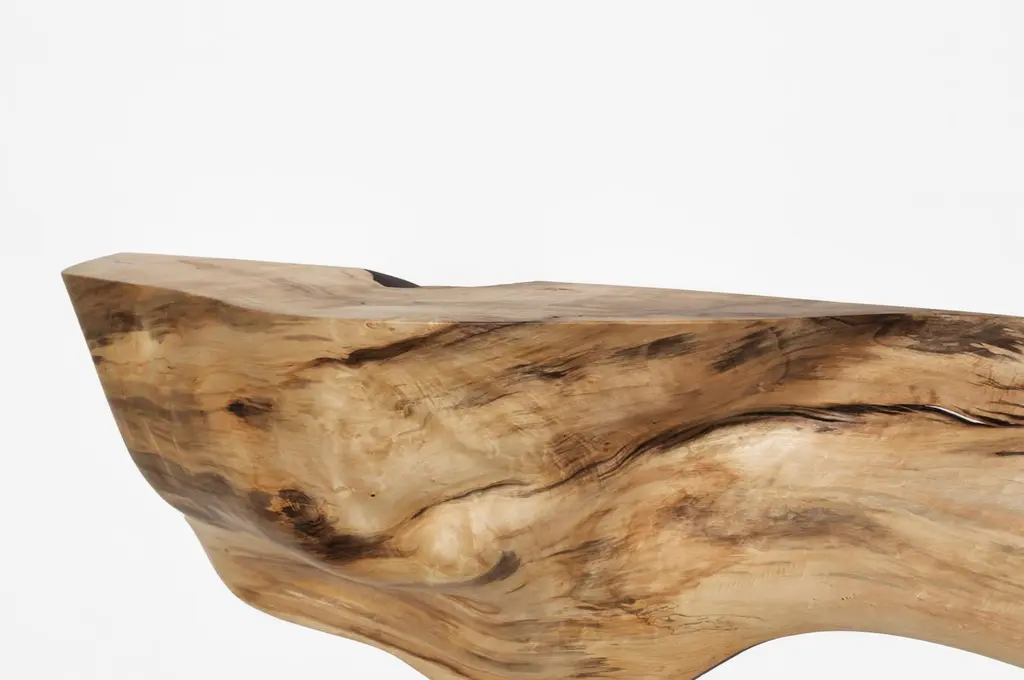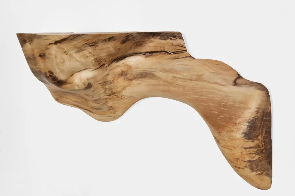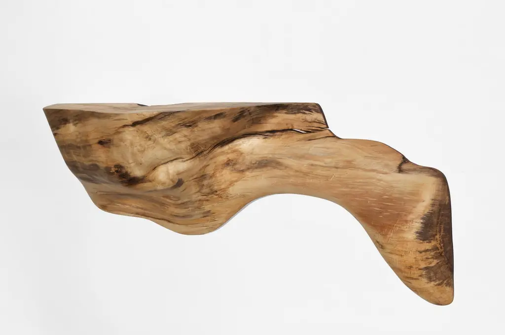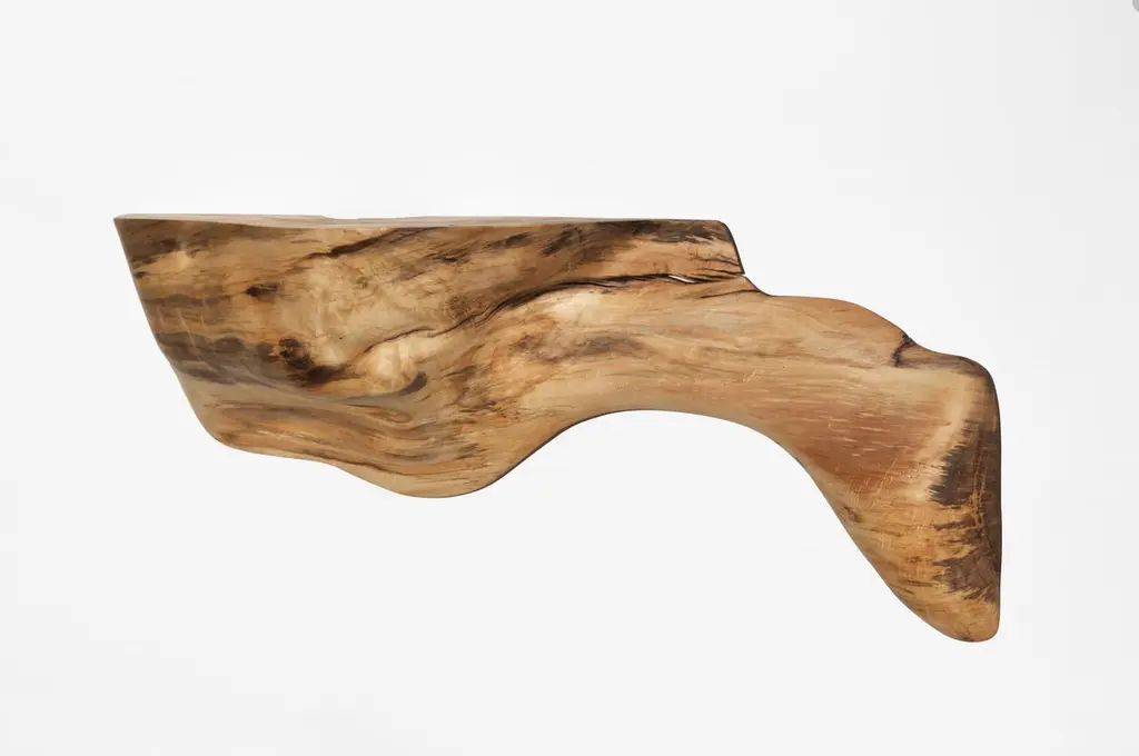 W2290 Wall Hanging Shelf in Natural Poplar Wood by Jörg PietschmannDimensions: D 28 x W 140 x H 60 cm.Materials: Poplar wood.In Pietschmann’s sculptures, trees that for centuries were part of a landscape and founded in primordial forces tell stories inscribed in the memory of their fibers.The forms Jörg Pietschmann pares from ancient trees are extensive and astonish with their physical presence, a combination of elegance and primeval nature. Pietschmann’s sculptures are monuments to the trees from which they derive.Being endowed with the ruggedness of primeval matter gives them a veritable vitality: figures that appear to have grown into their sculptural form of their own accord. But Pietschmann’s tangibly present bodies have undergone a considerable degree of metamorphosis.In order to generate these unique tree specimens he examines the tree’s morphology and intrinsic inner map until the courses of its grain, of a curve, knots and cracks concur with his projections. The exploratory process is accompanied by constant modification, giving at the start of each new piece no more than an intimation of the figure that will later emerge. In their completion, Pietschmann’s sculptures once more become universal form.Jörg Pietschmann`s workshop is situated on the countryside close to Hamburg. He works with indigenous timber as oak, lime tree, beech, poplar, olive tree and maple felled by the wind or human hand, together with tropical timber found on his travels.