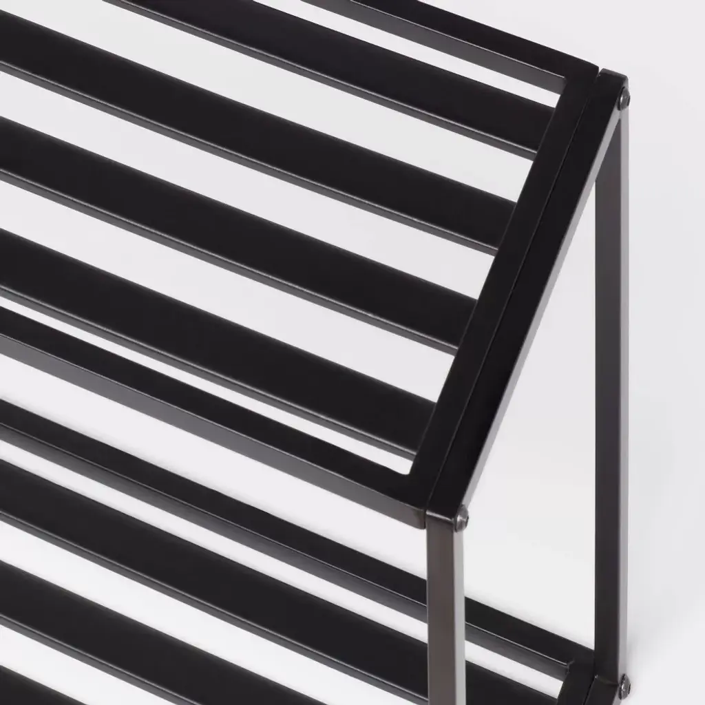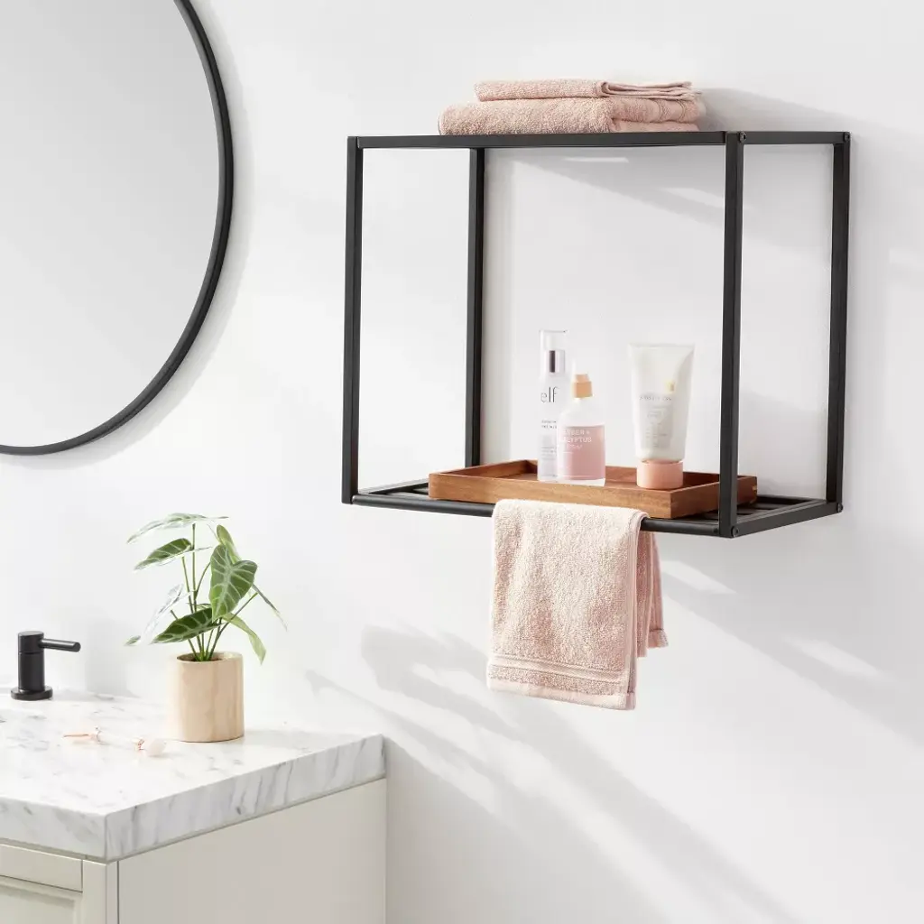 Add extra storage into any bathroom with limited floor space with this Wall Shelf from Brightroom™. This wall mount storage rack features a two-tiered design in a black metal rust-resistant finish for classic style that coordinates with any decor. The open structure designed with two slatted shelves provide ample space to store and display towels, potted plants, bath items, toiletries and more in one place. Pair with other pieces in the same collection to complete the cohesive look.Brightroom™: See your space in a new light.