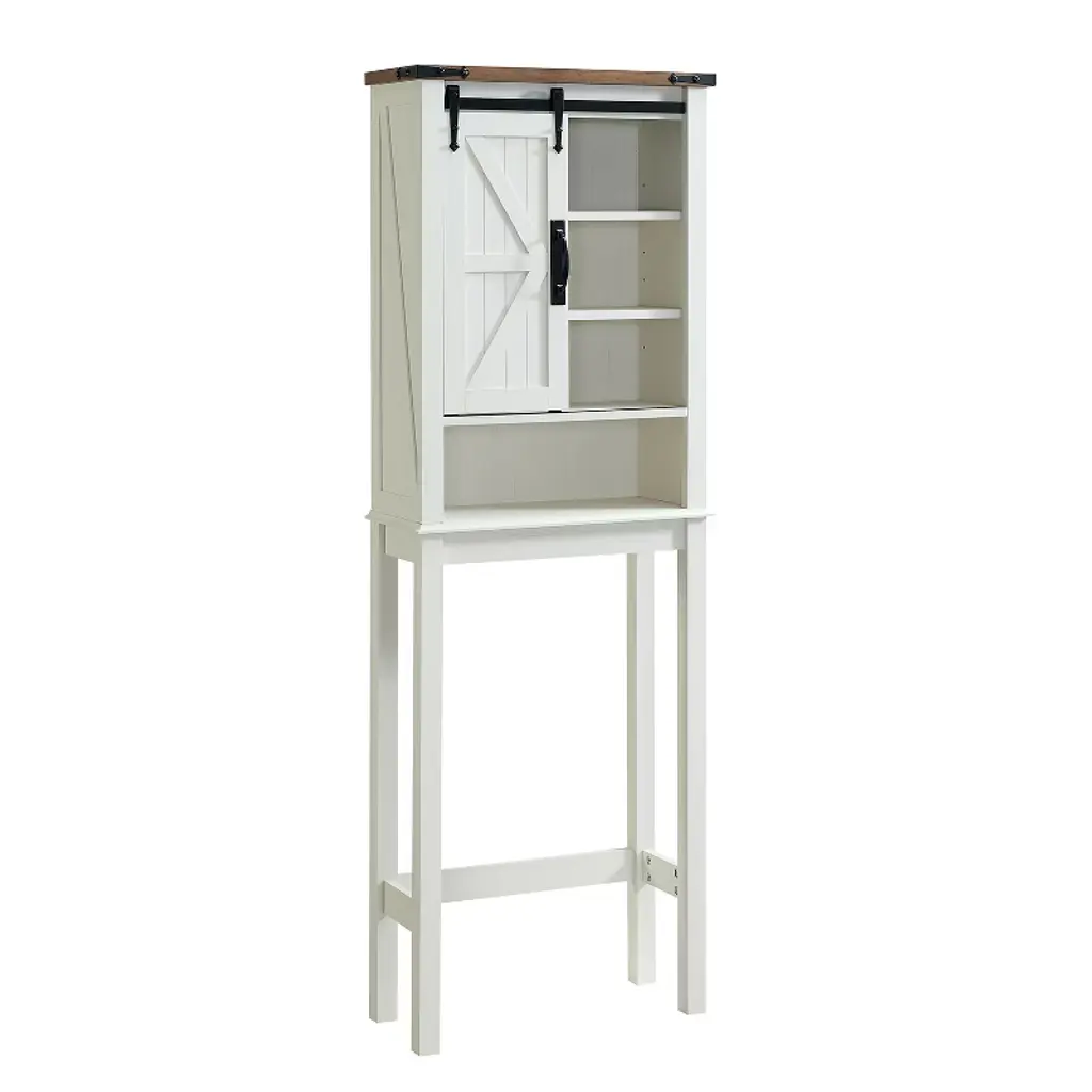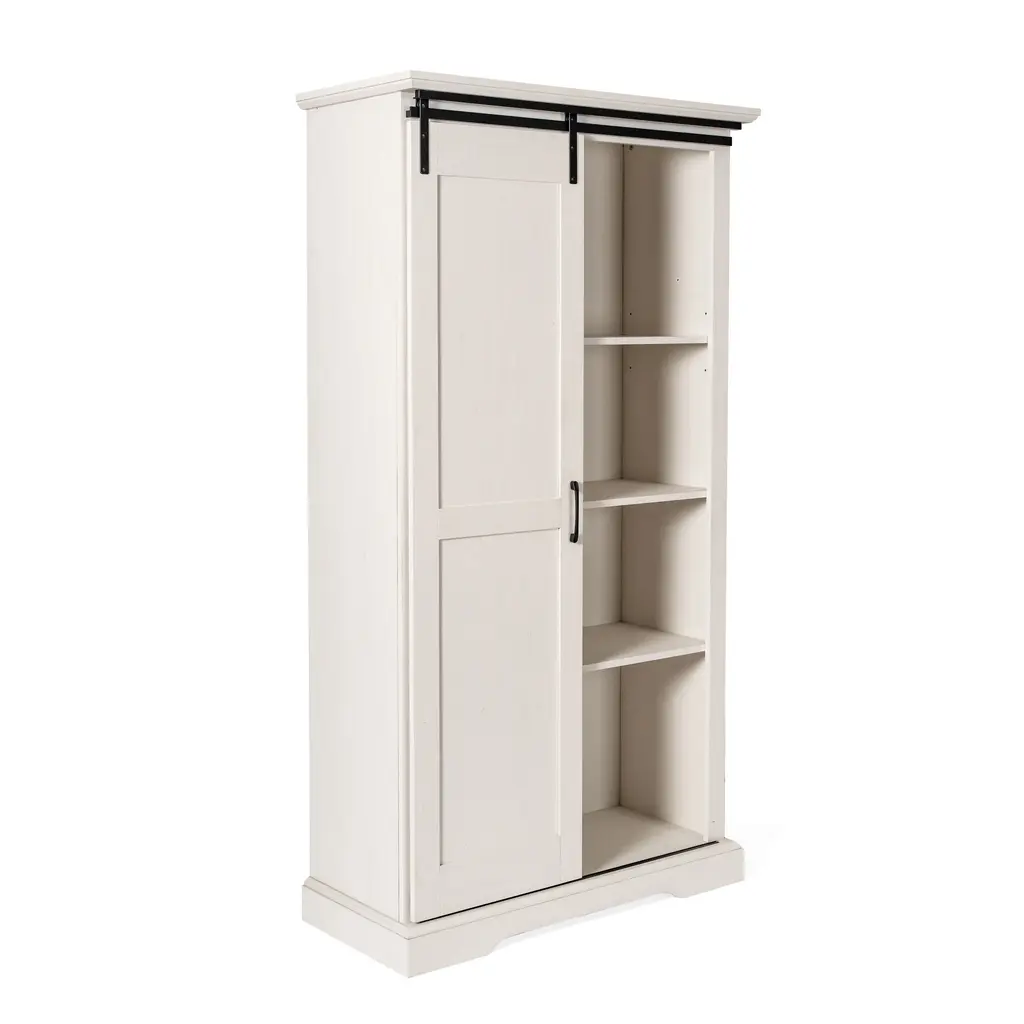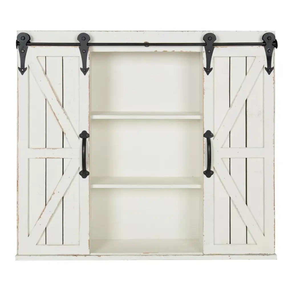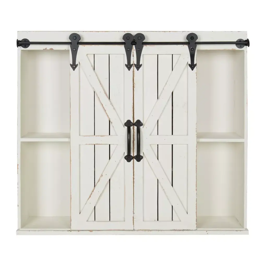 Decorate your home in vintage farmhouse style with these unique hanging wall shelves with sliding barn doors. These shelves can be used to organize your entryway, mudroom, kitchen, bathroom, living room, or guest room. This box shelf has three inner shelves and each side has two shelves to store items of different shapes and sizes. The two barn doors slide to cover either the sides or the center. The three center shelves are each 13.5 inches wide, 5.75 inches deep, and there is 8 inches of height between shelves. The side cubbies are each 7.75 inches wide, 5.75 inches deep, and have 12 inches of height between the two shelves. The outer dimensions of this wall shelving unit are 30 inches wide, 27.25 inches high, and 7.25 inches deep. Two metal Z-bracket hangers are inset on the back of the cabinet for easy secure wall display. This wall cabinet arrives completely assembled ready to use.