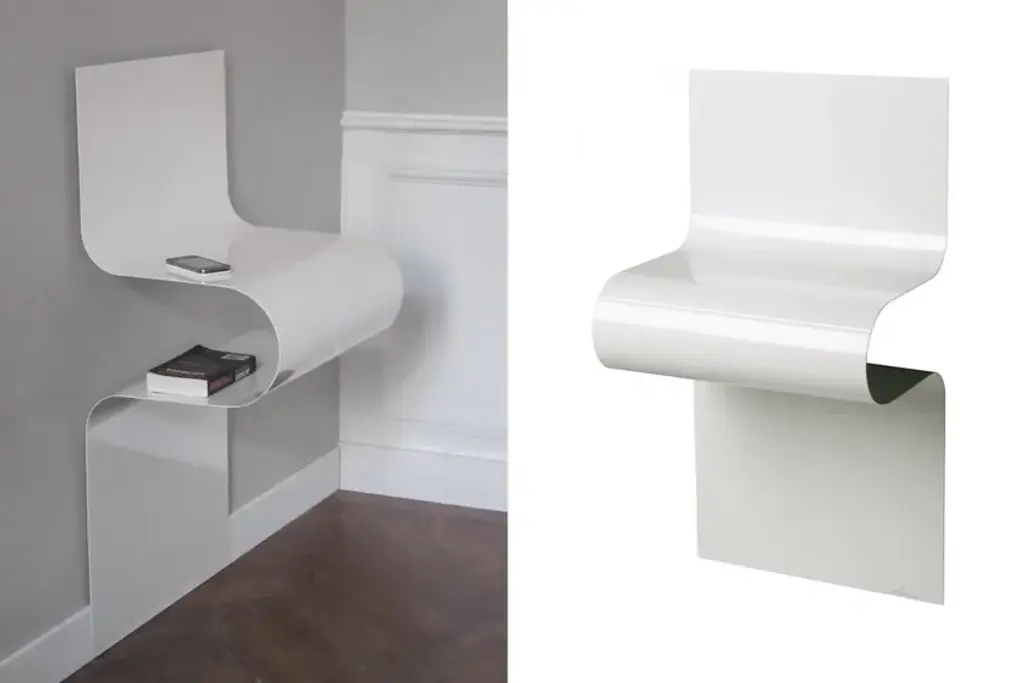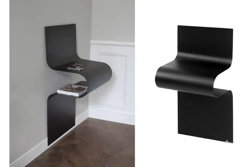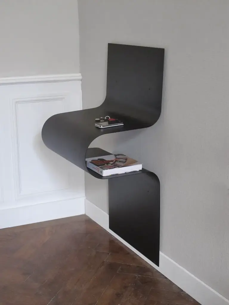 Bookshelf, low table, bedside or small furniture. The famous range of shelves is in powder-coated aluminium or olded varnish, also available customized, in all colours. The company VIDAME has built his own bending machine to get that shape because manufacturers could not. Waves are studied to receive objects, books,lights, above or inside, which offers a hiding game. They are much functional (strong) because there's a lot of space, and a flat surface to avoid objects to slide, as we can expect. Entirely pured, they bring out the impression of movement in a room. It's extremely simple, the putting up is made in 15min with its movable racks, become invisibles and peel off the wall 1cm this waved line.The range is studied to be stacked, the bookshelf above the small one goes from the floor to a standard ceiling high. This product works well for interior designers who wish to fill a wall with a deep and forceful concept, and functional too. Bookshelf, low table, bedside or small furniture. Range of shelves in powder-coated aluminium or silver aluminium, also available customized, in all colours.Julien Vidame has built his own bending machine to get that shape because manufacturers could not. Waves are studied to receive objects, books, lights, above or inside, which offers a hiding game. They are much functional (strong) because there's a lot of space, and a flat surface to avoid objects to slide, as we can expect. Entirely pured, they bring out the impression of movement in a room. It's extremely simple, the setting up is made in 15min with its movable racks, become invisibles and peel off the wall 1cm this waved line.The range is studied to be stacked, the bookshelf above the small one goes from the floor to a standard ceiling high. This product works well for interior designers who wish to fill a wall with a deep and forceful concept, and functional too.