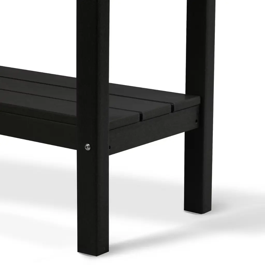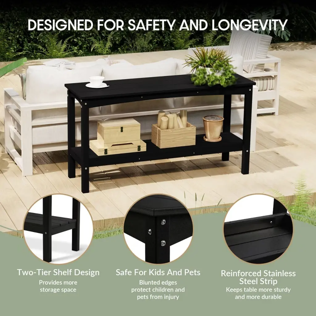 Elevate your outdoor ambiance with this resilient 2-tier console table meticulously crafted from durable HDPE materials. Engineered with reinforced legs for enhanced stability and fortified with UV and Fade Resistance, as well as Weather Resistance, it stands as an exemplary choice for your patio or backyard oasis. Beyond its functional appeal, this table embodies versatility, gracefully adorning your entryway while providing ample space for showcasing decor or accommodating beverages during al fresco gatherings. With its generous shelf storage, it effortlessly organizes hand towels and essentials, catering to both indoor and outdoor requirements.While we strive to accurately represent product colors, please be aware that actual colors may vary slightly due to individual screen settings and lighting conditions. FeaturesCrafted from HDPE material with 304 stainless steel hardwareResilient against scratches and all weather conditionsStain-resistant surfaceWater-resistant constructionUV and fade-resistant material and colorsDesigned with smooth edges for safetySimple to assembleDetails:Product Type: Outdoor Console TablesWhat's Included: (1) Console TableConsole TableDimensions: 55" W x 16.75" D x 29" HWeight: 66.5 lbs.Weight Capacity: 300 lbs.