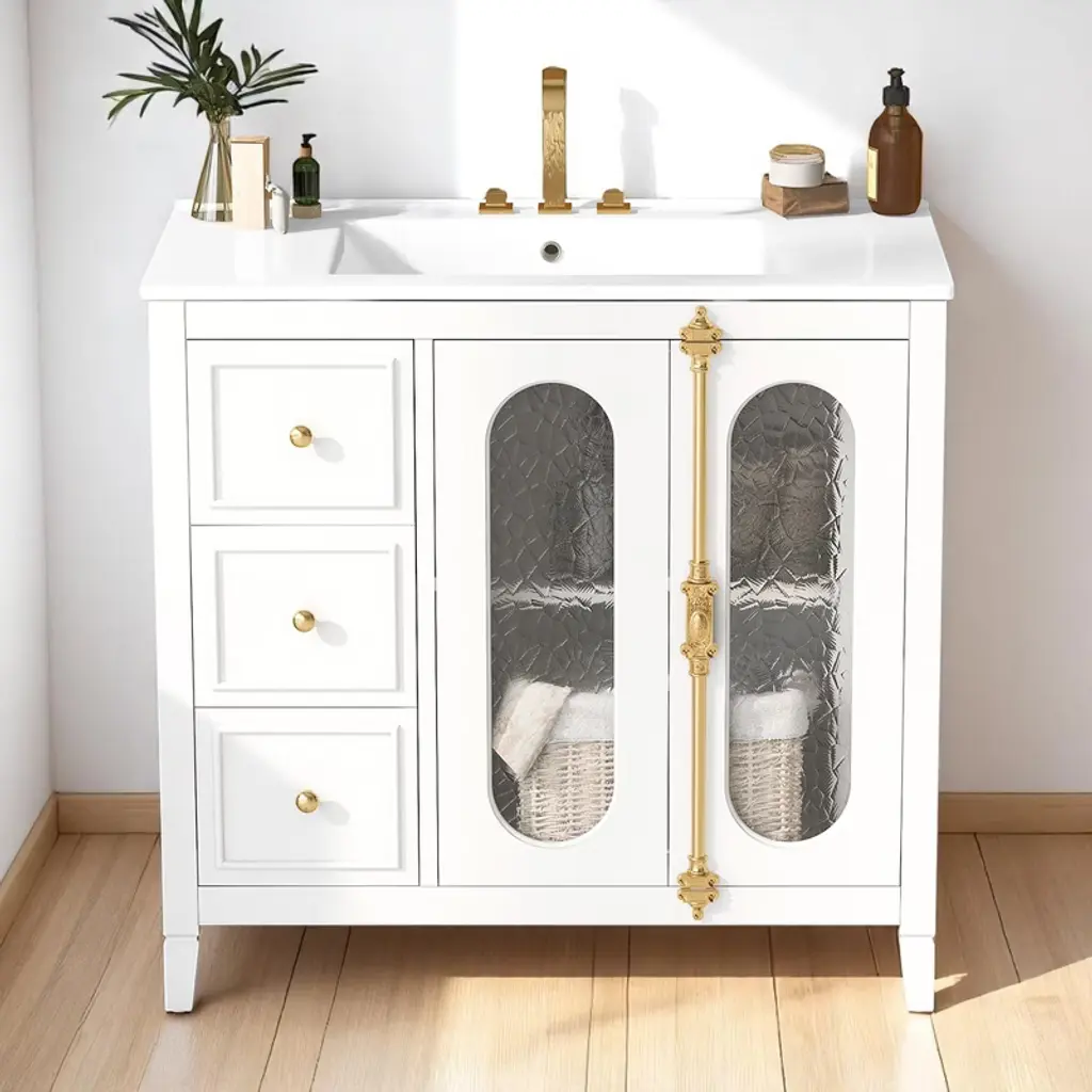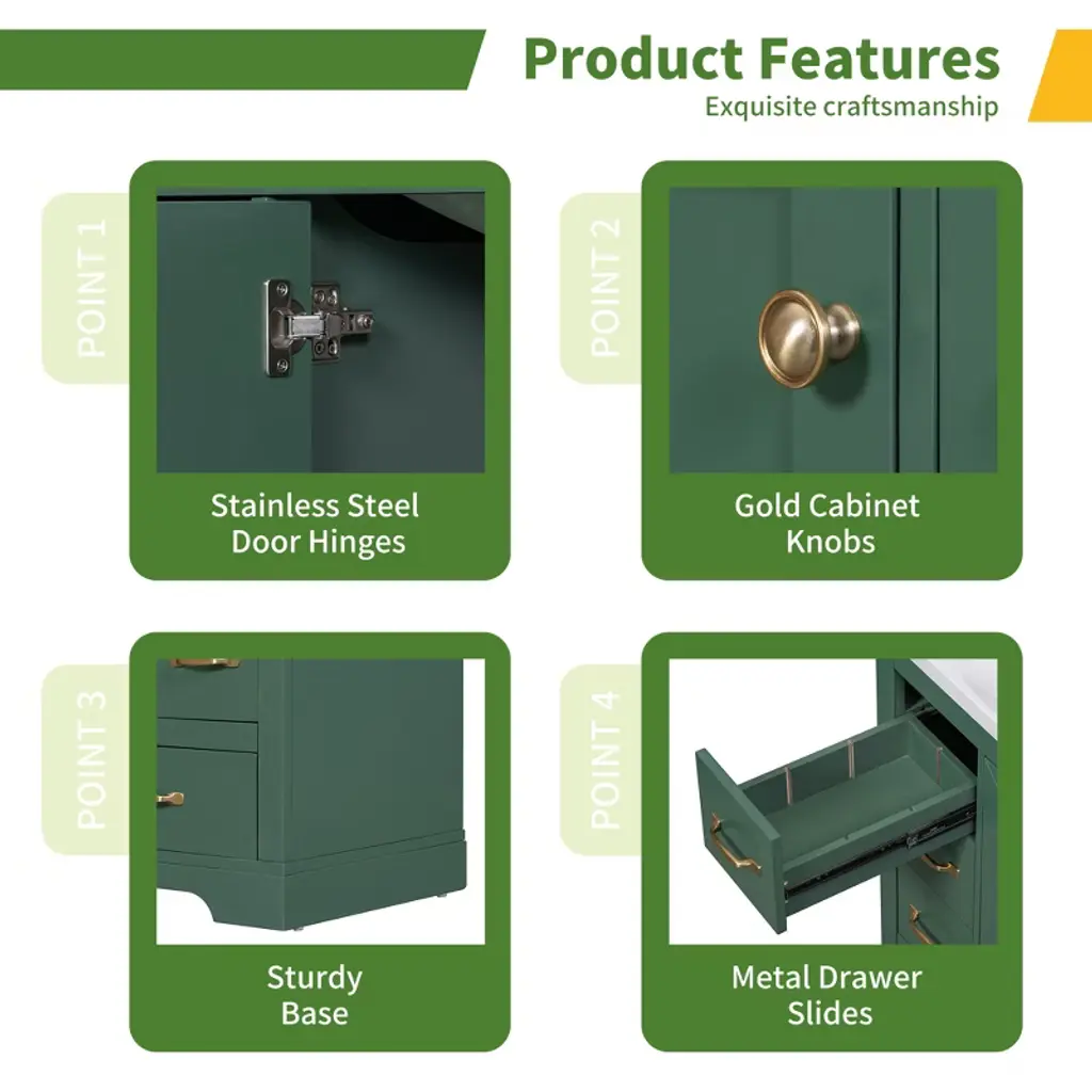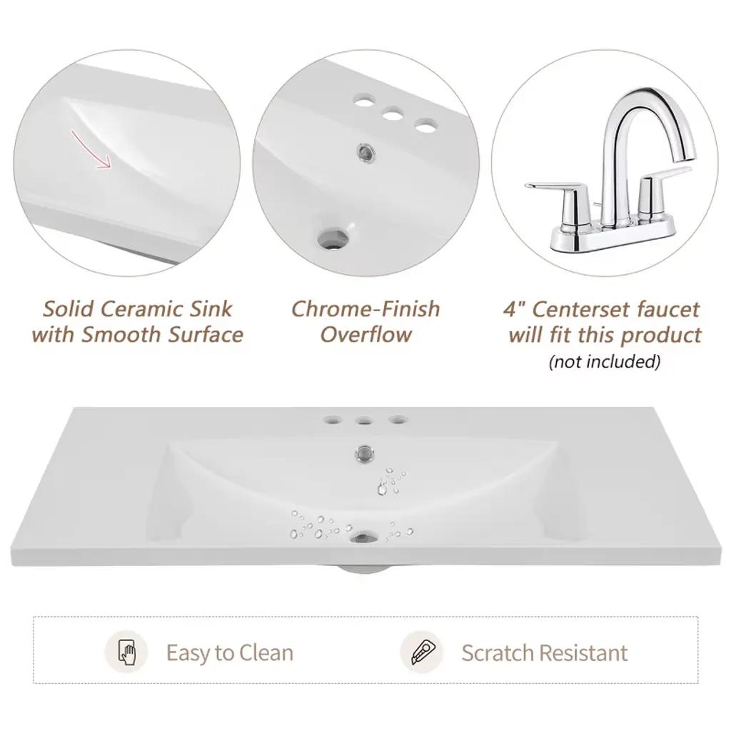 Introducing our elegantly designed bathroom vanity, a perfect blend of durability, functionality, and modern aesthetics for any contemporary bathroom. Constructed from sturdy solid wood and MDF boards, it features a waterproof, stain-resistant painted finish that ensures long-lasting resilience and easy maintenance. The integrated white ceramic sink, equipped with an overflow and three faucet holes for 4" centerset faucets, maintains its glossy shine with minimal effort. This vanity prioritizes ample storage with a versatile layout, including an adjustable-shelf cabinet, three smooth-gliding drawers, and six intelligently tiered drawers, featuring a multi-functional divider and a two-tiered middle drawer for customized organization. The removable dividers allow for personalized storage solutions, keeping toiletries, towels, and essentials dust-free. Practical yet stylish, this vanity optimizes space efficiency while adding a touch of elegance and convenience to your daily routine.