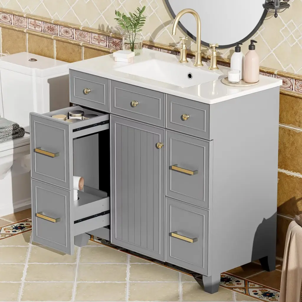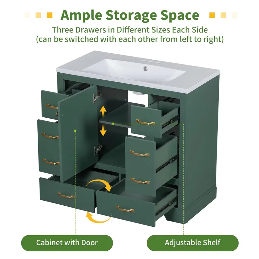 Whisen 36" Bathroom Storage Cabinet Bathroom Vanity With Ceramic Sink, Adjustable Shelf And 6 Drawers