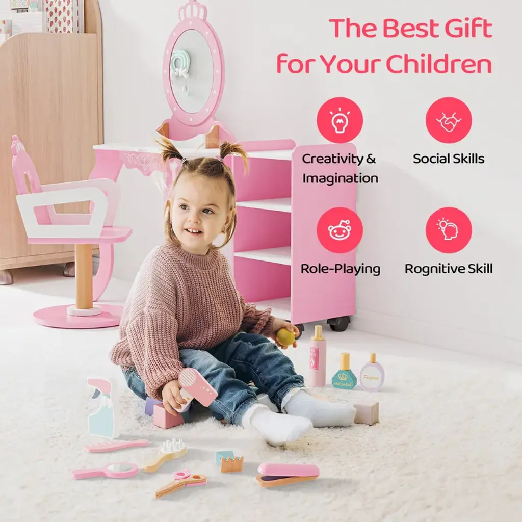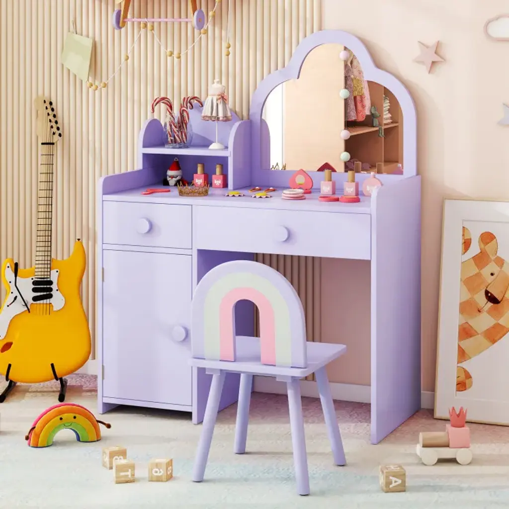 Specifications:Description:This kids' vanity set with a cloud-shaped mirror offers a fun and functional addition to any room. The large acrylic mirror ensures a clear view for children to check their hair and makeup safely, with shatterproof construction for peace of mind. The versatile table can be transformed from a vanity into a study desk with ease, featuring a spacious desktop, one open shelf, a single-door cabinet, and two storage drawers to organize cosmetics, jewelry, and other essentials. The comfortable matching stool boasts a curved backrest and smooth seat, supported by sturdy pine wood legs with anti-slip foot pads for added stability. Crafted from durable MDF, the vanity set is designed for long-lasting use, while the anti-toppling feature provides enhanced safety by securing the table to the wall. Rounded corners and splinter-free edges ensure your child’s safety while using it. This charming vanity set, with its adorable cloud design, makes an ideal gift for little princesses aged 3-7, adding a delightful touch to bedrooms, playrooms, or any space.Key Features:● Cloud-shaped Vanity Mirror: The stylish cloud-shaped mirror offers kids a large view, allowing them to observe their hairdos and faces for convenient makeup. Plus, the shatterproof acrylic mirror also ensures a safe makeup experience.● Versatile Table with Storage Space: The top of the table can be moved away when not in use, so that kids can use it as a dressing table or a study desk. Moreover, the vanity table has 1 open shelf, 1 spacious desktop, 1 single-door cabinet, and 2 storage drawers to store kids' cosmetics and jewelry.● Comfortable and Sturdy Kids Chair: The vanity set also comes with a matching stool. The curved backrest and smooth seat offer kids a comfy sitting experience. Supported by 4 solid pine wood legs, the stool can perfectly support kid's body. Anti-slip foot pads increase overall steadiness.● Stable and Reliable Construction: Crafted with high-grade MDF, the kids vanity set allows for excellent stability and a long-lasting lifespan. The anti-toppling design can secure the vanity table to the wall for enhanced safety and stability. The rounded corners and splinter-free edges protect children from getting scratched.● Adorable Gift for Little Princesses: Featuring cute cloud-shaped design and beautiful colors, the dressing table and chair will be a perfect gift for 3-7 years old kids. The vanity set is a wonderful addition to kids' room, bedroom, play room, and more.
