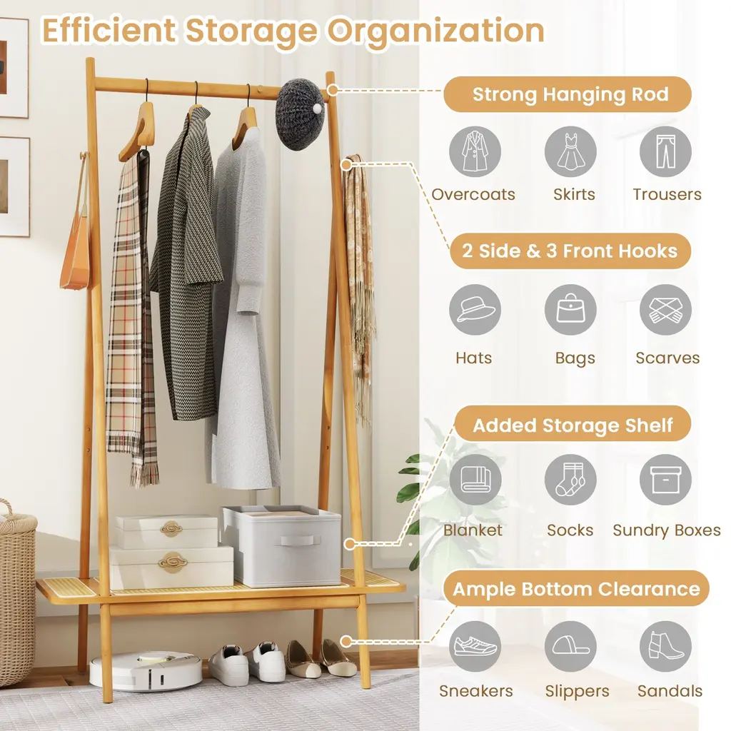 Wicker Resin Rattan Clothes Rack With Hanging Rod, Shelf, And Hooks - 37" X 17" X 65.5" (L X W X H) - Natural