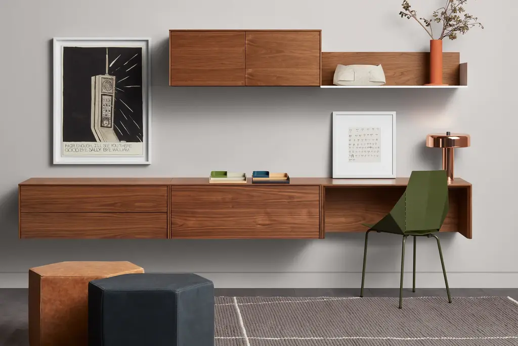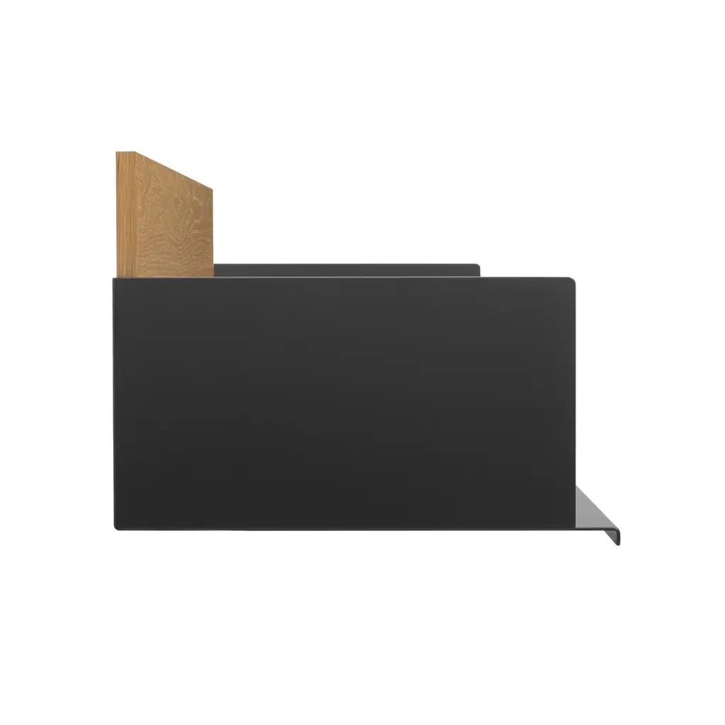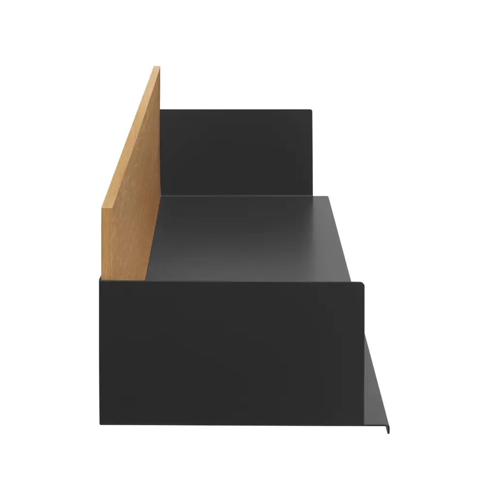 Wall-mounted powder-coated steel shelf with a walnut or white oak back panel turns any wall into an opportunity. Pair with companion cabinet and desk units to create a full-on storage masterpiece.