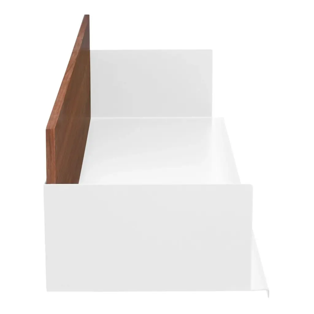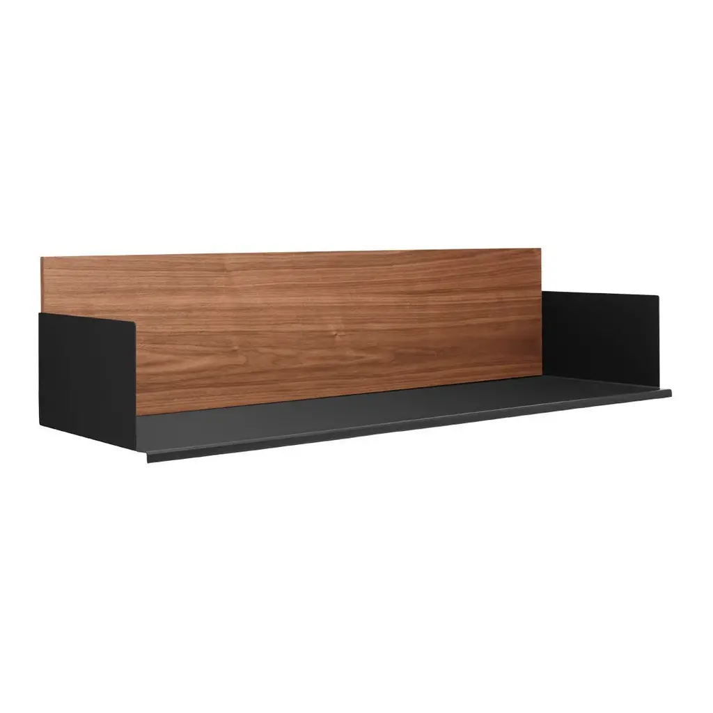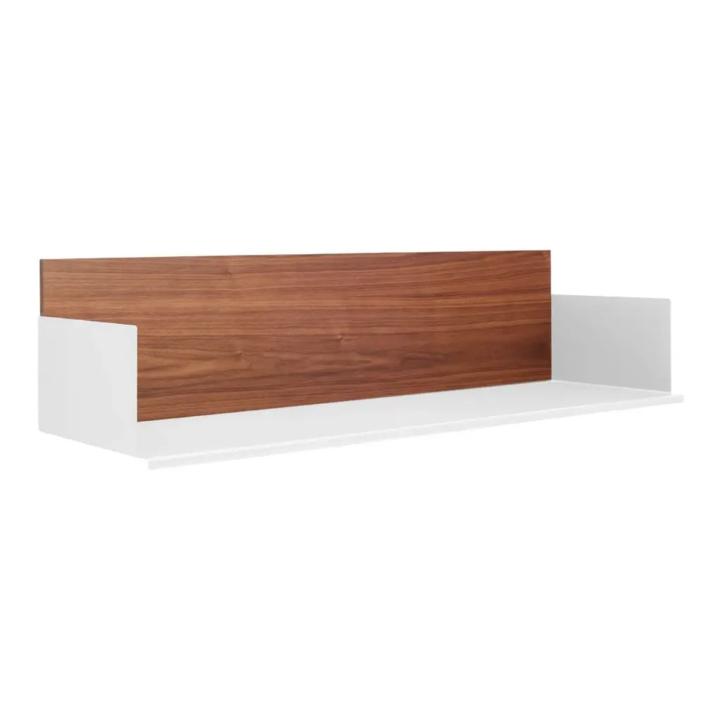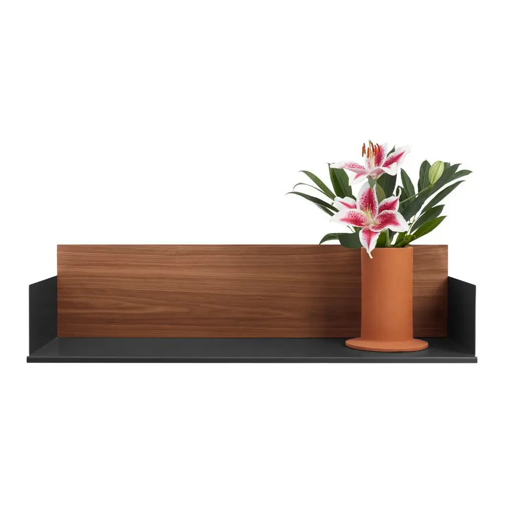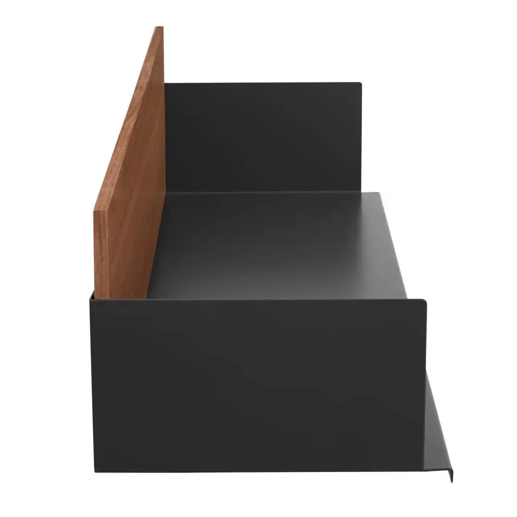 Wall-mounted powder-coated steel shelf with a walnut back panel turns any wall into an opportunity. Pair with companion cabinet and desk units to create a full-on storage masterpiece.