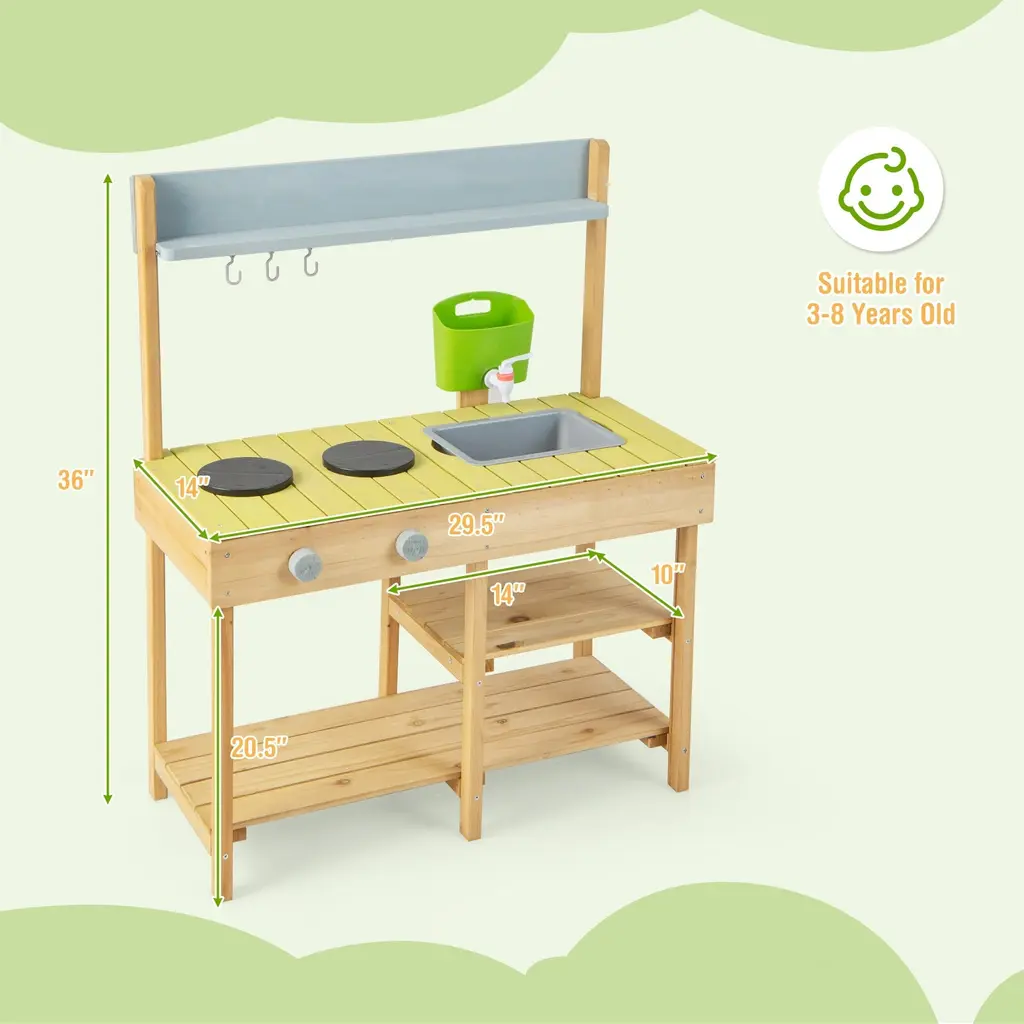 Specifications:Description:This kids’ cooking toy set, crafted from durable fir wood, features a realistic kitchen design with 2 stove burners, a sink with a water box and faucet, and ample storage space with open shelves, a spacious tabletop, and hanging hooks. The rotatable knobs create realistic sound effects, enhancing the pretend play experience. The set includes a removable sink for added fun, allowing kids to mix mud or sand. Perfect for children over 3, this play kitchen promotes creativity, role-playing, and organizational skills, making it a great gift for young ones to learn through interactive play. Key Features:● Realistic Play Kitchen Set: This kids cooking toy emulates the design of the real kitchen, including various play areas like 2 stove top burners, sink, water box and faucet, storage shelves. Besides, the rotatable knob can make realistic sound effects, allowing children to experience authentic cooking.● Premium Material and Stable Structure: This play kitchen set is made of solid fir wood material that boasts excellent durability, high strength, and anti-deformation. Wood support legs with firm connections enhance overall stability. Plus, the smooth round edges will protect kids' safety.● Ample Storage Space: Designed with top open shelf, spacious tabletop, 3 hanging hooks and 3 open storage shelves, this pretend play toy kitchen can store kitchen essentials while helping kids develop organization habit. Plus, the slatted tabletop also promotes quick drainage.● Water Box and Removable Sink: The integrated water box and faucet can be added with water to add more fun. The spacious sink is ideal for washing food, vegetables or toys. And it can be removed for mixing mud or sand! This pretend play toy is a great addition in your backyard for outdoor playtime.● Learn through Play: These play toy kitchen allows kids to pretend to cook food like parents or inviting their friends to cook. It will help develop their creativity and role play, relationship skills, communication skills, thinking and processing skills. It is a perfect gift for kids over 3 years old.
