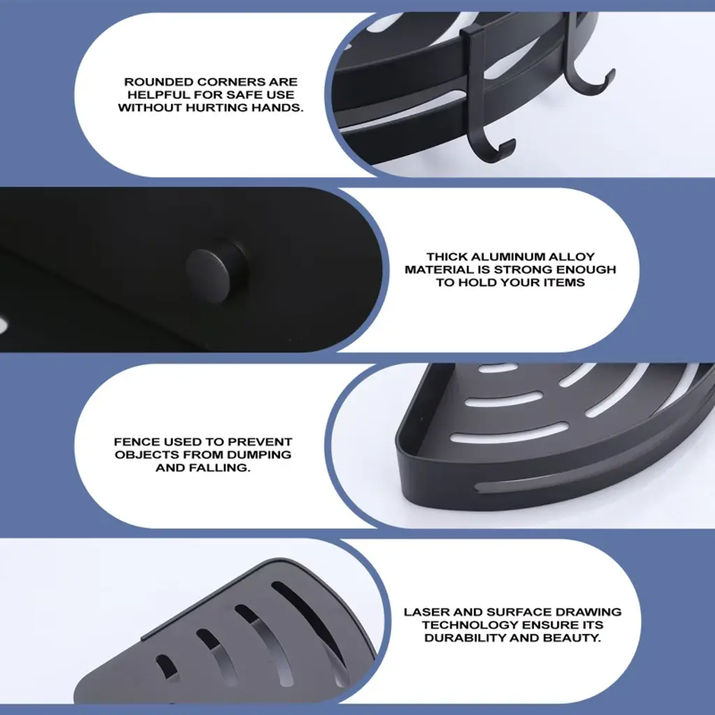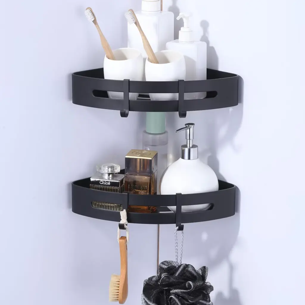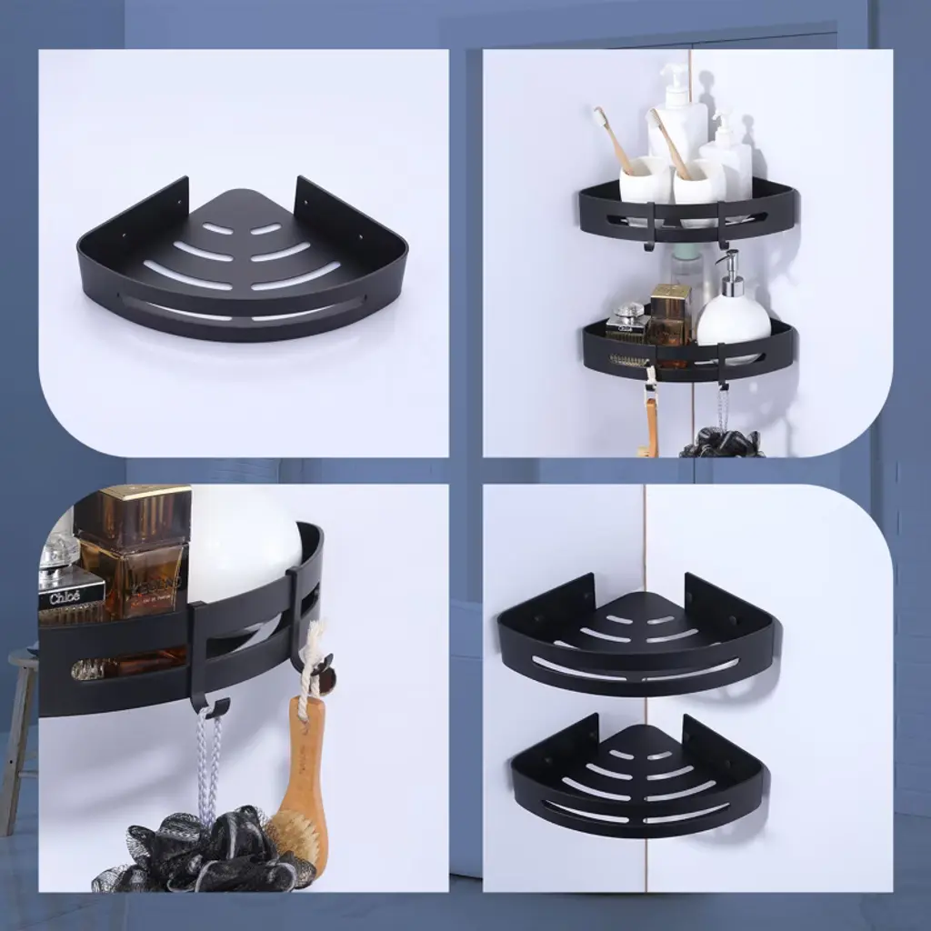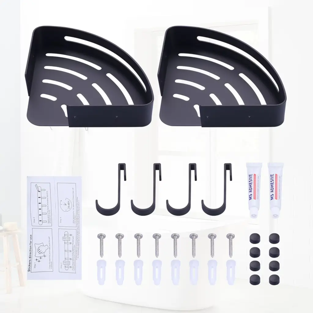 Introducing our versatile and durable corner shower caddy, designed to revolutionize your home storage. Crafted from high-quality materials, this caddy is perfect for organizing your essentials in any room. With two installation methods to choose from, you can easily mount this caddy on any wall. Use the glue or auxiliary stickers for a quick and wall-friendly setup, or opt for the drilling kit for a more secure fit on uneven surfaces. Adjustability meets durability with our corner shower caddy. The two shelves can be freely adjusted in distance and height according to your actual needs, while the thickened design supports up to 40 lbs. The hollow bottom design promotes fast drainage, keeping your bath accessories clean and dry. Please NOTE that this caddy is only suitable for 90° angles and not for round or arc angles. Upgrade your home storage with our Premium Corner Shower Caddy.