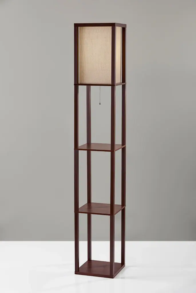 Have it all with style and multi-function. The Wright shelf floor lamp features a natural wood finished open box frame with two additional display/storage shelves, making it a handy addition to the living/media room, den, office, or bedroom. The square natural textured shade diffuses light from a 150 Watt incandescent or equivalent bulb. The lamp has on/off functionality with a metal ball accented pull chain switch. This lamp has a clear cord and is smart outlet compatible. The lamp comes with clear wire clips for a clean look. Bulb is not included.