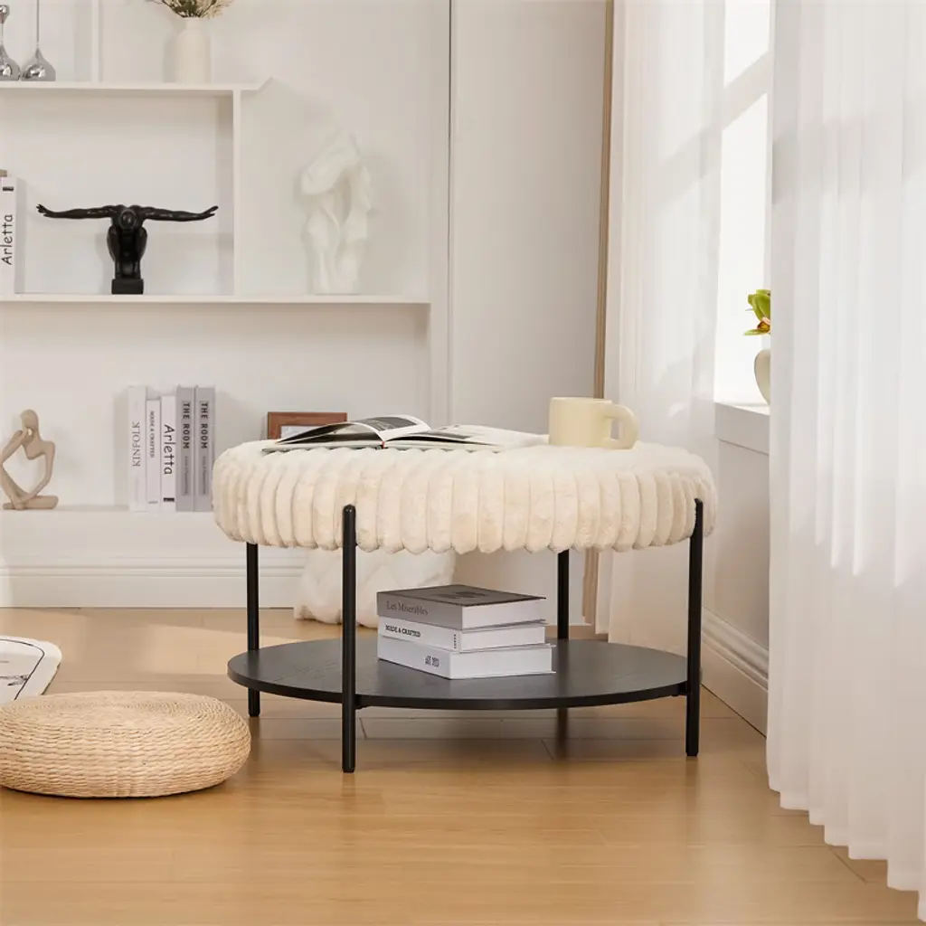 Xinghanzhenxuan Beige Round Upholstered Ottoman With Storage Shelf, Faux Fur Footstool Coffee Table With Metal Legs For Living Room