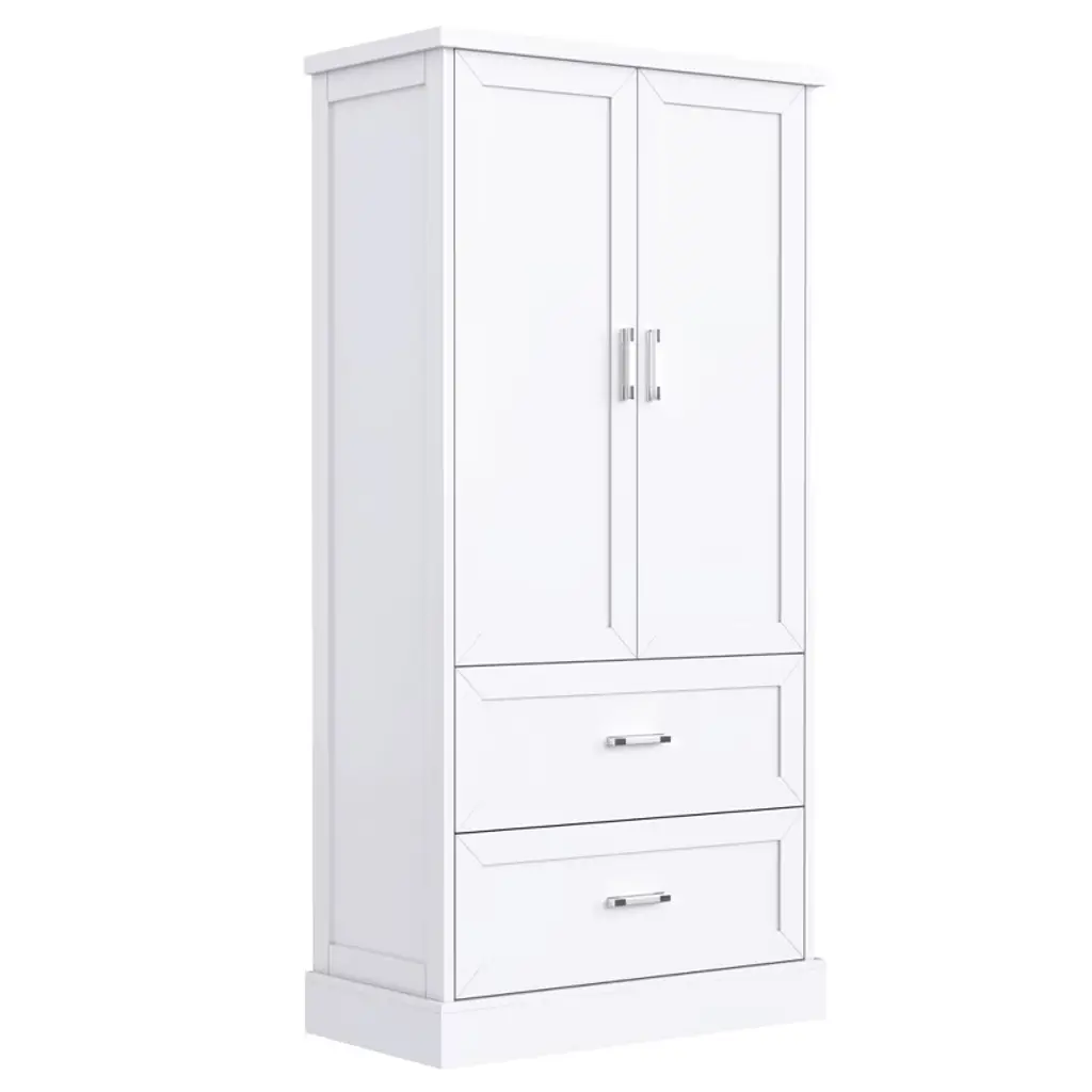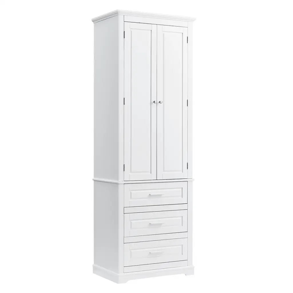 The upper enclosed cabinet features three-tier shelving for displaying decor or storing daily essentials, while two spacious drawers below provide hidden storage for toiletries, office supplies, or kitchen utensils. The adjustable interior shelf (three height settings) adapts to tall bottles, baskets, or linens, allowing flexible organization for varying storage needs—from towels to paperwork.