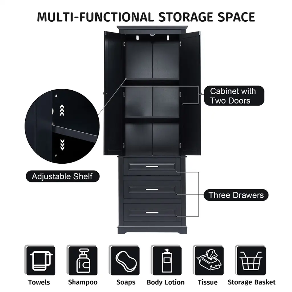 Xinghanzhenxuan Black Tall 3-drawer Storage Cabinet For Bathroom & Office, Adjustable Shelf & Anti-tip Kit, Water-proof Painted Finish