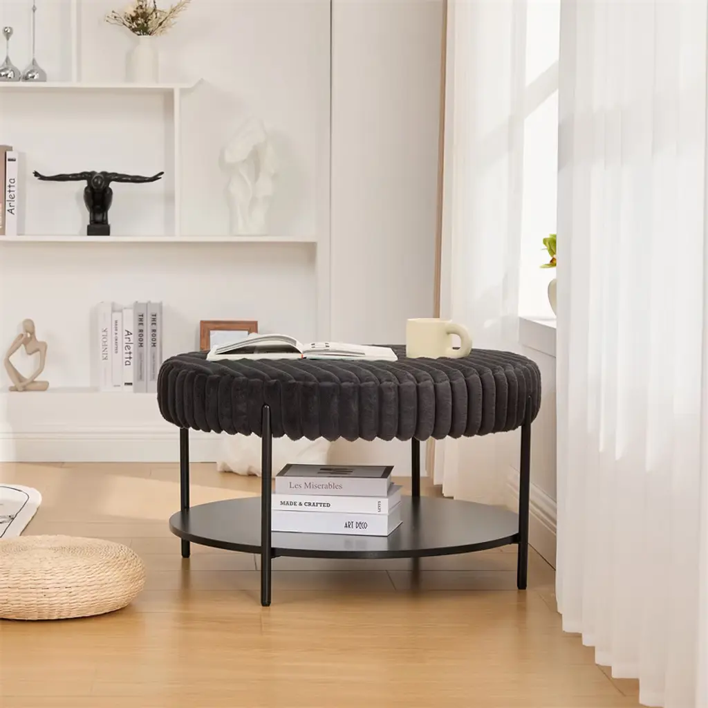 Xinghanzhenxuan Dark Brown Round Upholstered Ottoman With Storage Shelf, Faux Fur Footstool Coffee Table With Metal Legs For Living Room