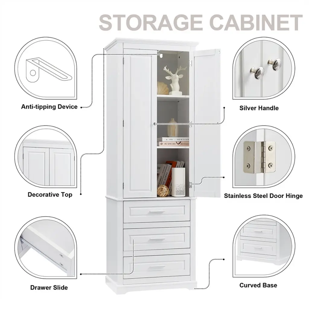 Crafted from premium MDF boards with a smooth, water-proof painted finish, this tall cabinet resists moisture in bathrooms and kitchens while offering effortless cleaning. The metal door handles, hinges, and drawer slides ensure long-lasting reliability, blending sturdy performance with a sleek, contemporary design that complements any decor.