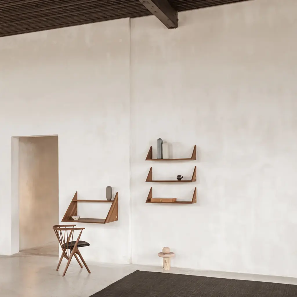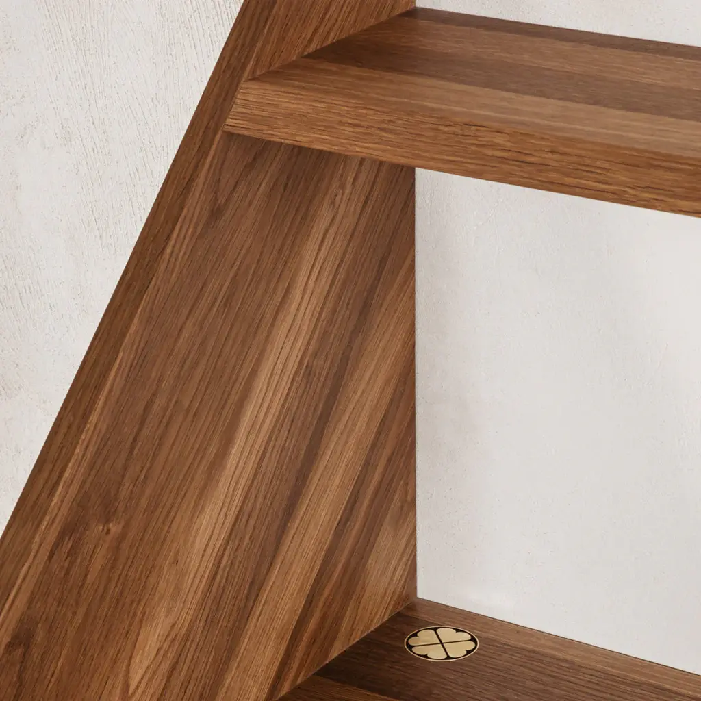 Sibast Furniture worked with danish artist Kasper Eistrup in developing the XLIBRIS series. It consists of two pieces of multifunctional furniture: a wall-mounted, self-supporting shelf and a matching table, both with an ultra-slim silhouette and a light style, reminiscent of Japanese origami art. The design uses 45 degree lines from the side of the shelf to the front edge of the board. Kasper Eistrup's artistic approach to design and his sense of detail are also evident in XLIBRIS, furnished with an exclusive brass emblem mounted on the side of both the shelf and the wall-mounted desk. The emblem is made up of four hearts joined into a four-leaf clover. The hearts symbolise a predilection for necessity, functionality, the material and the craft – all of which were involved in the development of XLIBRIS. Both the shelf and the wall-mounted desk are assembled without visible screws, emphasising the impression of XLIBRIS as two integrated pieces of furniture that seemingly grow out of the wall.