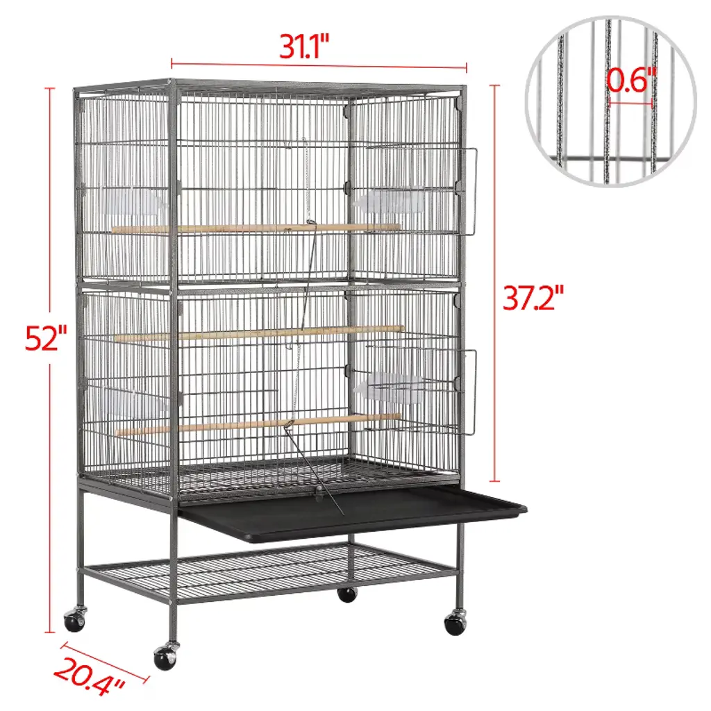 Heavy duty bird cage is constructed of powder coated hammered paint metal which ensures great performance in water and oxidation resistance. It is a sturdy parrot cage that is prepared for long-term use.Considerate design makes cleaning a breeze. Simple structure and illustrated instruction allow this cage to be assembled without any difficulty. Specifications:Material: Powder Coated Steel Cage + PP Wheel + Solid Wood Perch + Plastic Feeder + PP Slide-out TrayColor: Black, WhiteOverall Dimension: 31.1 x 20.4 x 52"(LxWxH)Cage Dimension: 31.1 x 20.4 x 37.2" (LxWxH)Bar Spacing: 0.6" NOTE: Please see the image for exact measurements.TPlease notice that the color of this birdcage is not pure black. It is in hammered black.