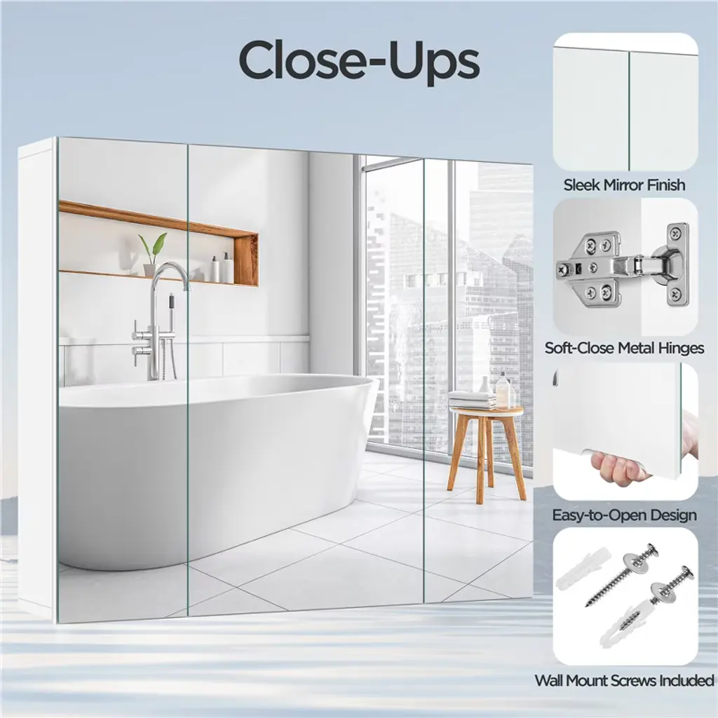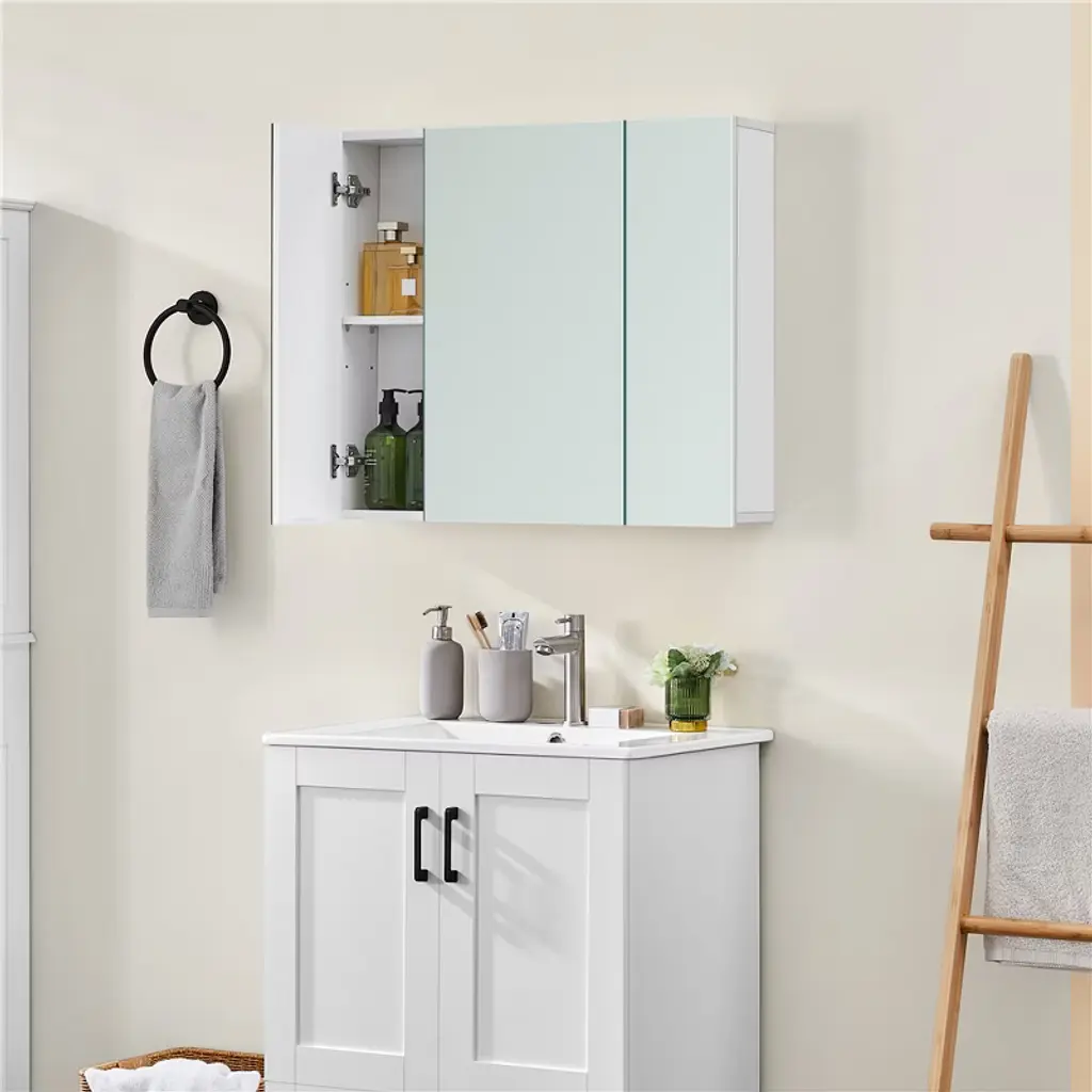 Save space with this wall-mounted frameless mirror cabinet crafted from green E1-compliant MDF. Featuring three mirrored doors and adjustable shelves, it offers flexible storage for grooming essentials. Durable and easy to clean, this stylish cabinet enhances organization and adds a sleek touch to bathrooms, laundry rooms, or living areas. *Specifications: Color: WhiteMaterials: MDF, GlassAssembled Dimensions: 28″ L × 6″ W × 24″ H Adjustable Height of Shelf: 8″, 10.6″, 13″Width of the Small Frameless Glass Panel: 7″Width of the Big Frameless Glass Panel: 13.6″Maximum Weight CapacityEach Shelf: 11 lbItem Weight: 32.1 lbShipping Weight: 38 lb Please see the image for exact measurement. Please allow a 1/2″ measurement tolerance.Color variations may occur due to differences in lighting and monitor settings.