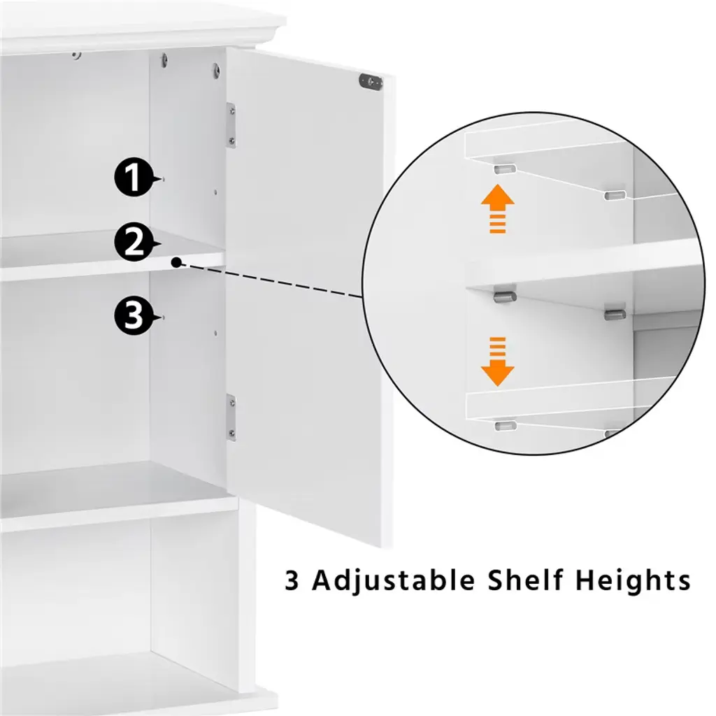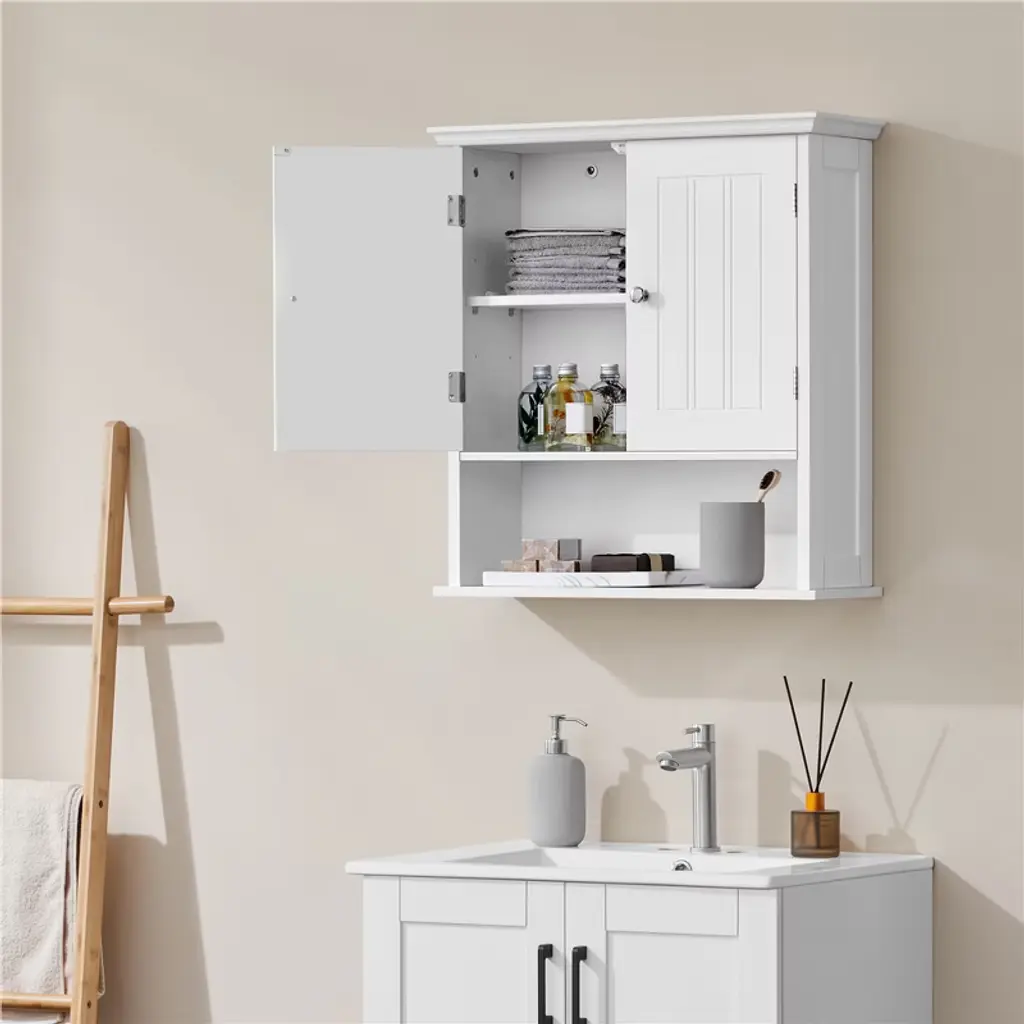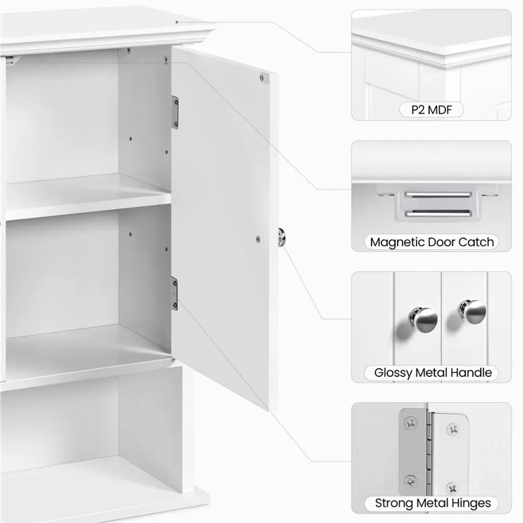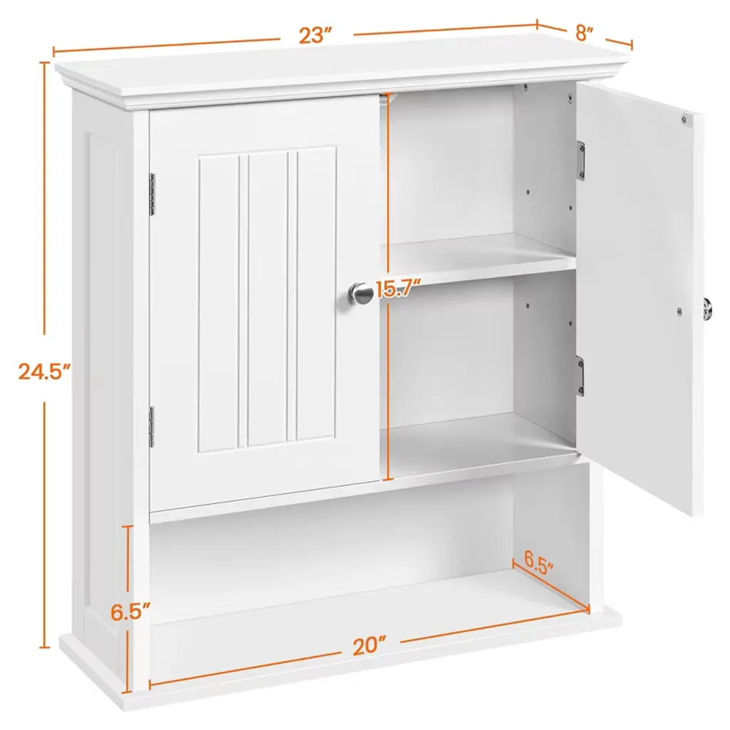 Keep essentials organized with this wall-mounted cabinet featuring four tiers, including an adjustable shelf. Made from CARB P2-compliant MDF, it balances safety and strength. The clean design and neutral color blend easily with your décor, while the open shelf offers a stylish spot for display or daily use. *Specifications: Color: WhiteMaterial: MDFAssembled Dimensions: 23″ L × 8″ W × 24.5″ H Adjustable Height of Inner Shelf: 5.5″, 8″, 10.4″Bottom Open Compartment: 20″ L × 6.5″ W × 6.5″ HMaximum Weight CapacityBottom Shelf: 18 lbFixed Shelf / Adjustable Shelf: 13 lbItem Weight: 23.4 lbShipping Weight: 26 lb Please see the image for exact measurement. Please allow a 1/2″ measurement tolerance.Color variations may occur due to differences in lighting and monitor settings.