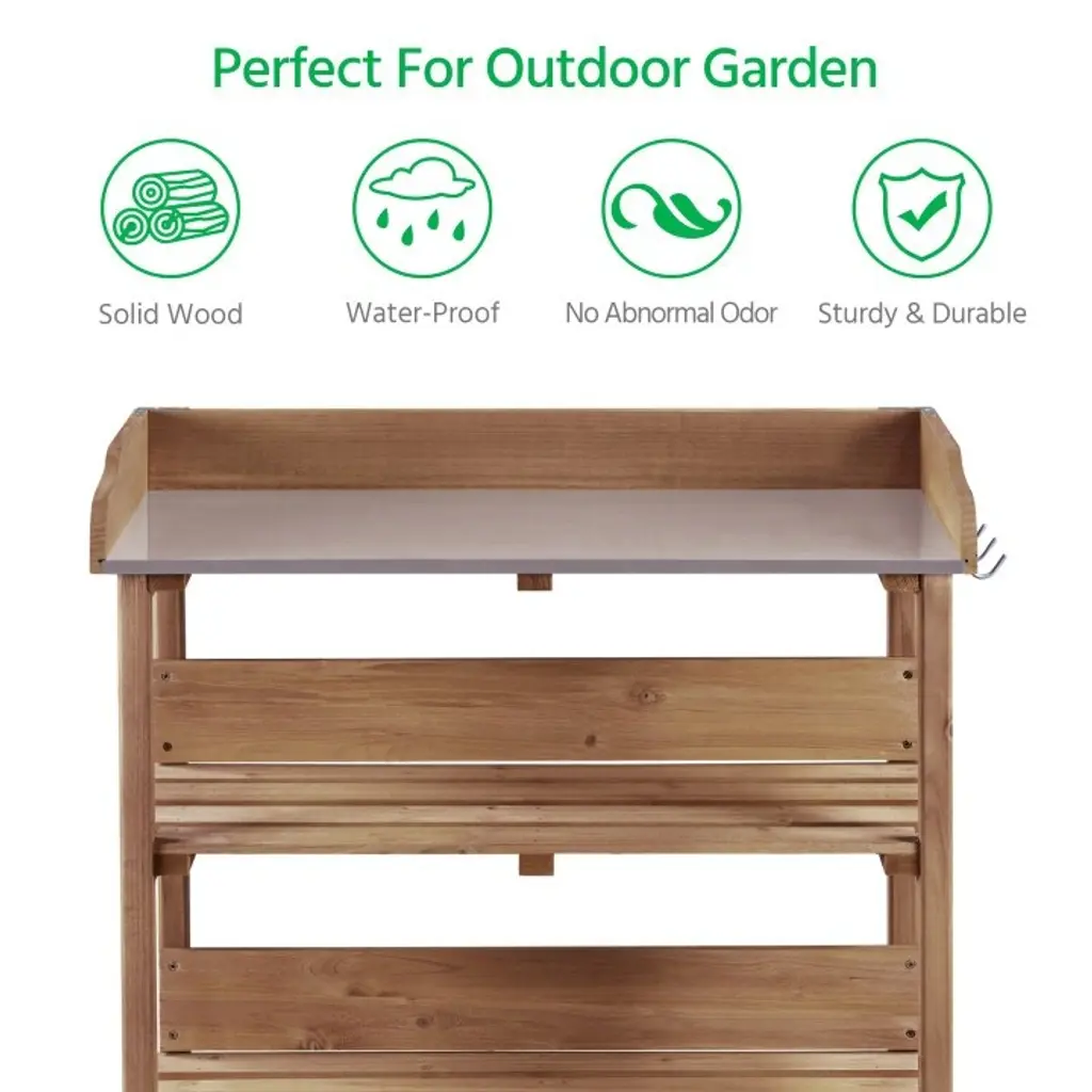 Create a garden workspace with this Yaheetech Outdoor Potting Bench Table Station with Storage Shelf. Made of solid fir wood, this potting bench is sturdy and durable, and has a natural appearance. The bench features two wide-open shelves that provide ample space for gardening tools, extra soil, and other equipment. The metal surface is water-resistant and easy to clean, making it suitable for outdoor use. With a versatile design, this potting bench can be used as a gardening workspace, a storage organizer, or a floor stand.Features:Additional Details:
