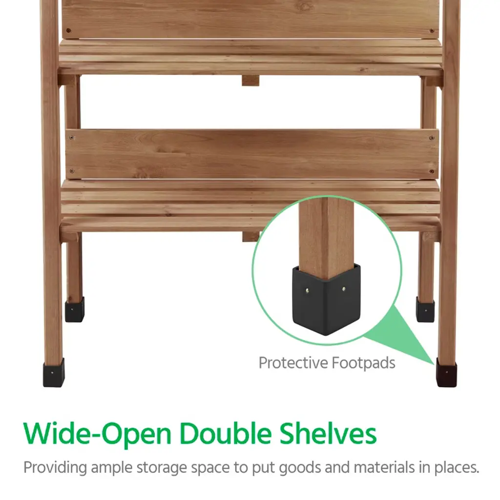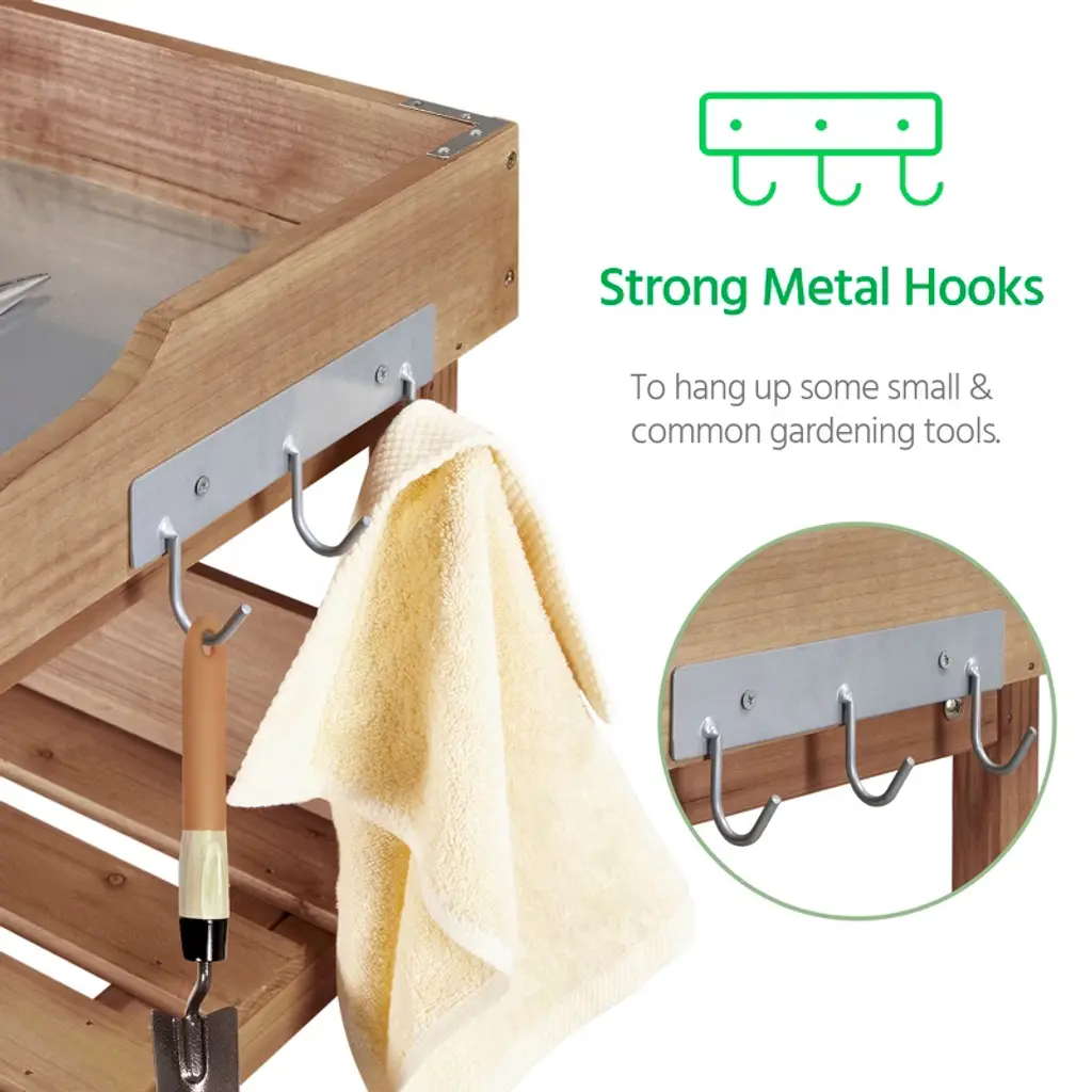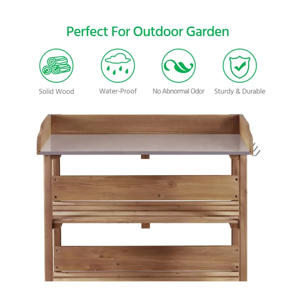 If you need something to pick up and put down gardening tools while working outdoor, our gardening potting bench can be an ideal choice! Solid fir wood makes this bench table sturdy and durable. Two wide-open shelves has enough space to place other handy tools and soils. Smooth metal is smooth and easy to clean, also featuring water-proof. Versatile design allow this outdoor potting bench used either outdoor, convenient and simple to keep. Feel free to customize your preferred coating on it and enjoy gardening. Specifications: Materials: Fir, Metal, PlasticsColor: Wood, Gray, BrownOverall Dimension: 30.6×14.6×35.5inchInterior Table Surface: 29×14inchInterior Table Height: 3inchTop shelf Height: 9.6inchBottom Shelf Height: 11.2inchBottom Length: 26.6inchBottom Width: 13.6inch Note: 1. Please see the image for exact measurements.2. Please allow ±0.5inch errors due to manual measurements.