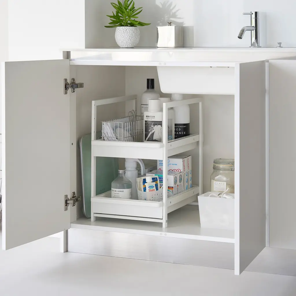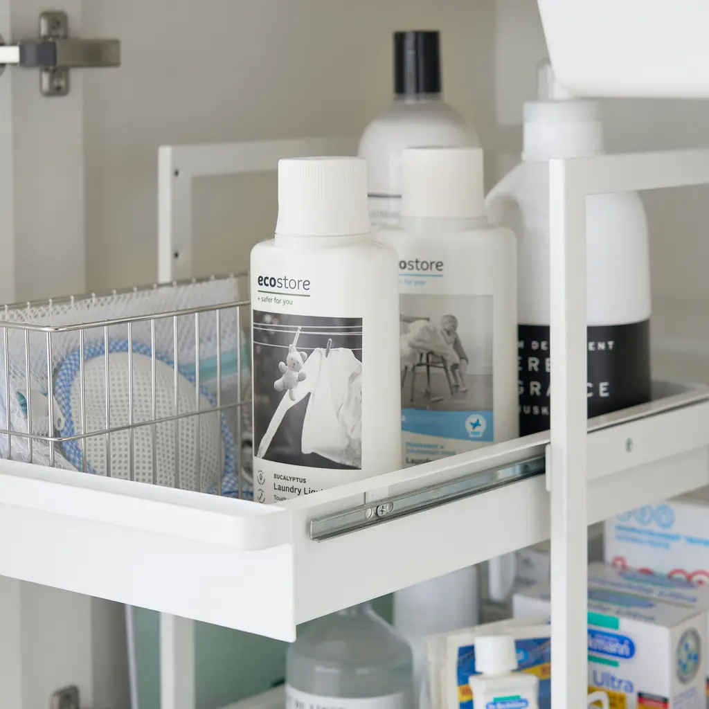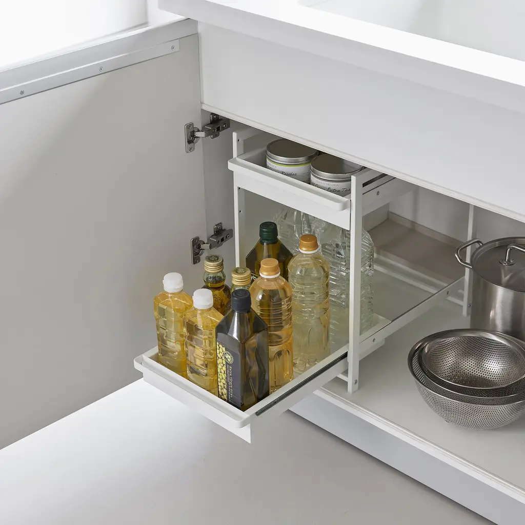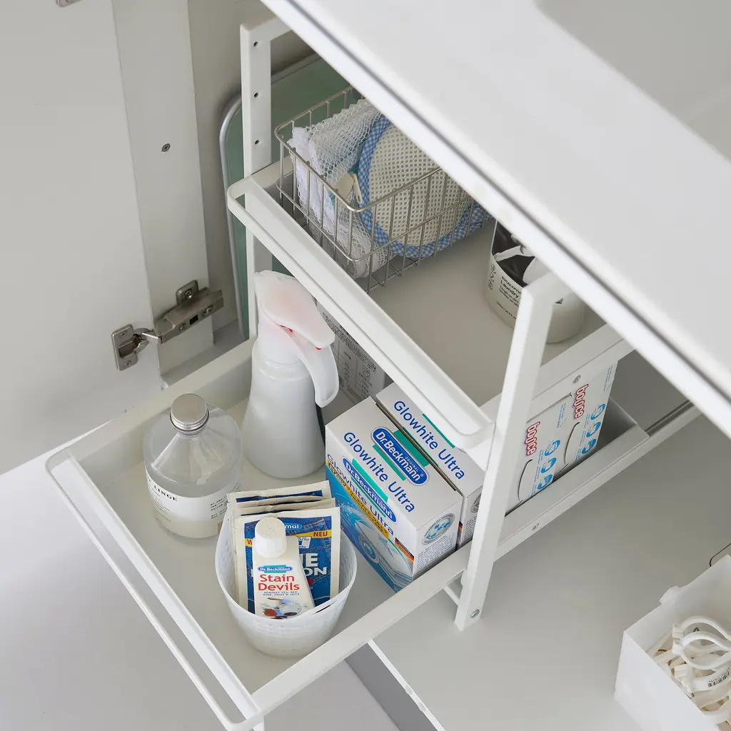 Designed in Japan with small spaces in mind. Keep your under-the-sink space organized. Adjust the top shelf to store larger items beneath. The shelves pull out so everything you need is in reach.