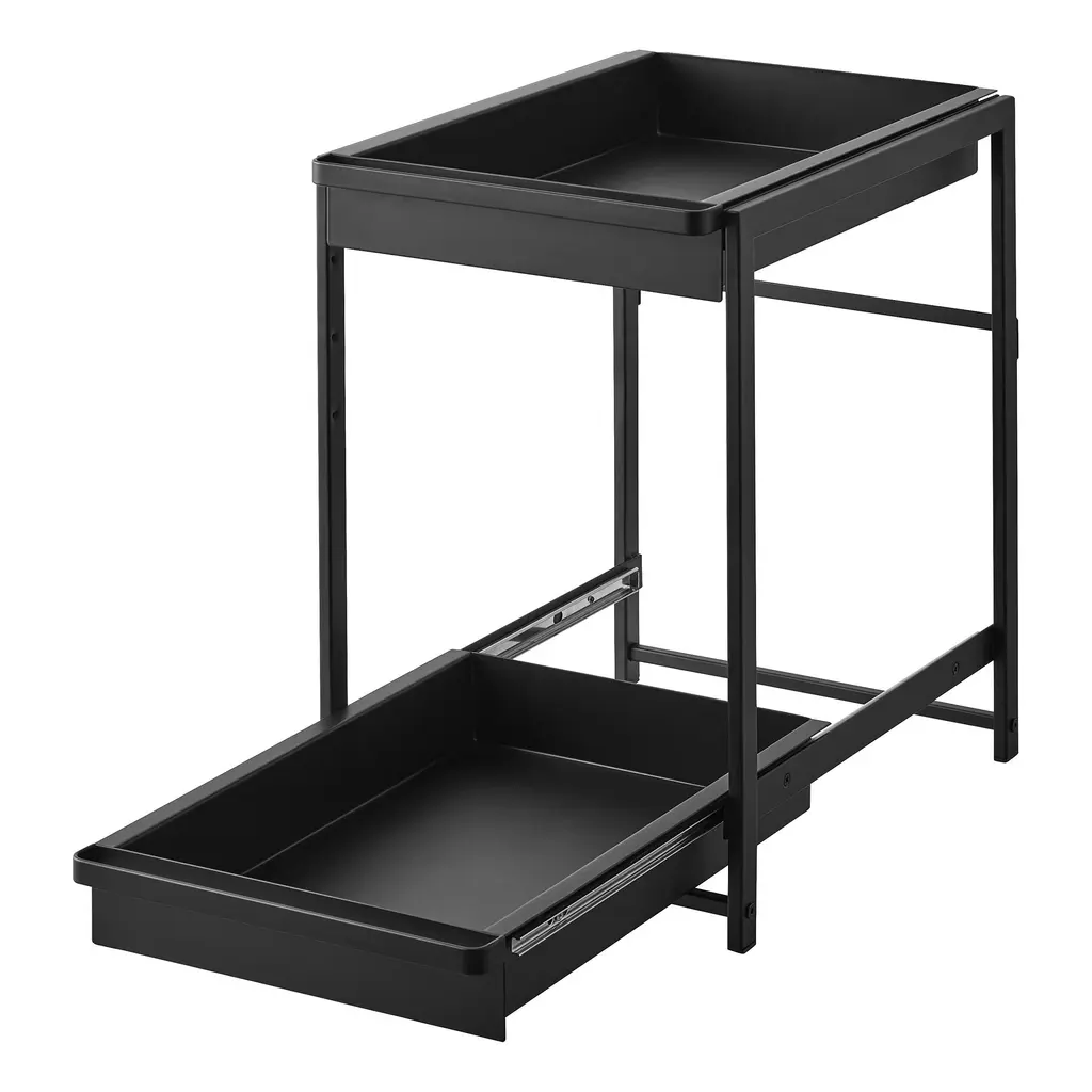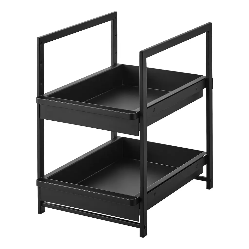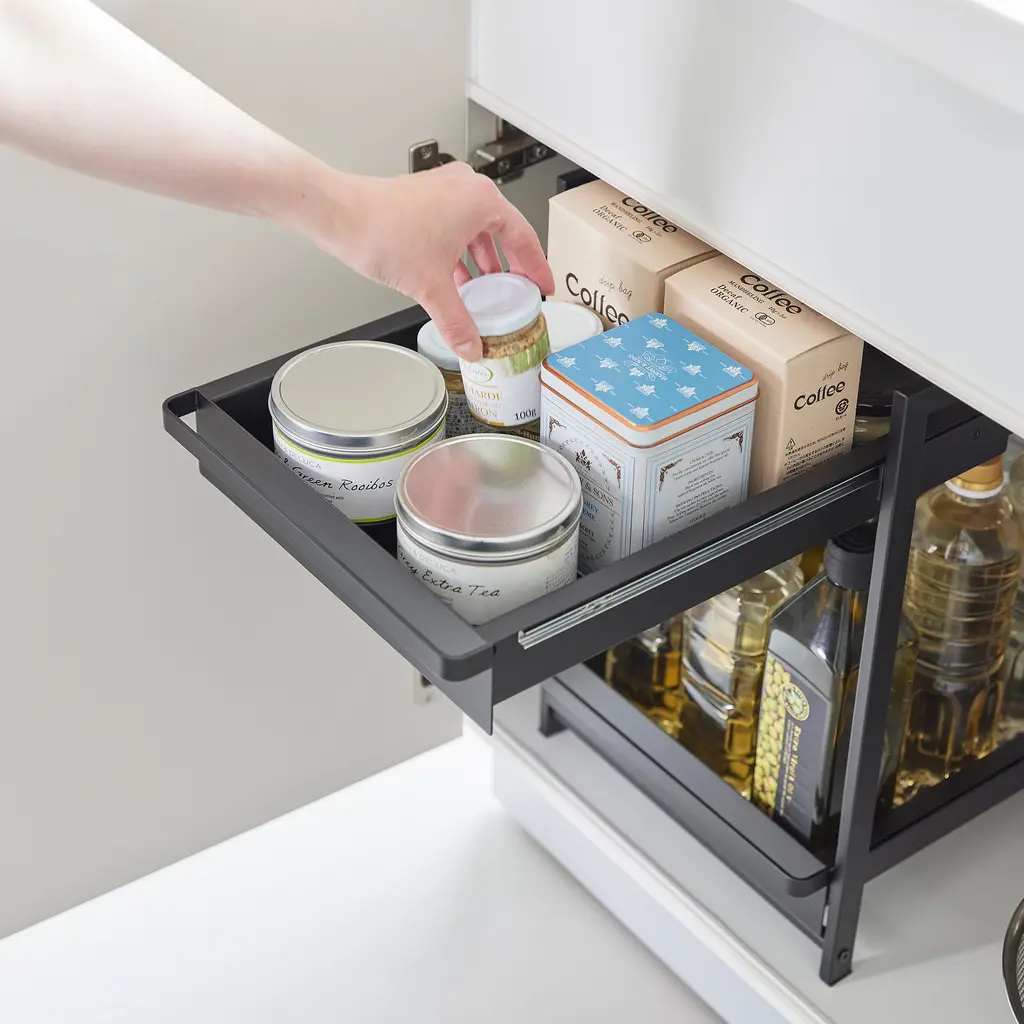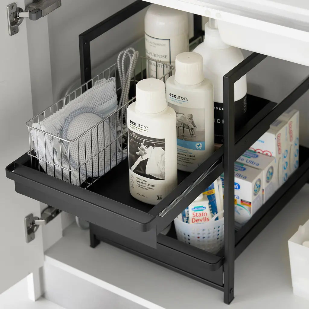 Designed in Japan with small spaces in mind. Keep your under-the-sink space organized. Adjust the top shelf to store larger items beneath. The shelves pull out so everything you need is in reach.
