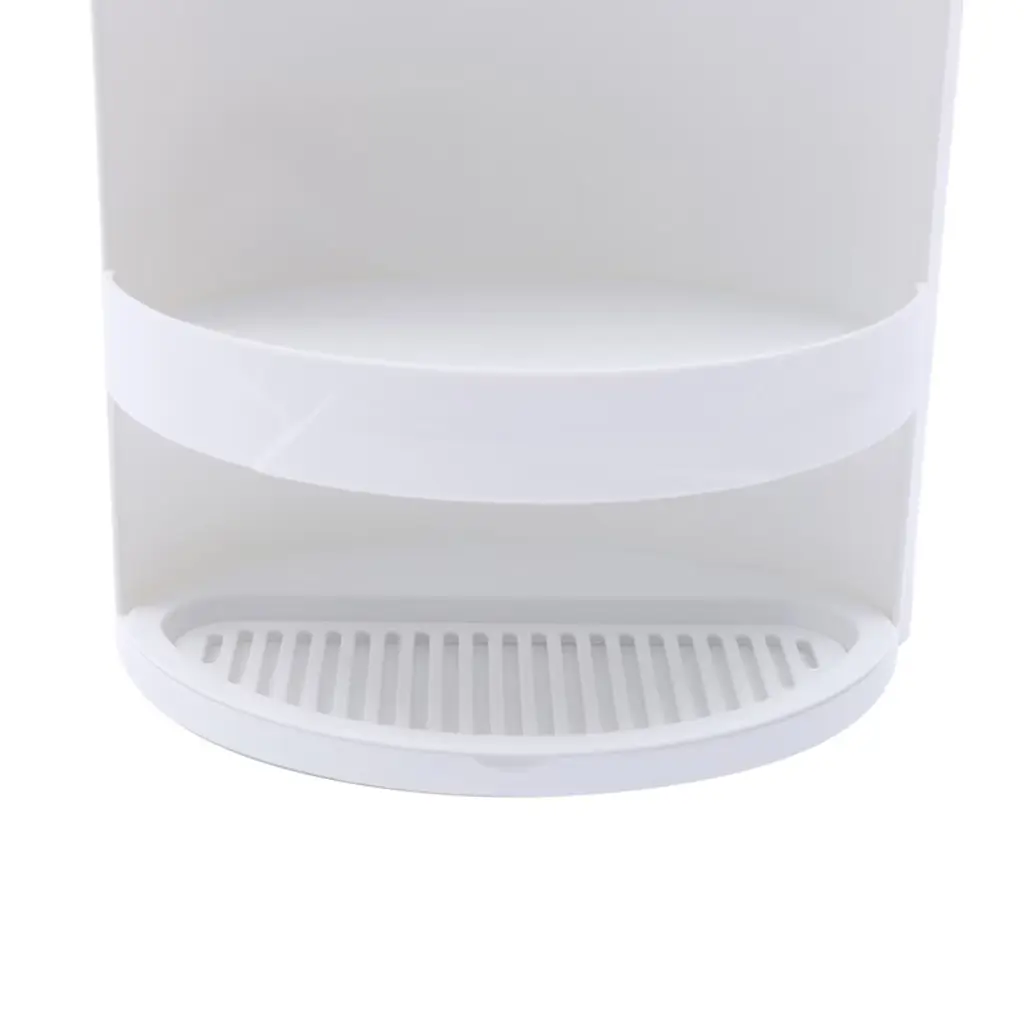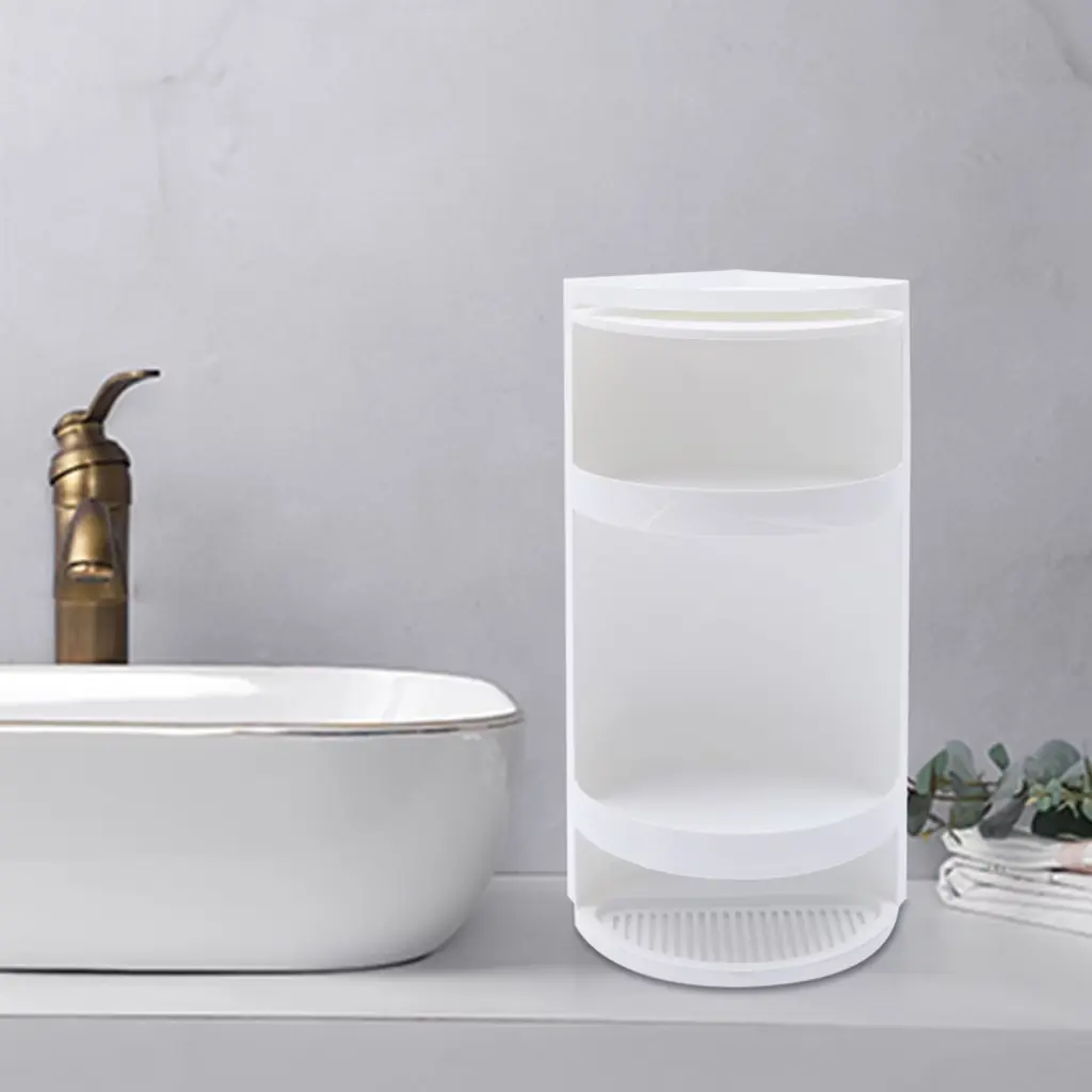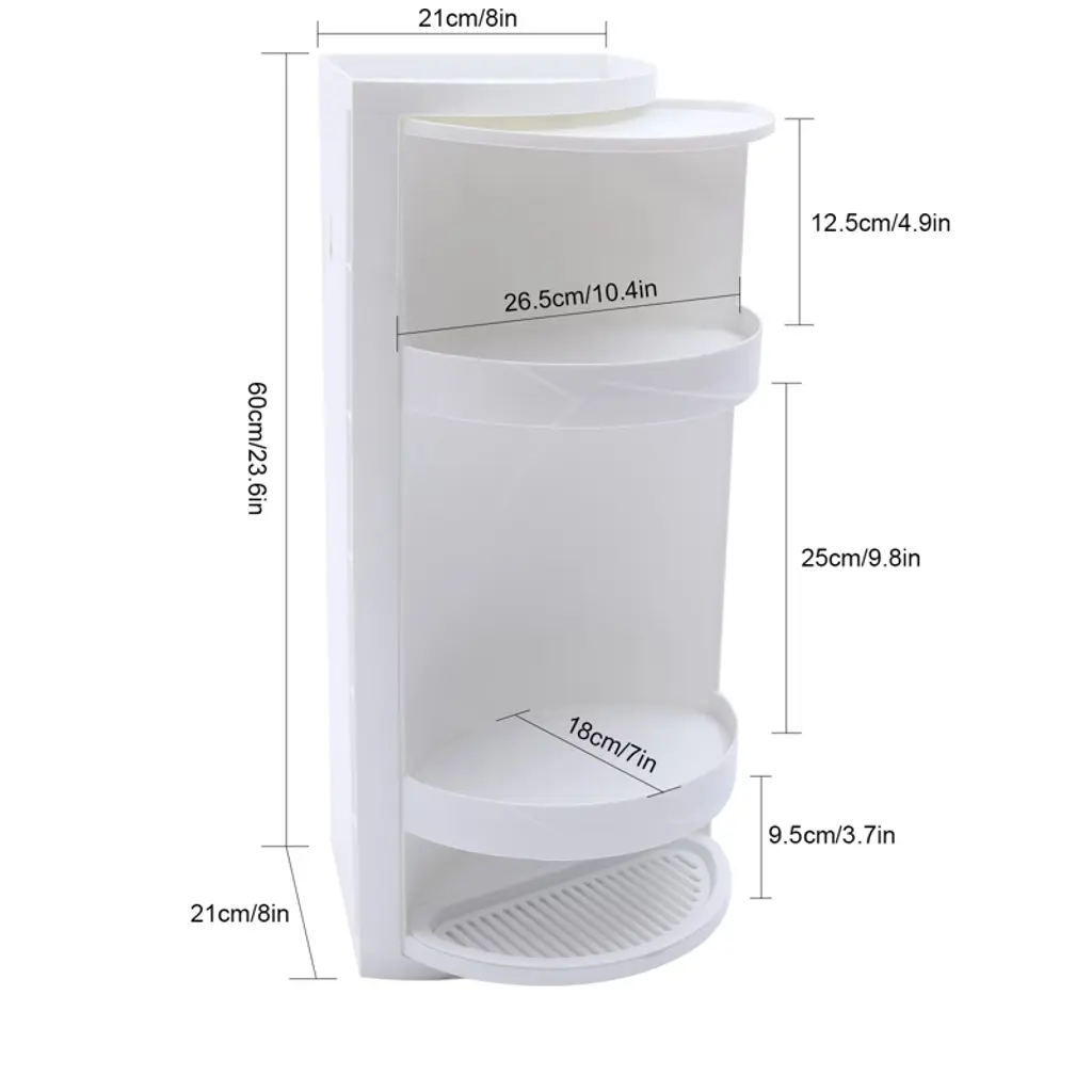 Tired of messy countertops? Our elegantly designed 3-tier storage rack brings order and style to any space. Made from high-quality PP with a durable injection molding process, it features a 360° rotating door for easy access while protecting items from water and dust. Its right-angle, fan-shaped design maximizes corner space, and it can be placed on countertops or wall-mounted with no drilling required. The removable water tray and smooth surface make cleaning effortless, while the minimalist white look complements any decor. Perfect for bathrooms, kitchens, and vanity areas, this rack helps you create a tidy, organized environment effortlessly. How to Install Tabletop: 1. Clean wall surface. 2. Hang the suction cup. 3. Align with the wall corner. 4. Press firmly. Hang Suspend: 1. Clean wall surface. 2. Tear the front side of the sticker and stick it on the product. 3. Apply glue(not included) on both back sides. 4. Choose a location to paste. Specification Color: White Material: PP Style: Modern Shape: Fan-shaped Number of Tiers: 3 Shelf Type: Corner Shelf Process: Injection Molding Indoor/Outdoor Usage: Indoor Installation Type: Tabletop, Wall-mounted Tier Spacing: 12.5cm/4.9in, 25cm/9.8in, 9.5cm/3.7in Product Size: 21*21*60cm/8*8*23.6in