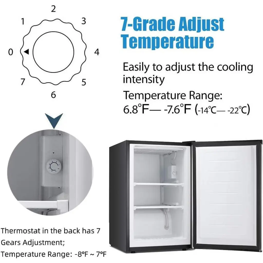 3.0 Cu.ft upright freezer offers spacious storage in a compact design, ideal for tight spaces like dorms and offices. It features 7 precise temperature settings (-7.6°F to 6.8°F) for rapid cooling, a reversible door for flexible placement, and a food-safe interior. Energy-efficient, quiet, and with adjustable feet for stability.