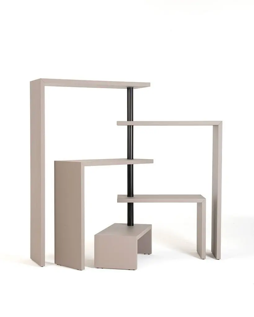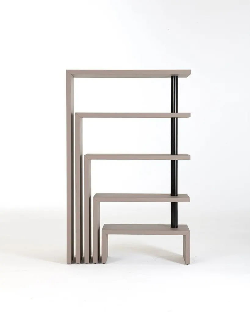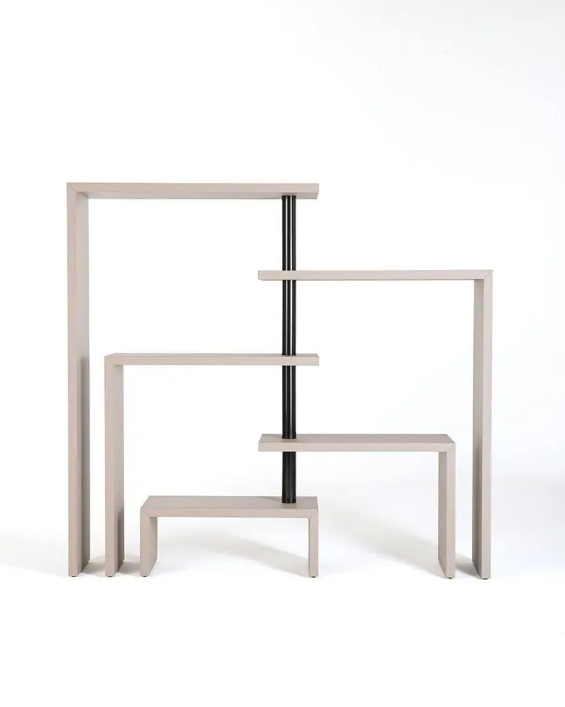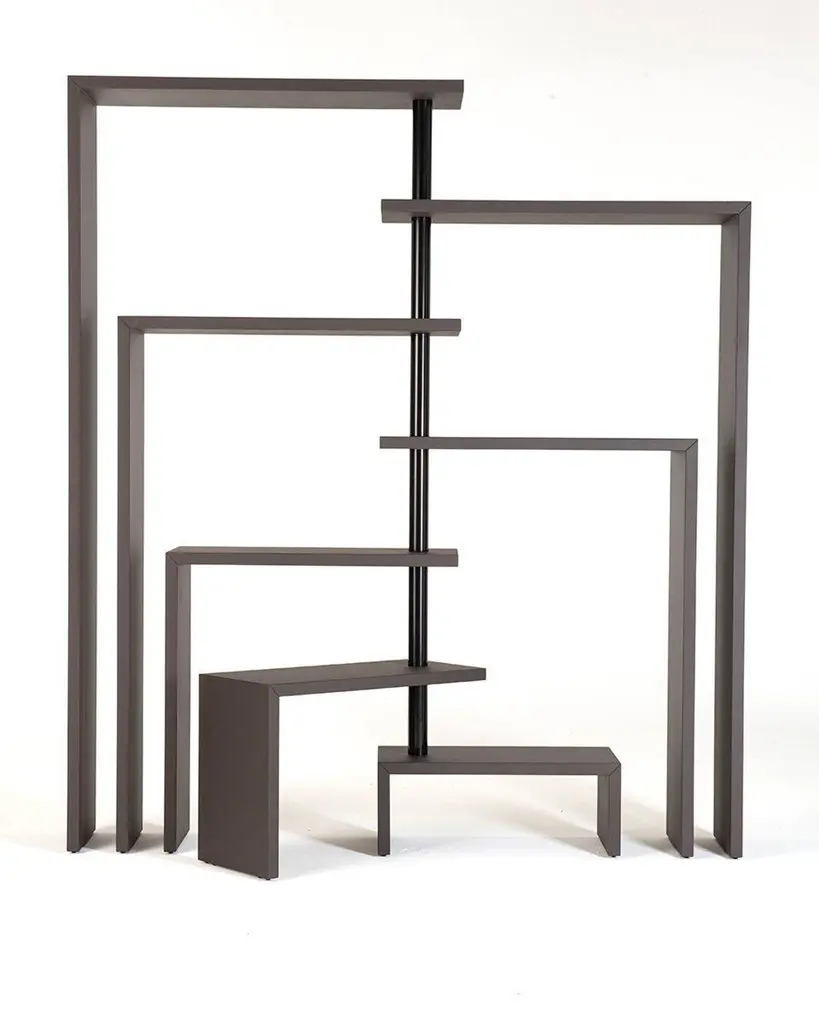 Five or seven shelves.Rotating shelf bookcase. Uprights and shelves in medium density fiberboard with internal steel corner reinforcing, finished with scratchresistant embossing in the shades talc, hemp, amaranth, espresso or black. Steel articulated joint in the shade black for the models hemp,amaranth, espresso or black or in the shade talc for the talc model. The shelf unit is available with either five or seven shelves.In designing Joy, Castiglioni realized the idea of technological and formal annihilation. Joy is a “neutral” object with a multiple role, the possible archetype of a new category. Joy’s peculiarity lies in the movement of rotating shelves realized with extreme simplicity: some horizontal shelves rotate freely around a vertical articulated column made of steel tubes. Joy is an “invention object” by one of the most influential masters of Italian Design.A "rotating shelf unit", hard to pigeonhole, which once again established a new typological record. A seemingly simple object made of six "overturned L-shaped" elements and a low supporting element that functions as a base for metal joints on with shelves are mounted.