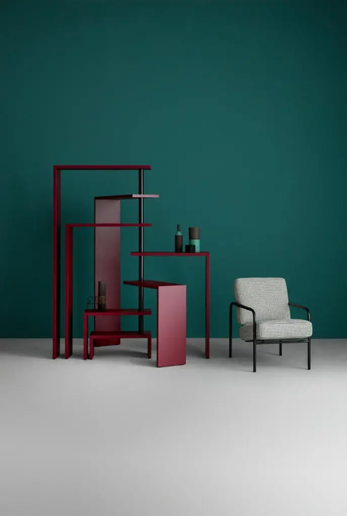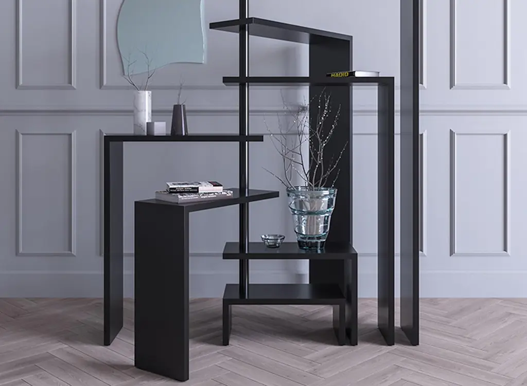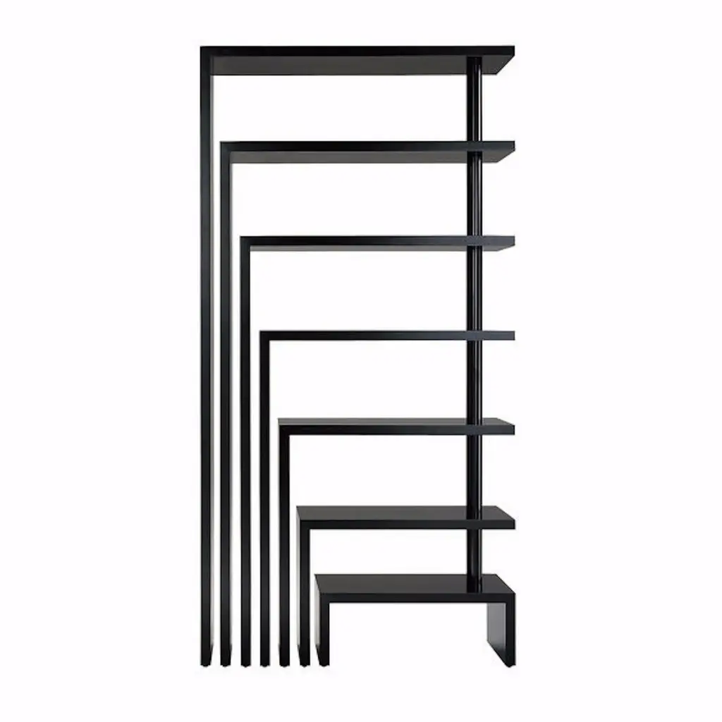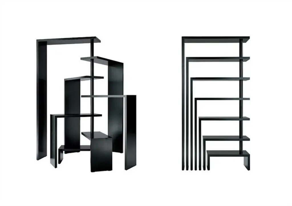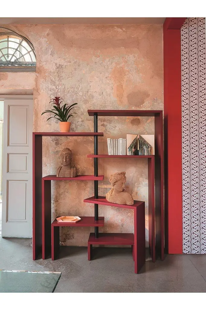 Five or seven shelves.Rotating shelf bookcase. Uprights and shelves in medium density fiberboard with internal steel corner reinforcing, finished with scratchresistant embossing in the shades talc, hemp, amaranth, espresso or black. Steel articulated joint in the shade black for the models hemp,amaranth, espresso or black or in the shade talc for the talc model. The shelf unit is available with either five or seven shelves.In designing Joy, Castiglioni realized the idea of technological and formal annihilation. Joy is a “neutral” object with a multiple role, the possible archetype of a new category. Joy’s peculiarity lies in the movement of rotating shelves realized with extreme simplicity: some horizontal shelves rotate freely around a vertical articulated column made of steel tubes. Joy is an “invention object” by one of the most influential masters of Italian Design.A "rotating shelf unit", hard to pigeonhole, which once again established a new typological record. A seemingly simple object made of six "overturned L-shaped" elements and a low supporting element that functions as a base for metal joints on with shelves are mounted.