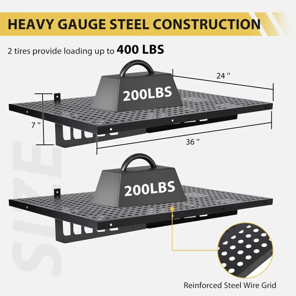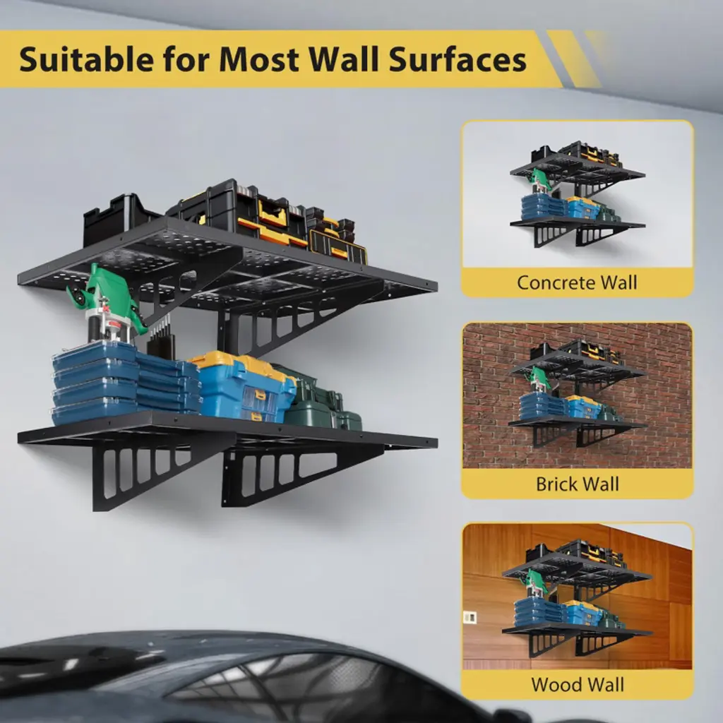 Heavy-Duty Wall Mount Shelving Unit – 300-560 lb Capacity Per ShelfMaximize your storage space without sacrificing floor area with this industrial-strength wall mount shelving unit. Engineered with a reinforced 14-gauge steel frame and a hybrid punch-plate design, this rack delivers exceptional durability and a massive weight capacity of 300 to 560 pounds per shelf, depending on the model. Its smart vertical configuration is ideal for garages, warehouses, and utility rooms, providing secure and organized storage for everything from heavy tools and automotive parts to bulk supplies. The wall-mounted design keeps your floor clear, simplifying cleaning and maximizing usable space in any environment.Key Features:Exceptional Weight Capacity & Durability: Built to handle heavy-duty storage needs, each shelf supports between 300 and 560 pounds. The robust construction features a reinforced 14-gauge steel frame and a hybrid punch-plate with wire mesh design, ensuring long-lasting strength and stability for industrial and commercial applications.Space-Saving Vertical Design: Optimize your floor plan with this efficient wall-mounted system. The unit features a compact 36-inch depth and 24-inch width, designed to fit standard wall stud spacing. Its vertical storage configuration and modular expandable design make it perfect for organizing a variety of items without consuming valuable floor space.Secure and Contained Storage: Keep your items safely stored with integrated security features. Each shelf includes 1.5-inch raised lip edges to prevent items from sliding off. The anti-slip surface texture and included earthquake-resistant mounting hardware provide added stability, while four utility hooks offer additional hanging storage for tools and accessories.Tool-Free, Quick Assembly: Get your storage solution up and running in under 30 minutes with the user-friendly, tool-free assembly system. The unit comes with a pre-drilled, bolt-together design and a complete hardware kit, requiring no welding or special tools for a straightforward and hassle-free setup.Versatile Multi-Purpose Application: This shelving unit is adaptable to countless storage and organizational needs. It is perfectly suited for storing up to four standard tires, organizing workshop tools, managing warehouse inventory, or serving as a product display rack in a retail environment.Specifications:Frame Material: 14-Gauge Powder-Coated SteelShelf Design: Punch Plate and Wire Mesh HybridMounting Type: Wall-Mounted (Requires Wood Studs)Weight Capacity: 300 - 560 lbs per Shelf (Model Dependent)Unit Footprint: 36" D x 24" WFinish: Rust-Resistant Epoxy CoatingIncluded Accessories: (4) Utility Hooks, Mounting Hardware Kit