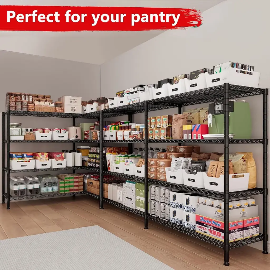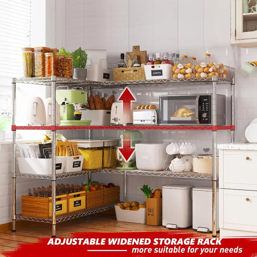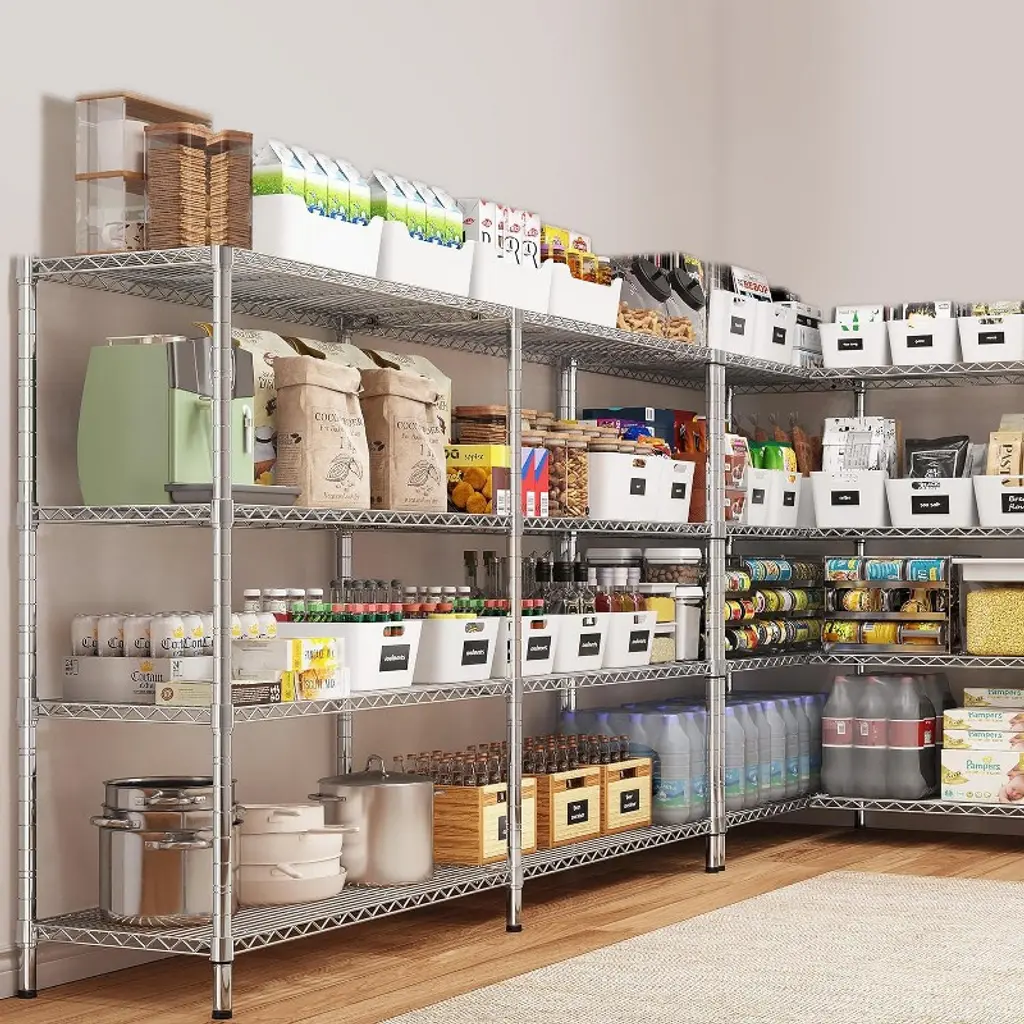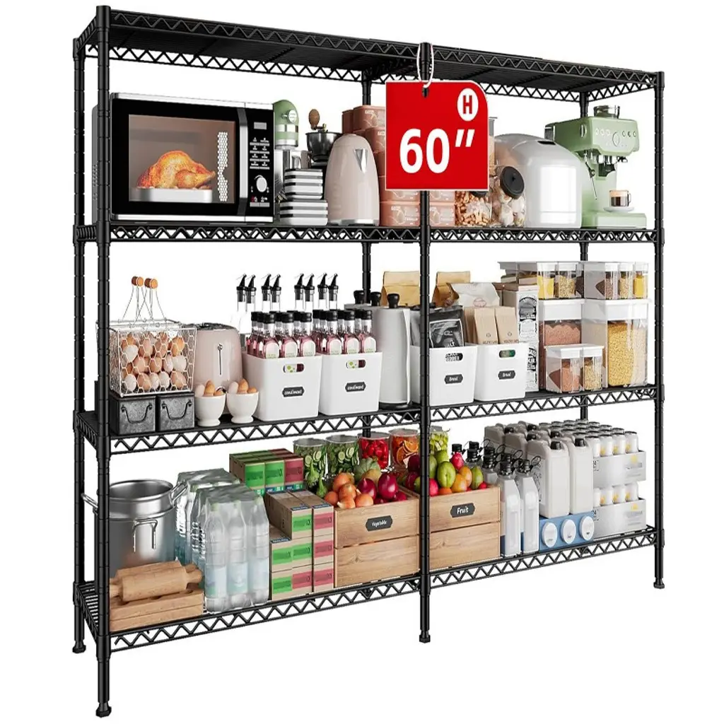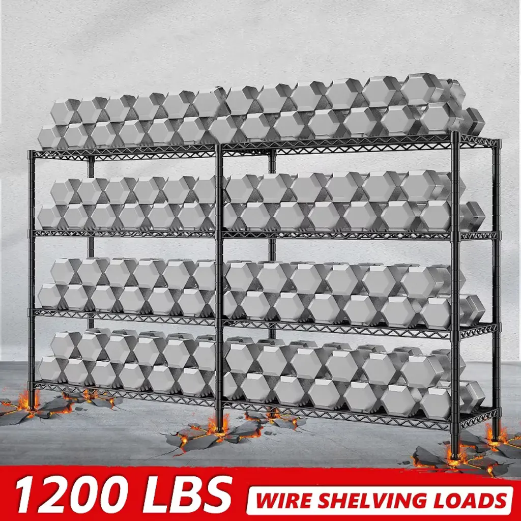 Heavy Duty Storage Shelves Load 1200LBS, Metal Shelving 4-tier Wire Shelving Unit Metal Shelves for Storage Adjustable Garage Shelving for Pantry Kitchen Garage Commercial school 60" W x 14" D x 60" H Product Description: Material: Metal Mounting Type: Floor Mount Shelf Type: Metal Shape: Rectangular Number of Shelves: 8 Product Dimensions: 14"D x 60"W x 60"H Finish Type: Powder Coated WIRE SHELVING LOADS: 1200 LBS Room Type: Kitchen, Garage, Basement, Living Room, Laundry, Pantry, Home, Industrial, Stores Special Feature: Heavy Duty, Adjustable, 4 Tier Wire Shelving Unit, Metal Shelving, Space Saving, Leveling/Corner Mounting Assembly Required: Yes Product Feature: DIY STORAGE SHELVES ACCORDING TO DIFFRENT NEEDS: H-SHAPED storage rack--60”X14”X60”; L-SHAPED wire shelving rack--16”X14”X60”+30”X14”X60” Perfect for your pantry:This metal shelf offers large capacity and strong load-bearing capability, meeting all your diverse pantry storage needs. ADJUSTABLE WIDENED STORAGE RACK: This heavy duty metal shelves can adjust from up and down, the DIY design can be more suitable for your needs. Upgrades Durable All Metal wire shelving: Heavy Duty Wire Shelving: High Quality Wire Shelving Rack; Thickened Pole: good load-bearing come from good materials. Remove the metal mesh, you can put something higher. Transform your storage space with this Heavy Duty 4-Tier Metal Wire Shelving Unit engineered to support up to 1200 lbs per shelf with evenly distributed weight. Measuring 60"W × 14"D × 60"H, this industrial-strength storage solution features adjustable shelf heights and versatile DIY configuration options including H-shaped and L-shaped layouts. Constructed from premium-grade metal with rust-resistant coating, this shelving unit delivers exceptional durability for pantries, kitchens, garages, commercial spaces, and schools. The innovative wire mesh design promotes optimal airflow while preventing dust accumulation, making it perfect for storing everything from heavy tools and equipment to pantry supplies and office materials.