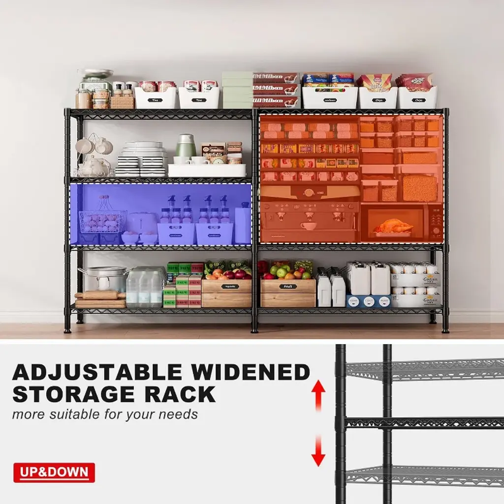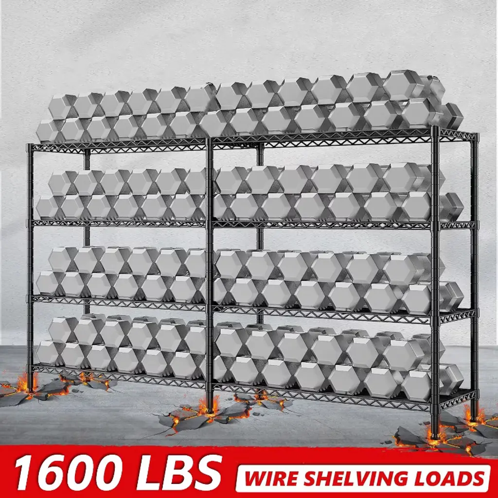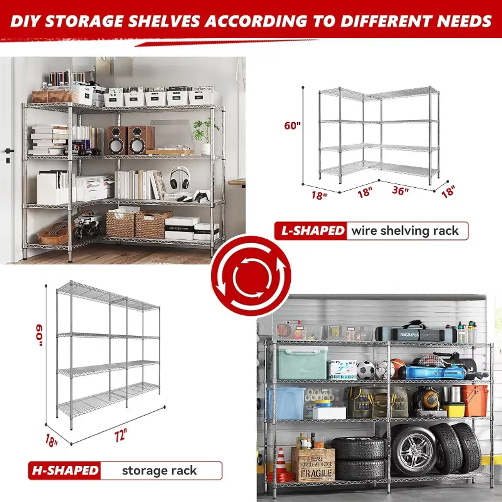 Heavy Duty Storage Shelves Load 1600LBS, Metal Shelving 4-tier Wire Shelving Unit Metal Shelves for Storage Adjustable Garage Shelving for Pantry Kitchen Garage Commercial school 72" W x 18" D x 60" H Product Description: Material: Metal Mounting Type: Floor Mount Shelf Type: Metal Shape: Rectangular Number of Shelves: 8 Product Dimensions: 18"D x 72"W x 60"H Finish Type: Powder Coated WIRE SHELVING LOADS: 1600 LBS Room Type: Kitchen, Garage, Basement, Living Room, Laundry, Pantry, Home, Industrial, Stores Special Feature: Heavy Duty, Adjustable, 4 Tier Wire Shelving Unit, Metal Shelving, Space Saving, Leveling/Corner Mounting Assembly Required: Yes Product Feature: DIY STORAGE SHELVES ACCORDING TO DIFFRENT NEEDS: H-SHAPED storage rack--60”X18”X72”; L-SHAPED wire shelving rack--36”X18”X60”+18”X18”X60” Perfect for your pantry:This metal shelf offers large capacity and strong load-bearing capability, meeting all your diverse pantry storage needs. ADJUSTABLE WIDENED STORAGE RACK: This heavy duty metal shelves can adjust from up and down, the DIY design can be more suitable for your needs. Upgrades Durable All Metal wire shelving: Heavy Duty Wire Shelving: High Quality Wire Shelving Rack; Thickened Pole: good load-bearing come from good materials. Remove the metal mesh, you can put something higher. Maximize your storage capacity with this Heavy Duty 4-Tier Metal Wire Shelving Unit built to support an exceptional 1600 lbs total weight capacity across all shelves. Measuring an impressive 72"W × 18"D × 60"H, this extra-wide storage solution provides maximum surface area for organizing large items and bulk storage needs. Featuring reinforced metal construction with adjustable shelf heights, this industrial-strength shelving unit is perfect for pantries, kitchens, garages, commercial warehouses, and school facilities. The wire mesh design promotes excellent ventilation while maintaining structural integrity, and the tool-free assembly system allows for quick setup with flexible configuration options including H-shaped and L-shaped layouts to fit any space requirement.