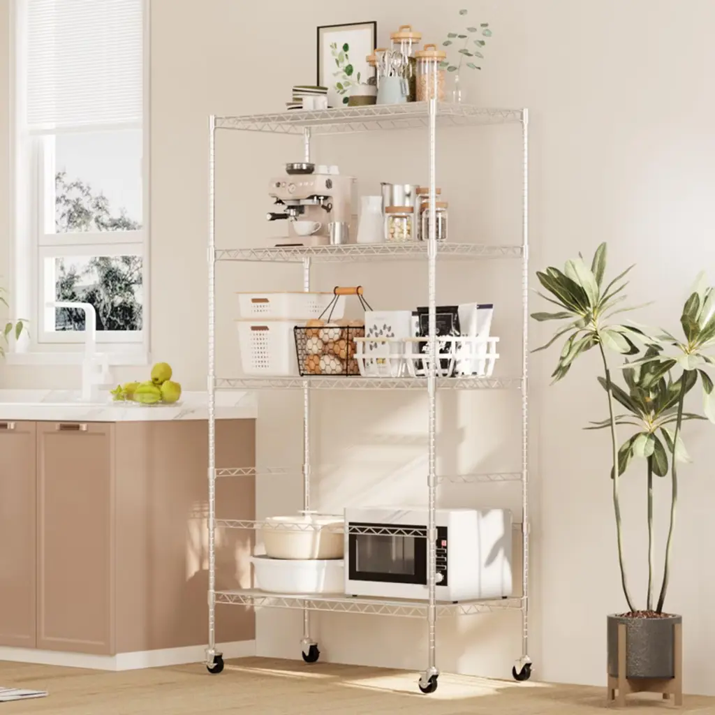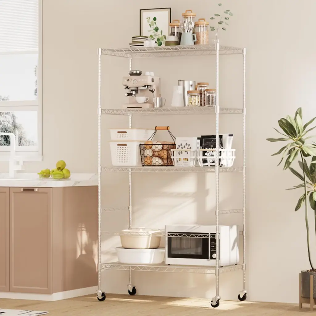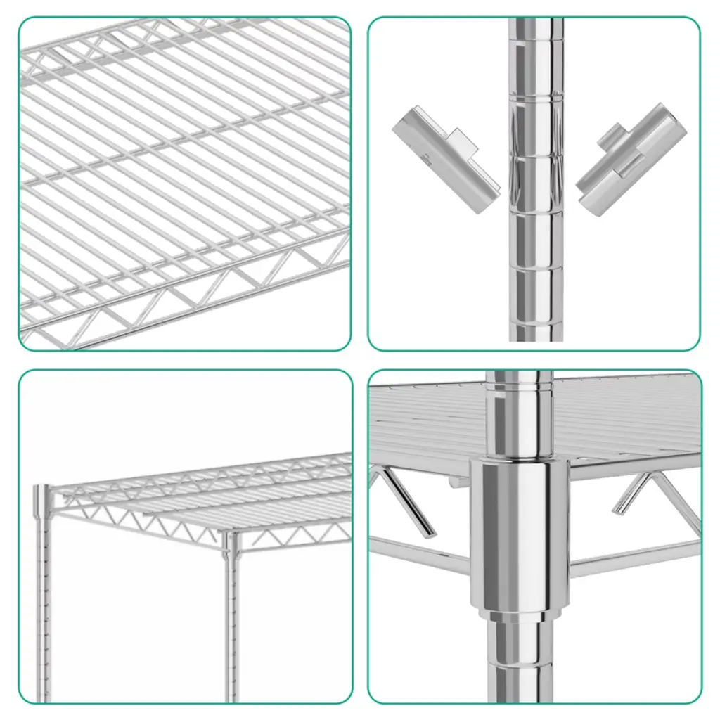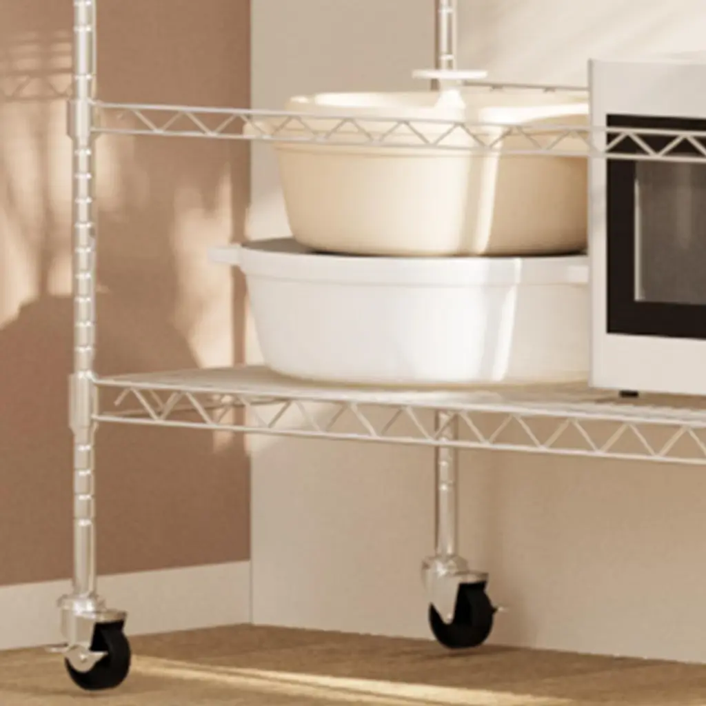 **Heavy-Duty 4-Tier Garage Shelving Unit ¨C 800lb Capacity Adjustable Metal Rack with Locking Casters** ### **Professional Features** 1. **Industrial-Strength Steel Construction** - **14-gauge steel frame** with triple-reinforced corners - **Electrostatic powder coating** (scratch/rust resistant) - **800lb total capacity** (200lb per tier dynamic load) - **1.2mm thick wire shelves** (3/8" rod spacing) 2. **Smart Height Adjustment System** - **Tool-free shelf positioning** (1" increment adjustments) - **16 height configurations** (18.9"-72" max height) - **Auto-locking shelf clips** (vibration resistant) - **Laser-etched measurement markers** 3. **Professional Mobility Package** - **4" polyurethane casters** (2 locking/2 swivel) - **360¡ã rotation** with 100lb load per wheel - **Floor protectors** (non-marking rubber treads) - **Anti-tip cross braces** 4. **Multi-Industry Adaptability** - **Garage organization** (tools/auto parts) - **Commercial kitchen storage** - **Warehouse inventory systems** - **Retail product displays** - **Industrial workbench base** 5. **Quick-Connect Assembly** - **Precision-engineered snap-lock joints** - **Color-coded components** - **15-minute estimated setup** - **Included hex tool kit** ### **Technical Specifications** - **Frame:** 1.5" square steel tubing - **Shelves:** 36"L x 6.85"W (3 U-shaped tiers) - **Coating:** 80¦Ìm epoxy-polyester hybrid - **Wheel Type:** Dual-bearing PU casters - **Certifications:** ANSI/BIFMA X5.5 compliant **Complete Package Includes:** - 5 wire shelf units - 4 heavy-duty casters - Cross support bars - Assembly toolkit - 10-year structural warranty