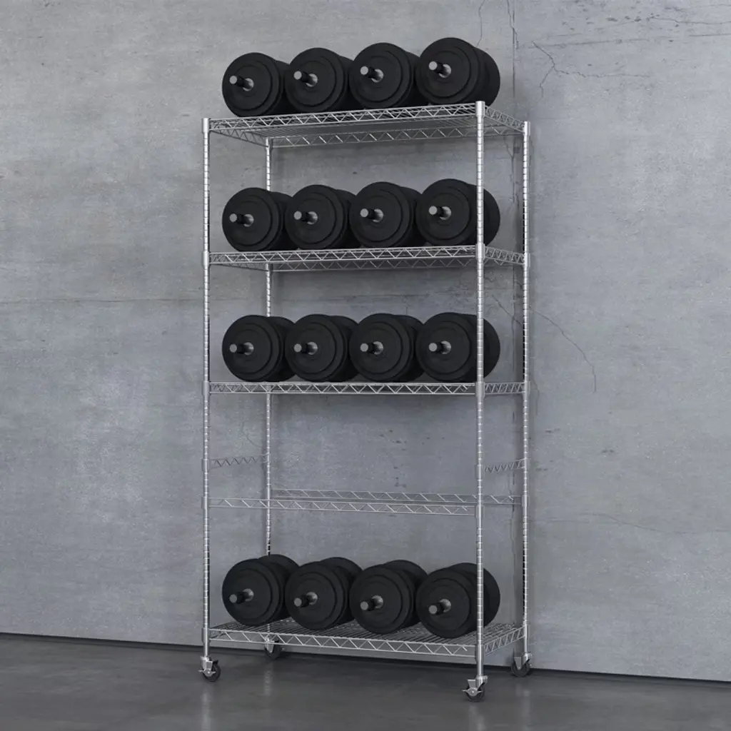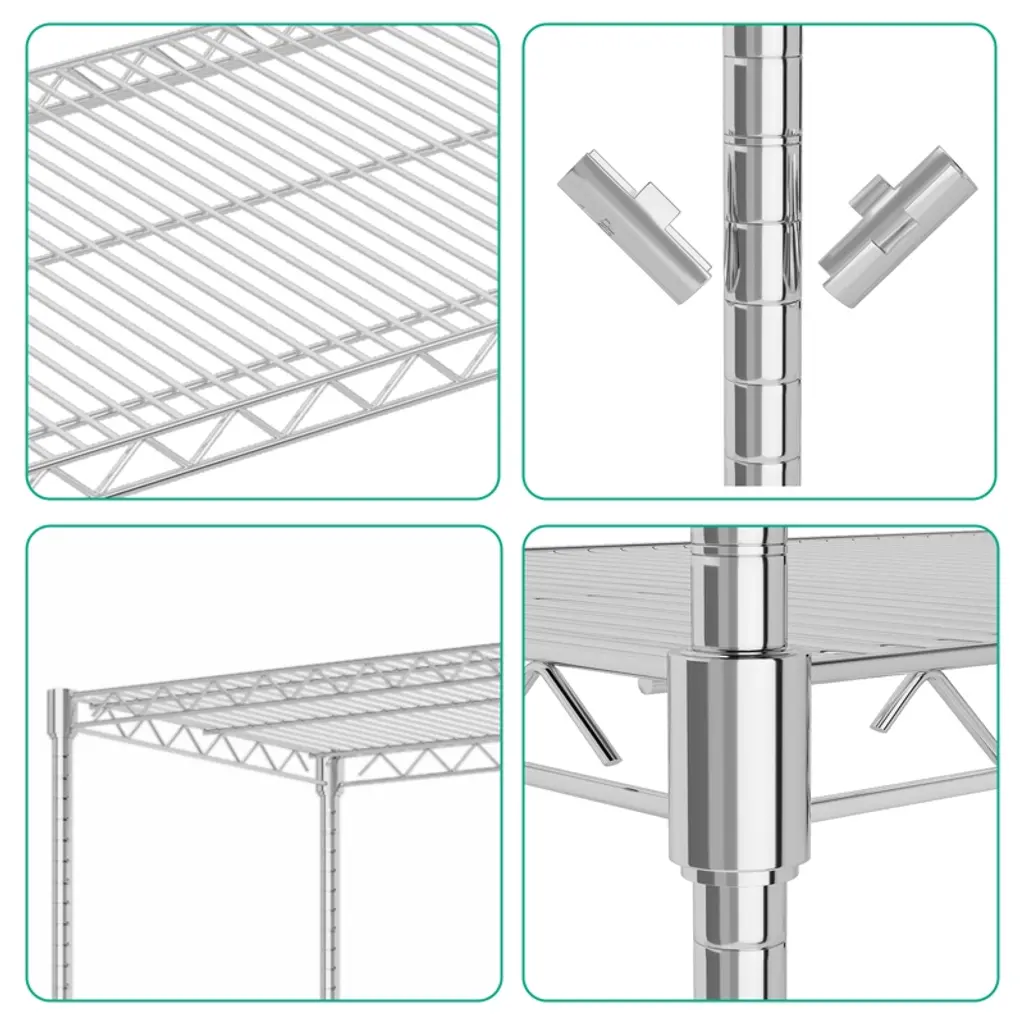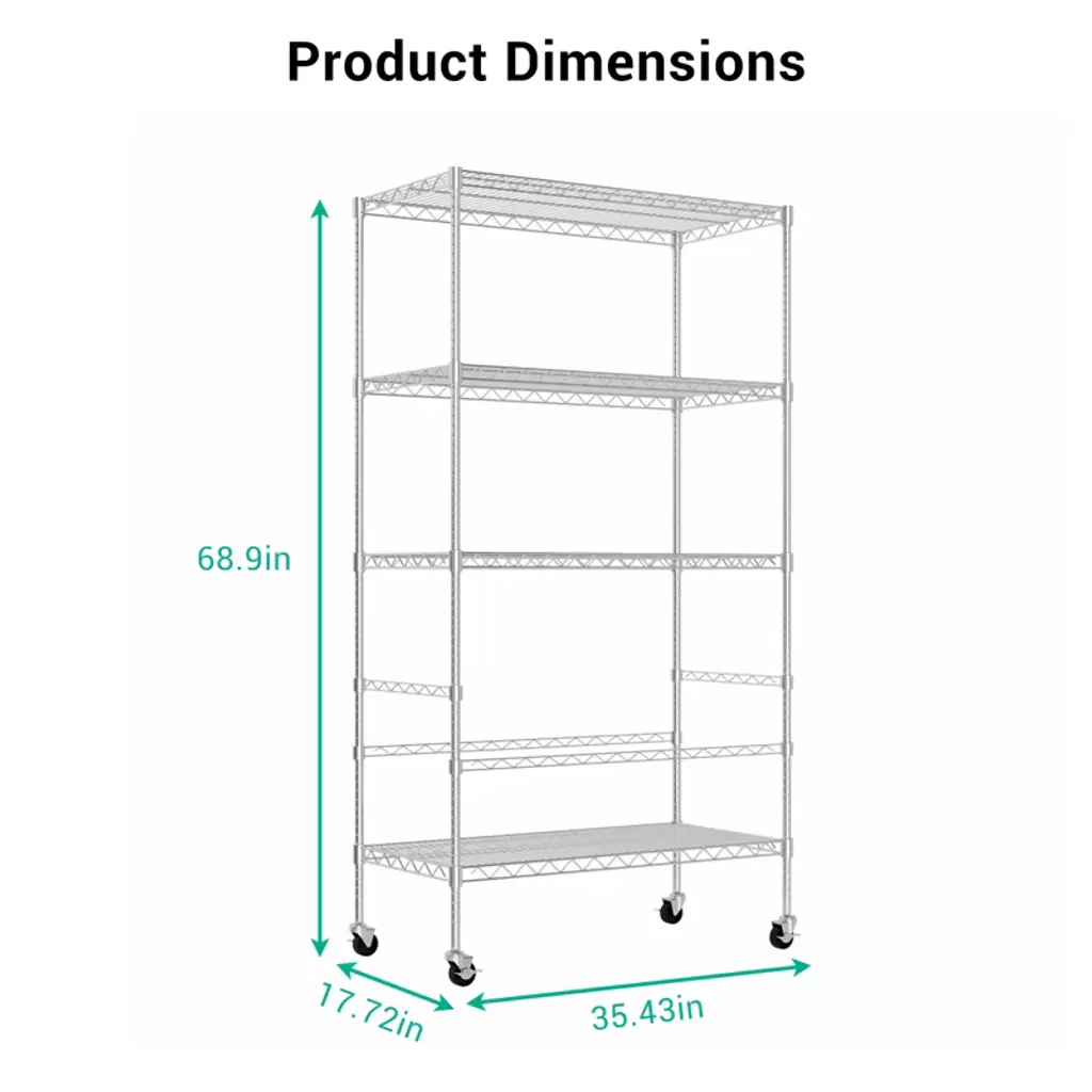 Feature:High quality material: A high-quality iron frame with a chrome-plated finish that is waterproof, rust-resistant, and scratch-resistant, supporting up to 800 lbs, making it suitable for various environments.Modern Aesthetic: Sleek and minimalist design complements contemporary interior styles, adding a touch of sophistication to any space.360° Rotating Wheels: Ensure easy mobility and stability while preventing scratches on the floor.Adjustable Shelving: Premium clips facilitate easy height adjustments, suitable for items of various sizes.Versatile Storage Solution: This adjustable wire rack is perfect for a variety of settings, including kitchens, garages, and living rooms. It accommodates tools, clothes, and books, and can also serve as a display shelf for your collections.Specification:Size: 35.43x17.72x68.9 inches Color: silverMaterial: chrome-plated ironWeight capacity: 800 lbs Package dimension: 36.22x18.90x6.81 inchesPackage weight: 48.15 lbsNote: Please carefully read the following instructions and caution warnings before assembling the product.Packing list: 4 tier storage shelves x1Installation Tool x1Assembly guide x1