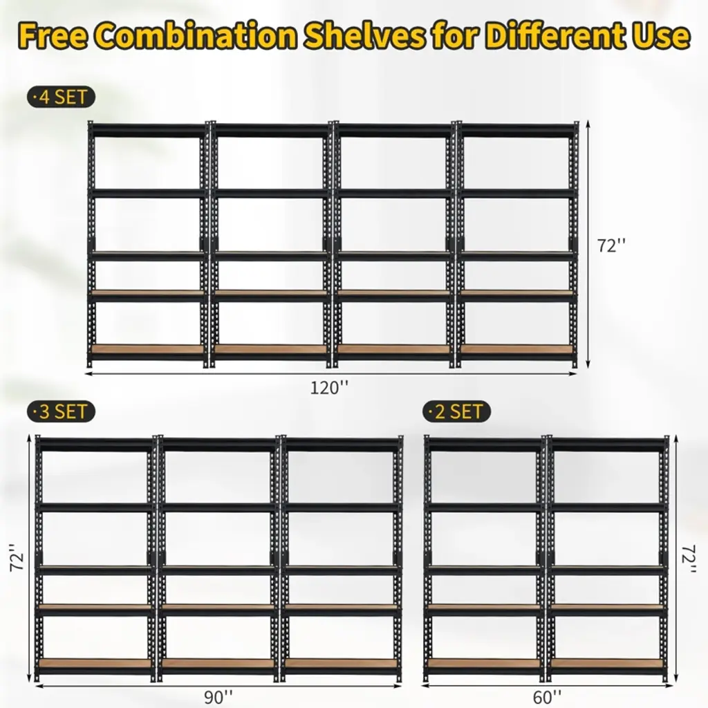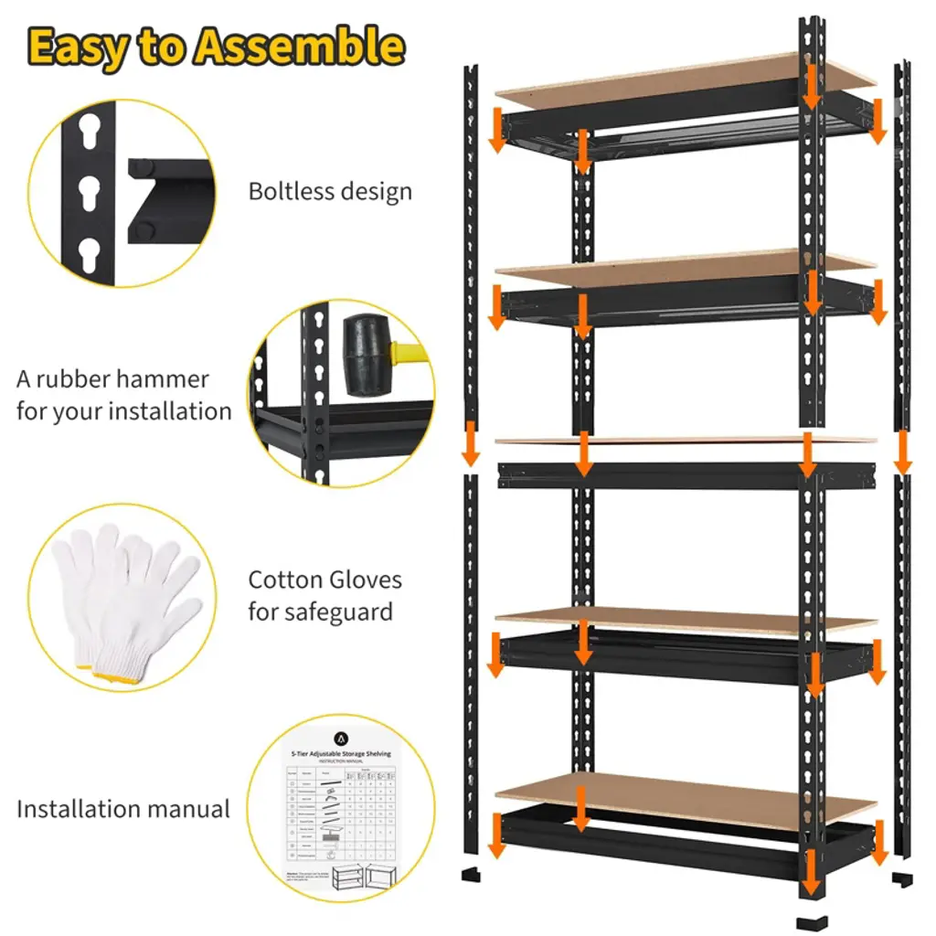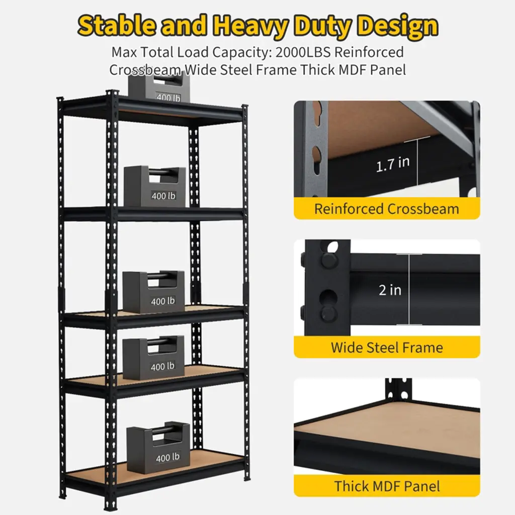 Perfect for home and commercial use, these shelves feature a durable finish that resists corrosion and wear. The versatile design makes them suitable for organizing tools, equipment, storage containers, and household supplies while maintaining easy accessibility. Create an efficient storage system with these heavy-duty shelves that maximize vertical space while supporting substantial weight loads in any environment.Maximize your organizational efficiency with our professional-grade 5-tier storage shelving unit, designed to provide exceptional storage solutions for garages, kitchens, warehouses, and pantries. Measuring 30 inches wide, 12 inches deep, and 60 inches high, this versatile shelving system offers an impressive 2000-pound weight capacity, making it ideal for storing heavy tools, equipment, pantry items, and household supplies while optimizing your available space.Constructed from high-quality commercial-grade steel, this shelving unit features reinforced frame construction and thick support beams that ensure exceptional durability and stability. The adjustable design allows each of the five tiers to be customized to different heights, accommodating items of various sizes from small storage bins to large equipment. The bolt-free assembly system enables quick setup in minutes using only the included rubber hammer, requiring no additional tools or hardware.Four protective rubber pads on the base provide excellent stability while preventing floor scratches and protecting your surfaces. The open design allows for easy access to stored items and better visibility, while the compact footprint makes it perfect for tight spaces. The versatile size fits perfectly in garages for tool storage, kitchens for pantry organization, warehouses for inventory management, and closets for household items.
