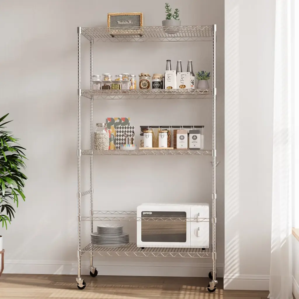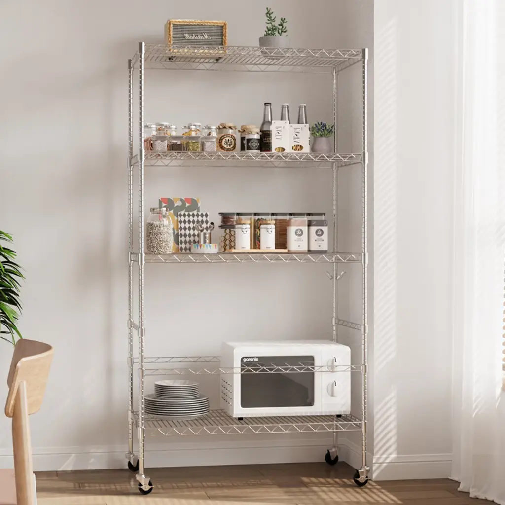 Our 5-tier wire rack measures 35.43L x 17.72W x 68.9H inches, providing convenient storage space to keep your items organized and easily accessible, for boxes, appliances, kitchen supplies, books, clothes or Anything you need organized. The storage racks are made from strong, durable steel wire that is rust and oxidation resistant ensuring long-lasting use, making them perfect for garages, laundry rooms, kitchens, playrooms, or other living or work spaces. The metal rack has 5 height-adjustable shelves, which can store different items. You can customize the placement of the shelves according to your needs. The height adjustment of the shelves can be completed by moving the clips up and down. The metal shelving unit is equipped with 4 casters, including 2 fixed locks, it can be fixed or moved at any time, move the wire shelf to wherever you want, and lock the wheels when it reaches the location, ensuring that there will be no With extra movement, you can rearrange the space easily. Our rolling racks are an ideal storage solution for heavy-duty commercial or home storage, metal racks are suitable for storage rooms, kitchens, bathrooms, living rooms, warehouses, offices, industrial or commercial exhibitions, hotels, supermarkets and more.