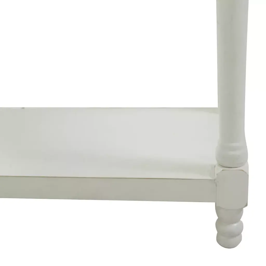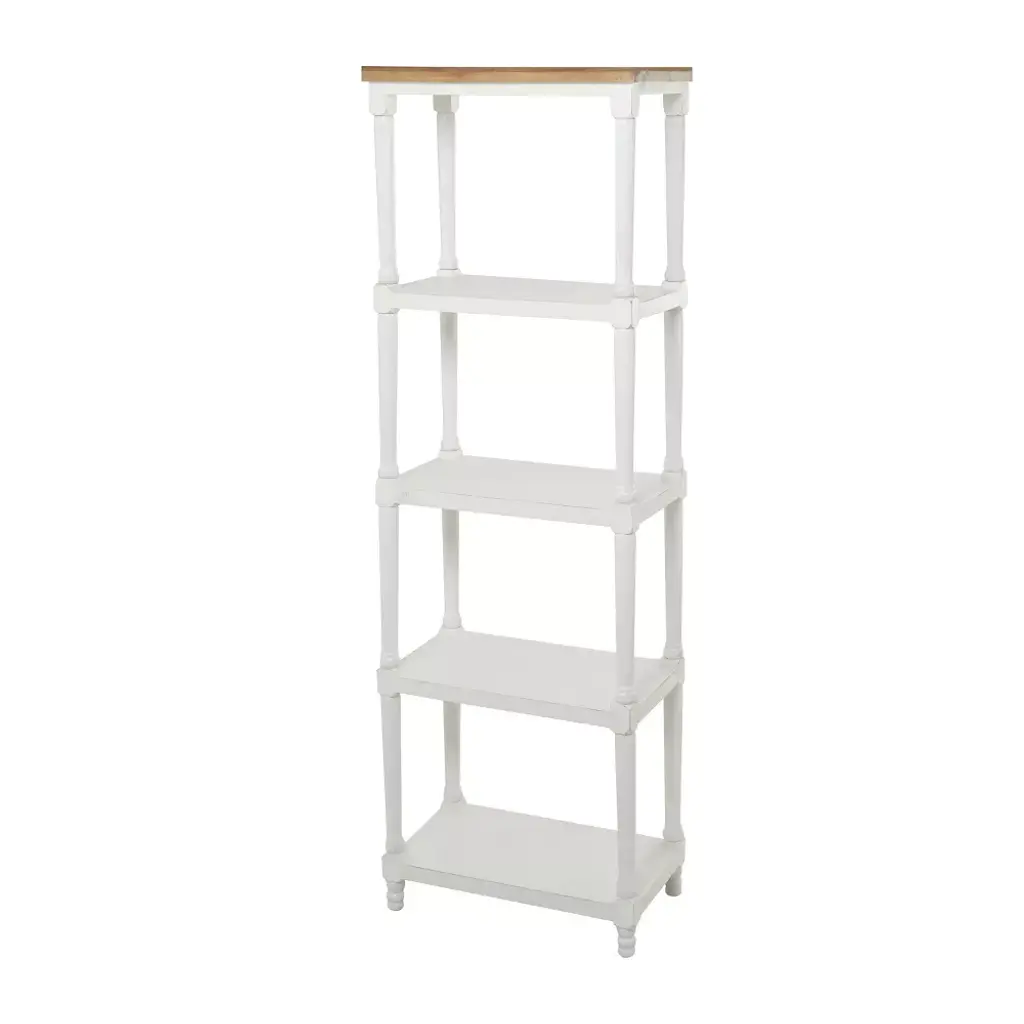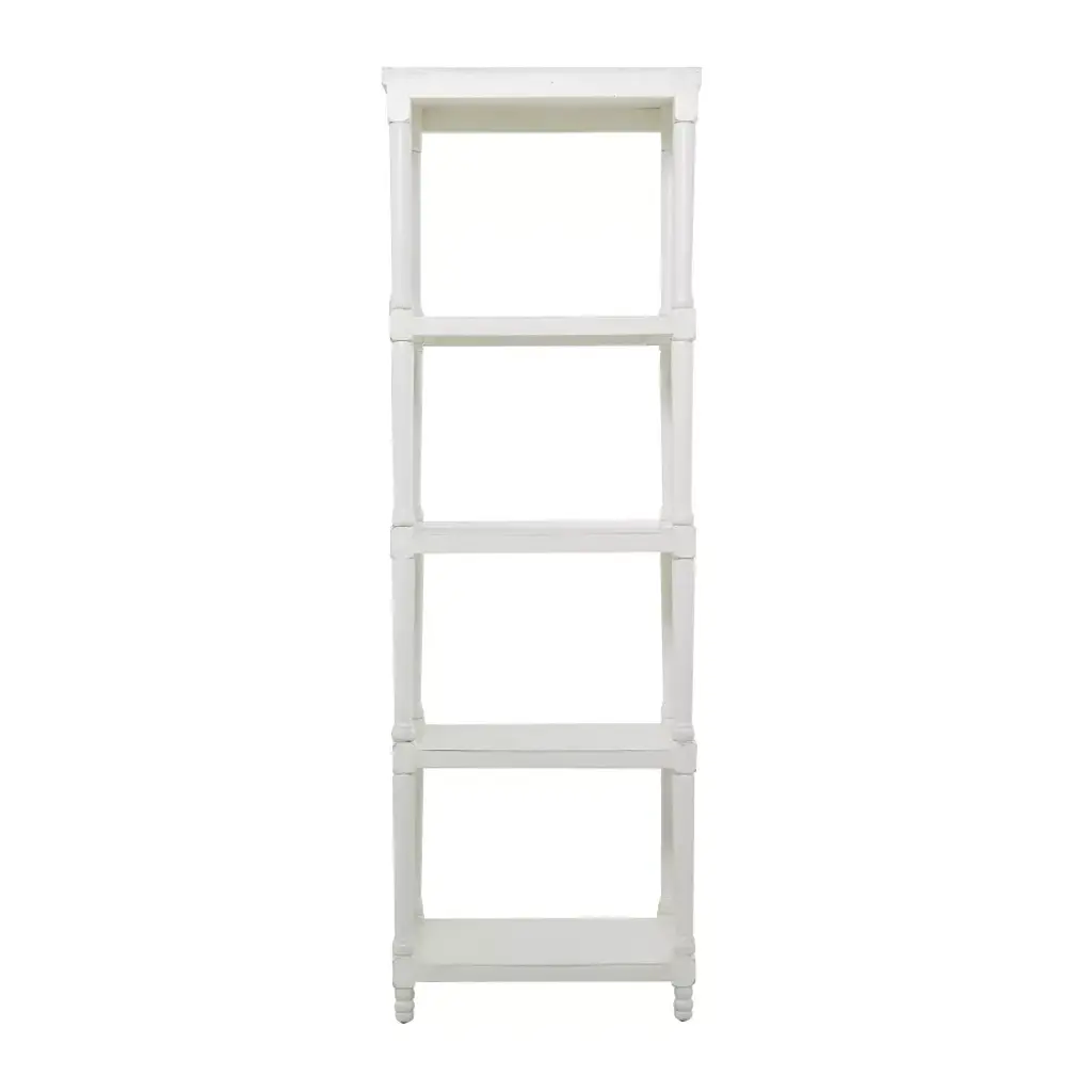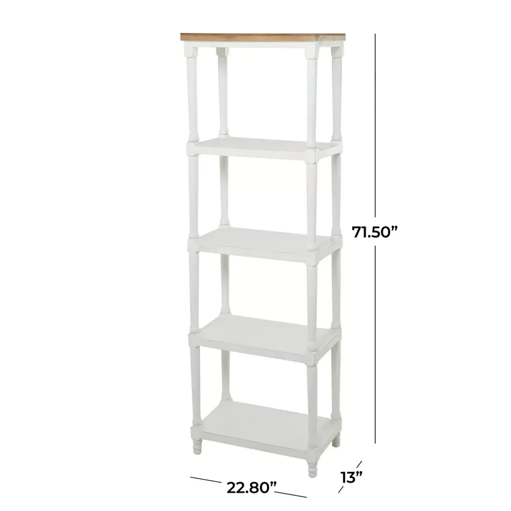 Keep a clutter free home with this durable and expertly crafted shelving unit. Display your favorite books, photos, and memorabilia with style with this shelving unit. Display your books, home decorative or organize your belongings with this farmhouse wooden shelf for a chic and convenient addition to your home space. Designed with felt or rubber stoppers at the base that prevent scratching furniture and table tops, as well as sliding around. This item ships in 1 carton. Suitable for indoor use only. This item ships fully assembled in one piece. Maximum weight limit is 30 lbs. This is a single white colored display shelf. Wood shelving unit features 5 shelves. Farmhouse style.