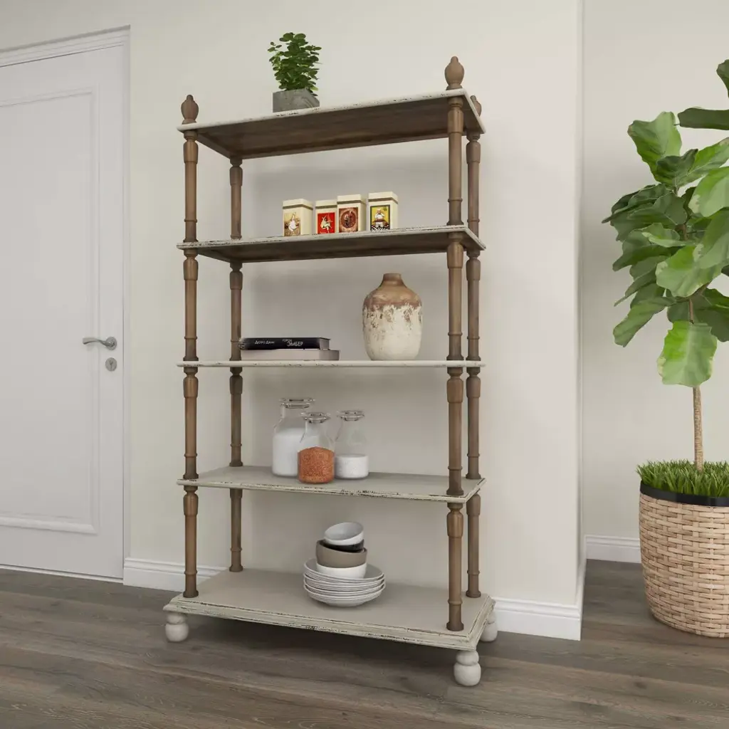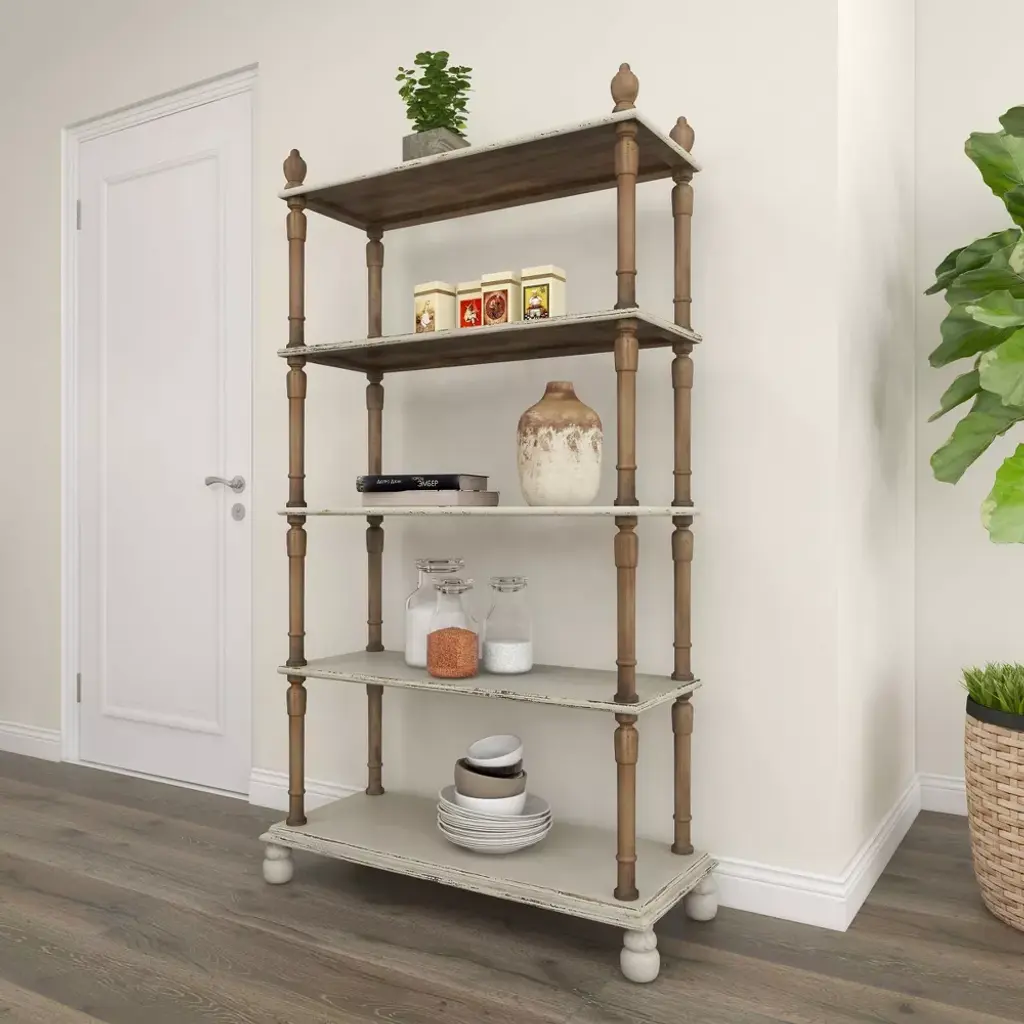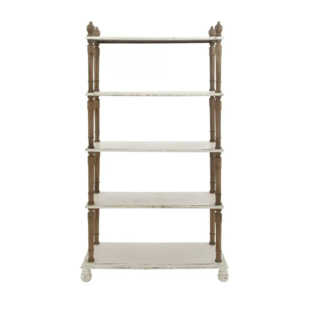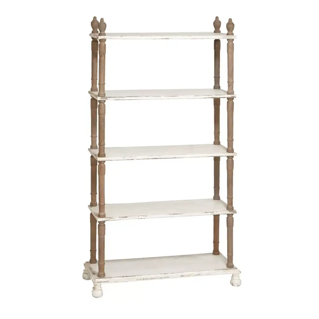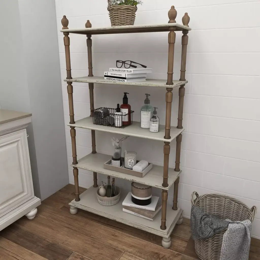 Farmhouse wood shelf is perfect for maximizing your floor space with additional storage and will complement any rustic style dining space. Designed with felt or rubber stoppers at the base that prevent scratching furniture and table tops, as well as sliding around. This item ships in 1 carton. Comes with four posts with finials and ball feet. Suitable for indoor use only. Some assembly required. Maximum weight limit is 30 lbs. This is a single white colored display shelf. Fir shelving unit features 5 shelves. Farmhouse style.