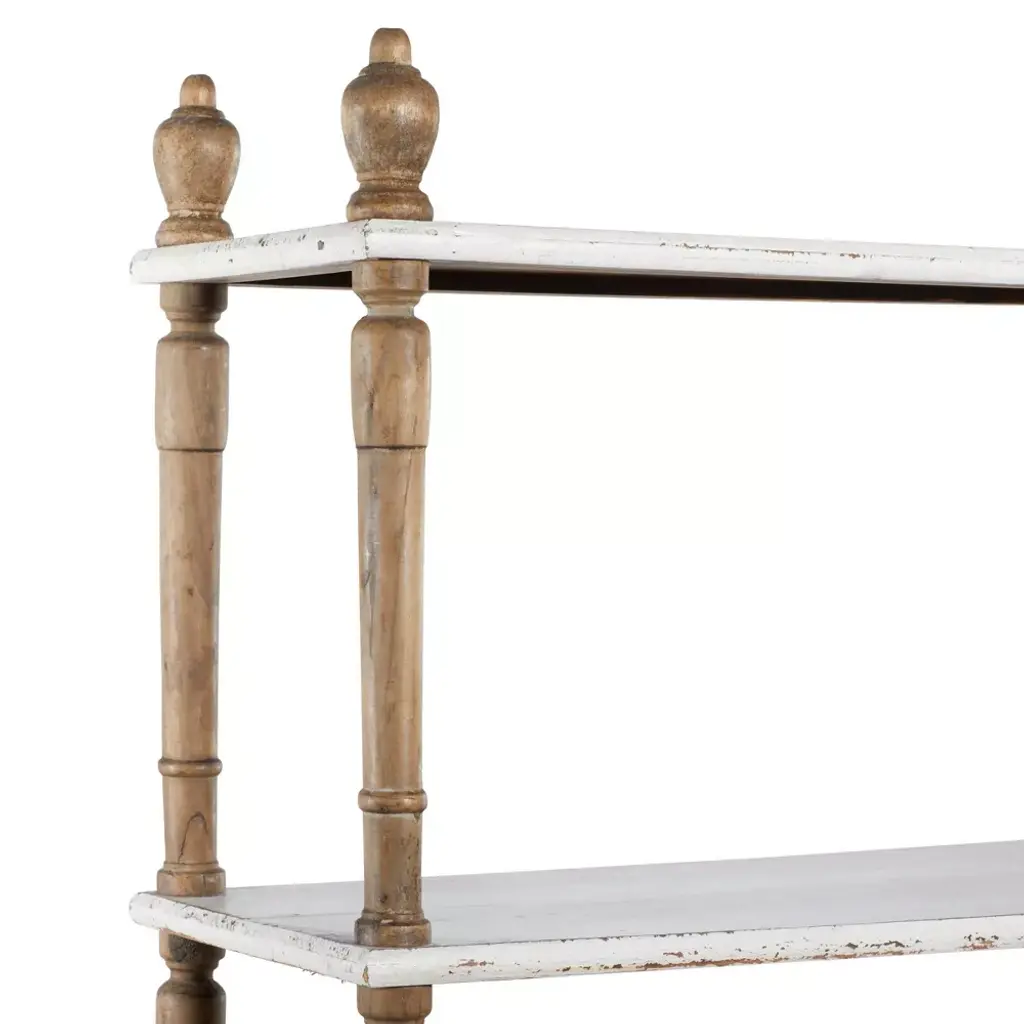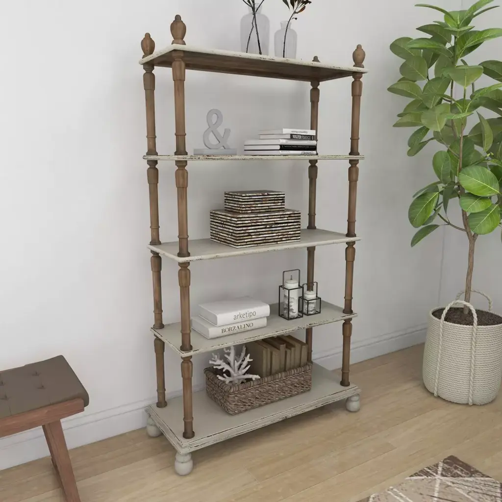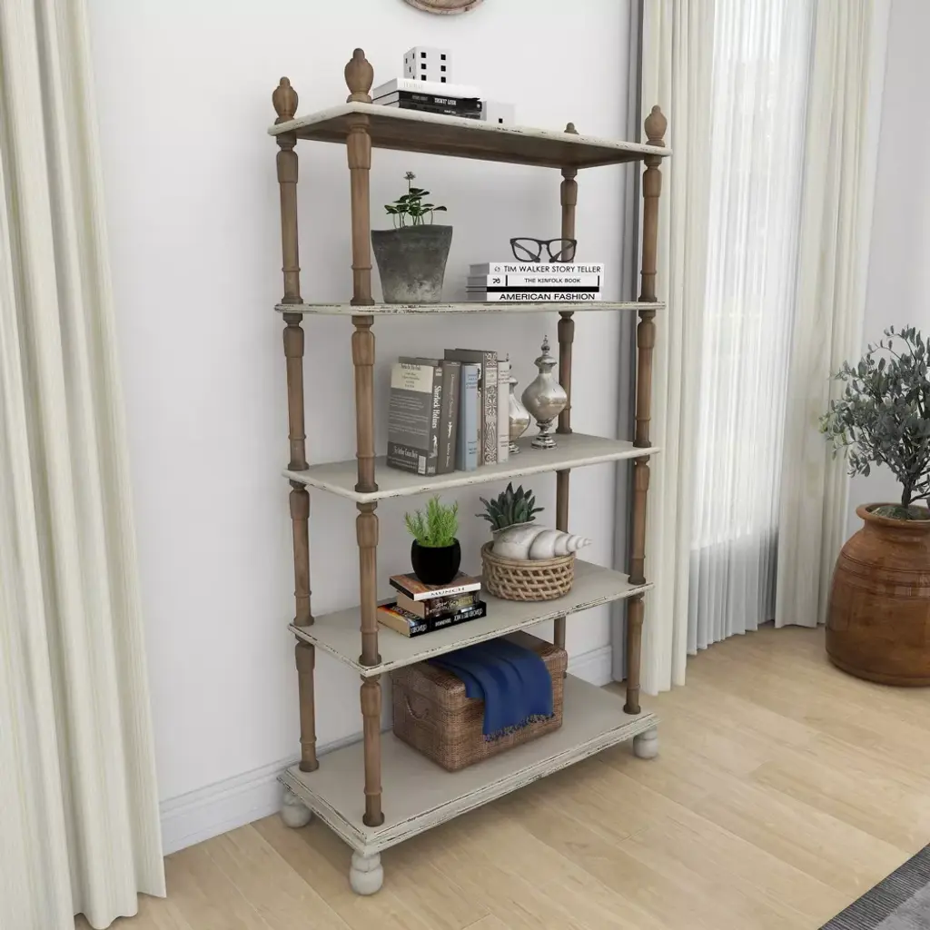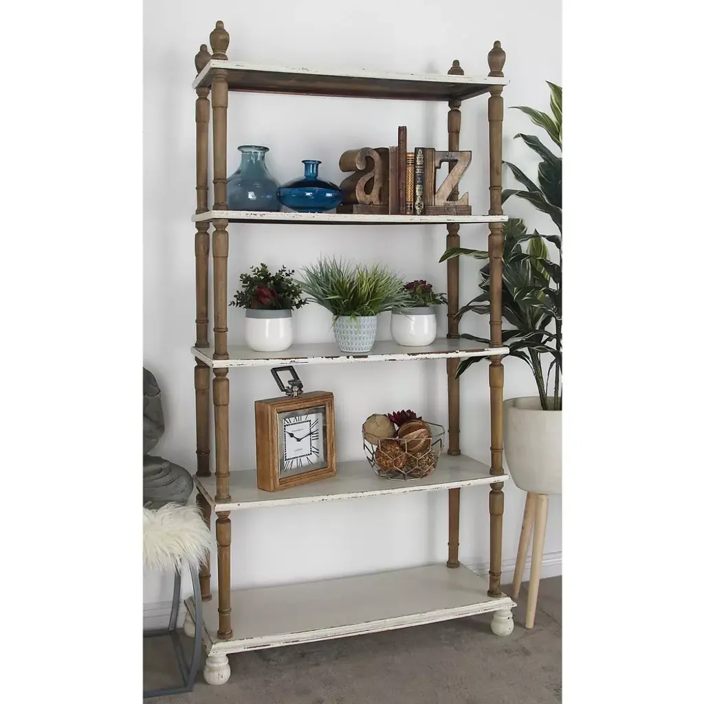 Farmhouse wood shelf is perfect for maximizing your floor space with additional storage and will complement any rustic style dining space. Designed with felt or rubber stoppers at the base that prevent scratching furniture and table tops, as well as sliding around. This item ships in 1 carton. Comes with four posts with finials and ball feet. Suitable for indoor use only. Some assembly required. Maximum weight limit is 30 lbs. This is a single white colored display shelf. Fir shelving unit features 5 shelves. Farmhouse style.