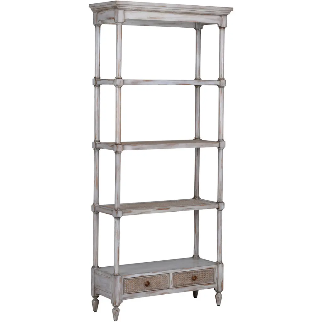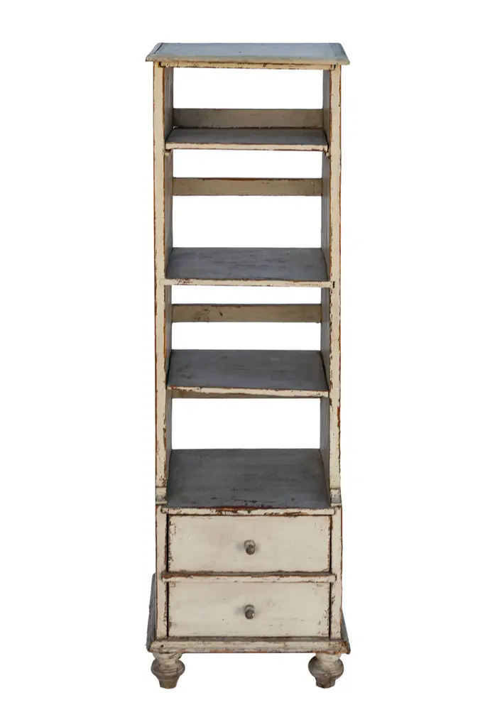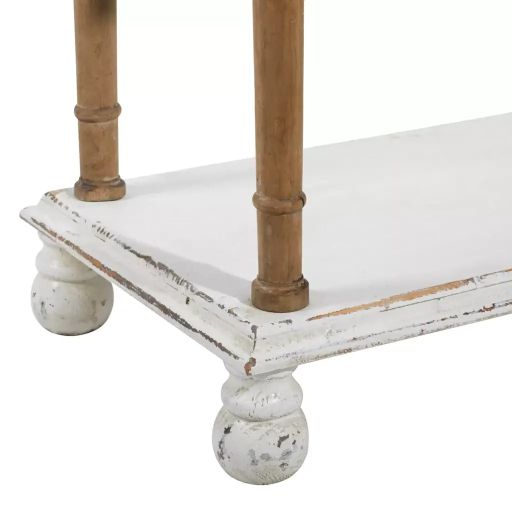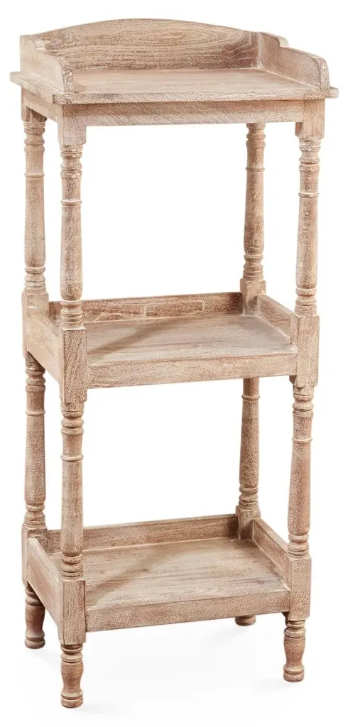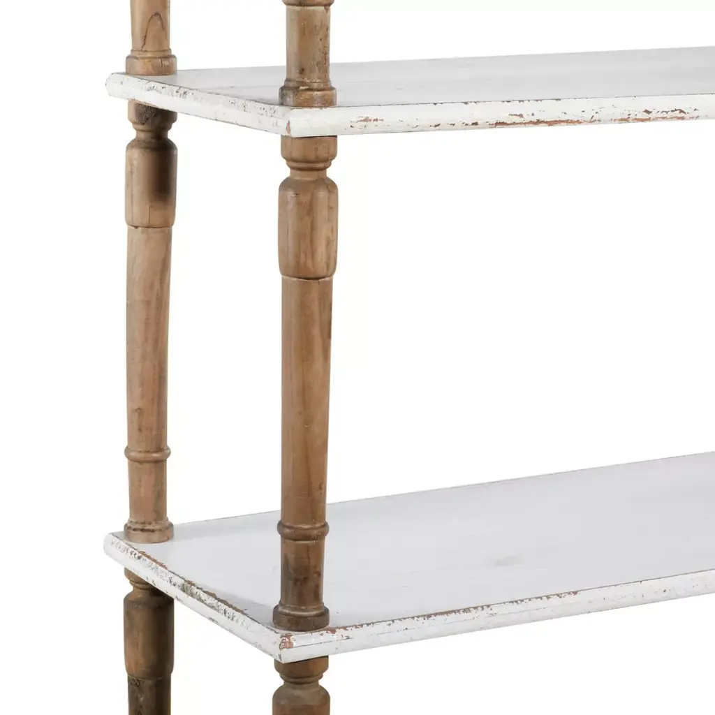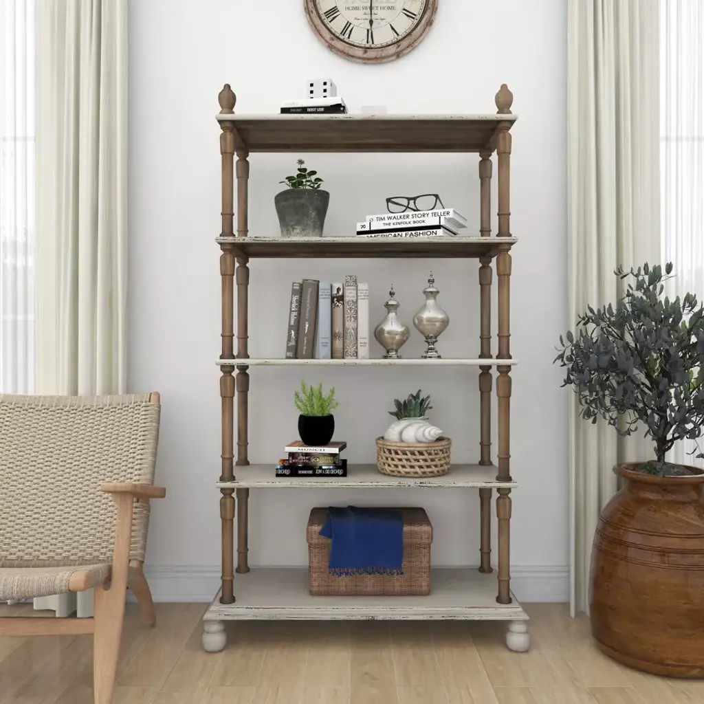 Farmhouse wood shelf is perfect for maximizing your floor space with additional storage and will complement any rustic style dining space. Designed with felt or rubber stoppers at the base that prevent scratching furniture and table tops, as well as sliding around. This item ships in 1 carton. Comes with four posts with finials and ball feet. Suitable for indoor use only. Some assembly required. Maximum weight limit is 30 lbs. This is a single white colored display shelf. Fir shelving unit features 5 shelves. Farmhouse style.